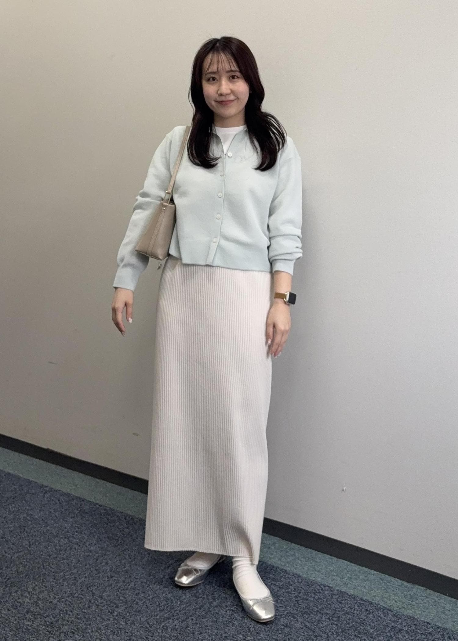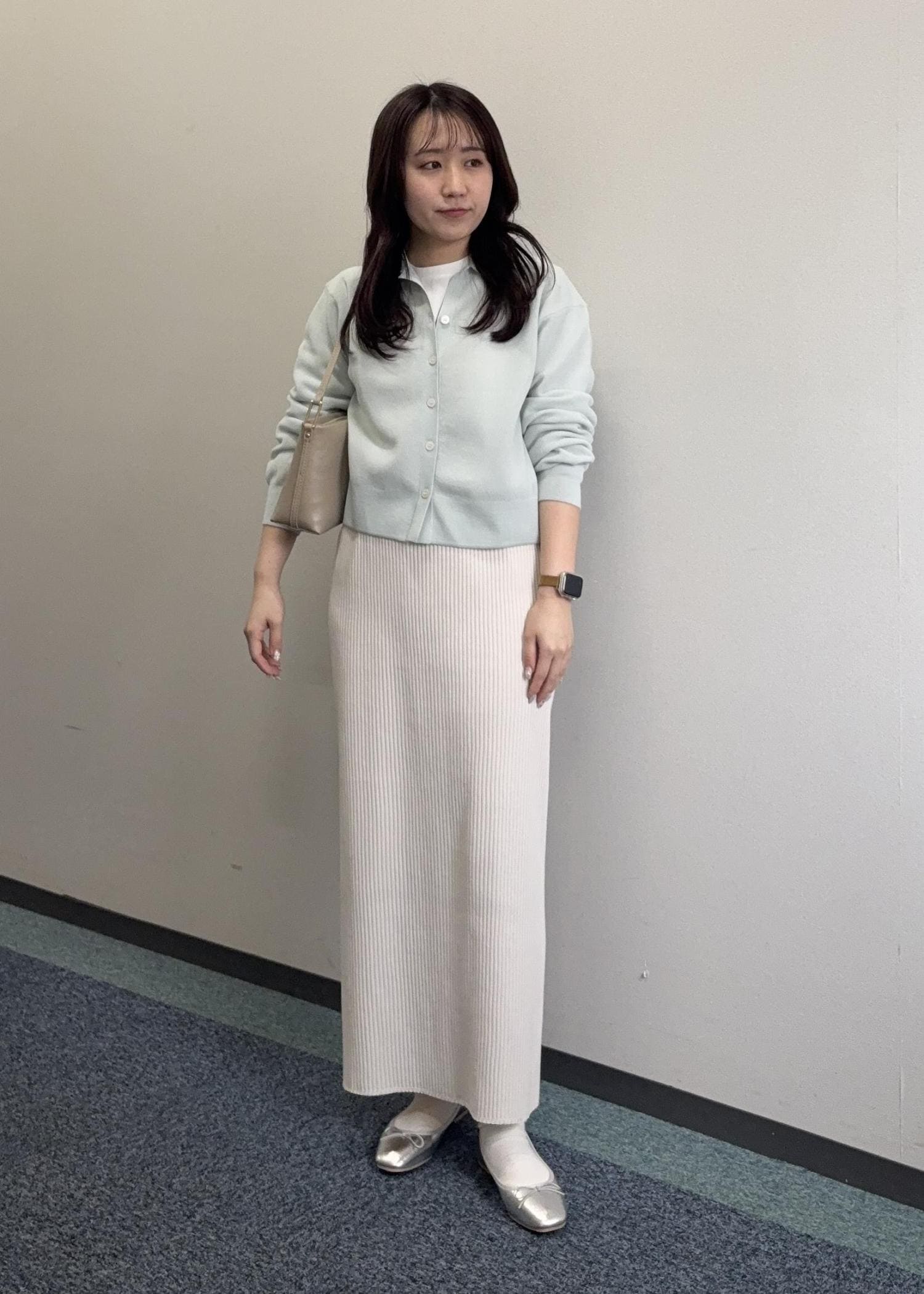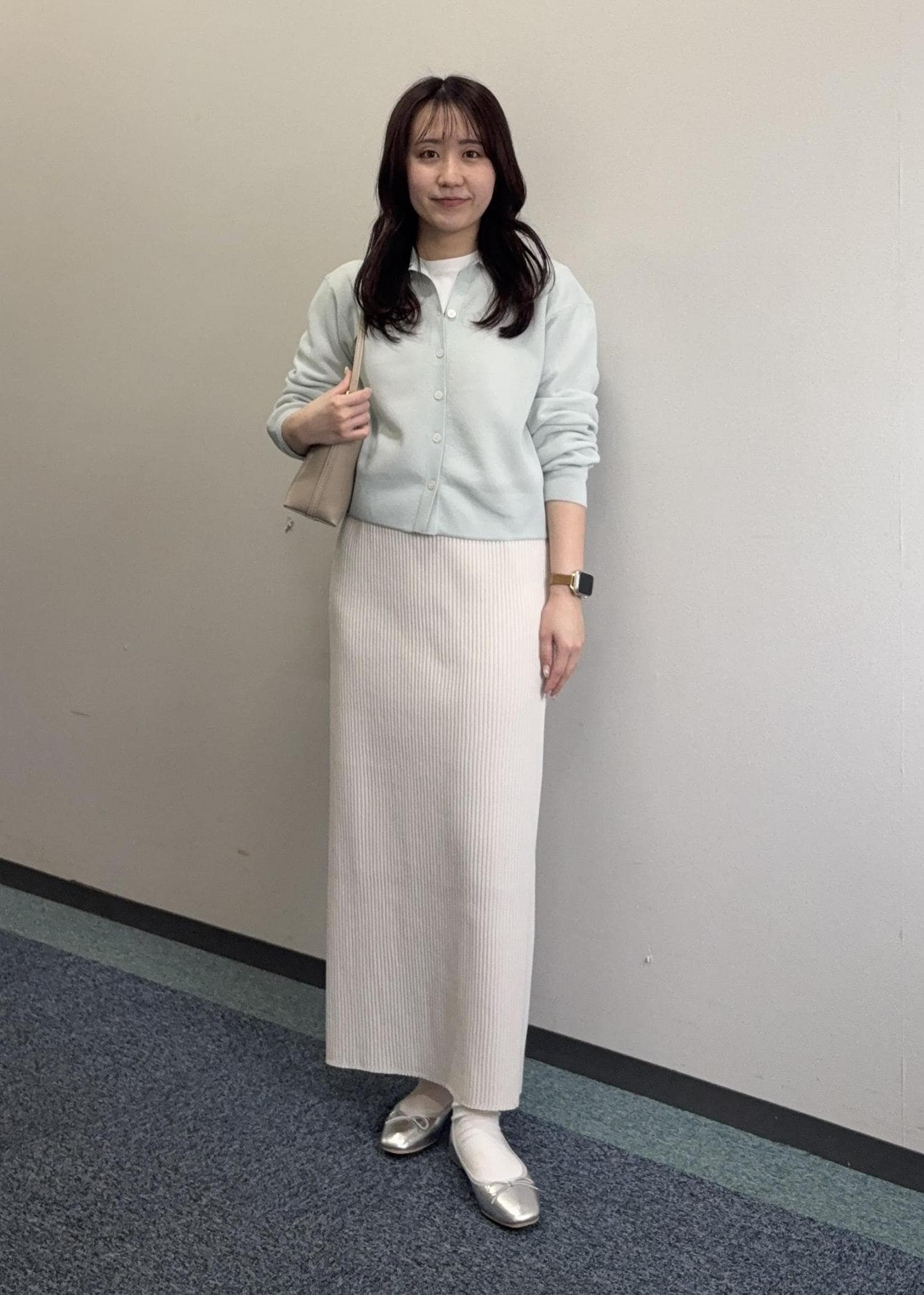 カラー物のカーディガンにすっきりとしたアイラインスカートを合わせたキレイめコーデ。