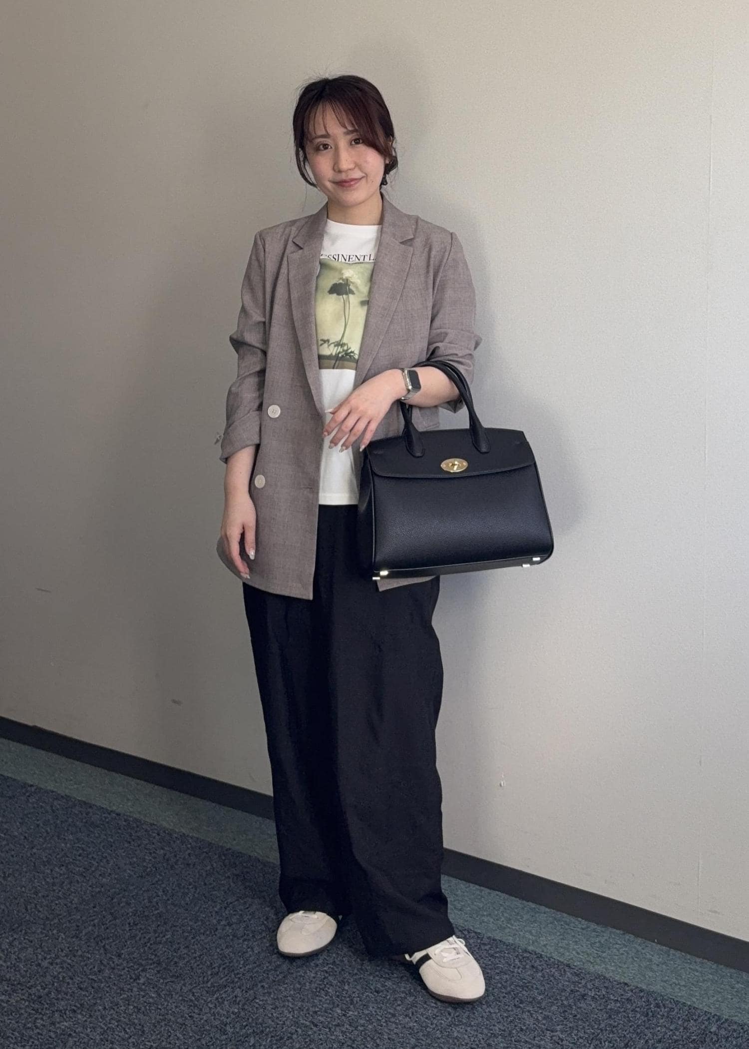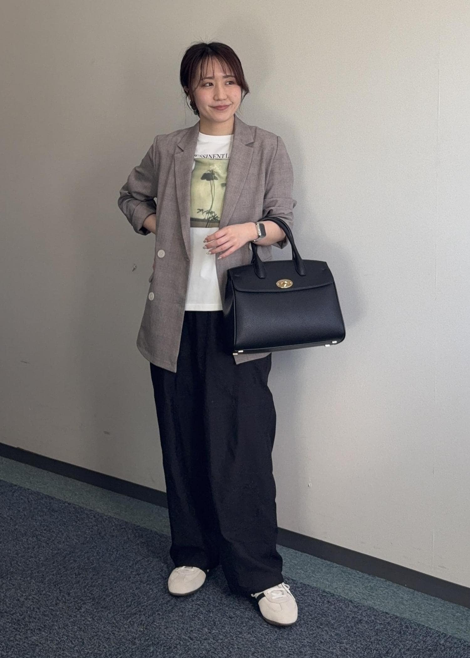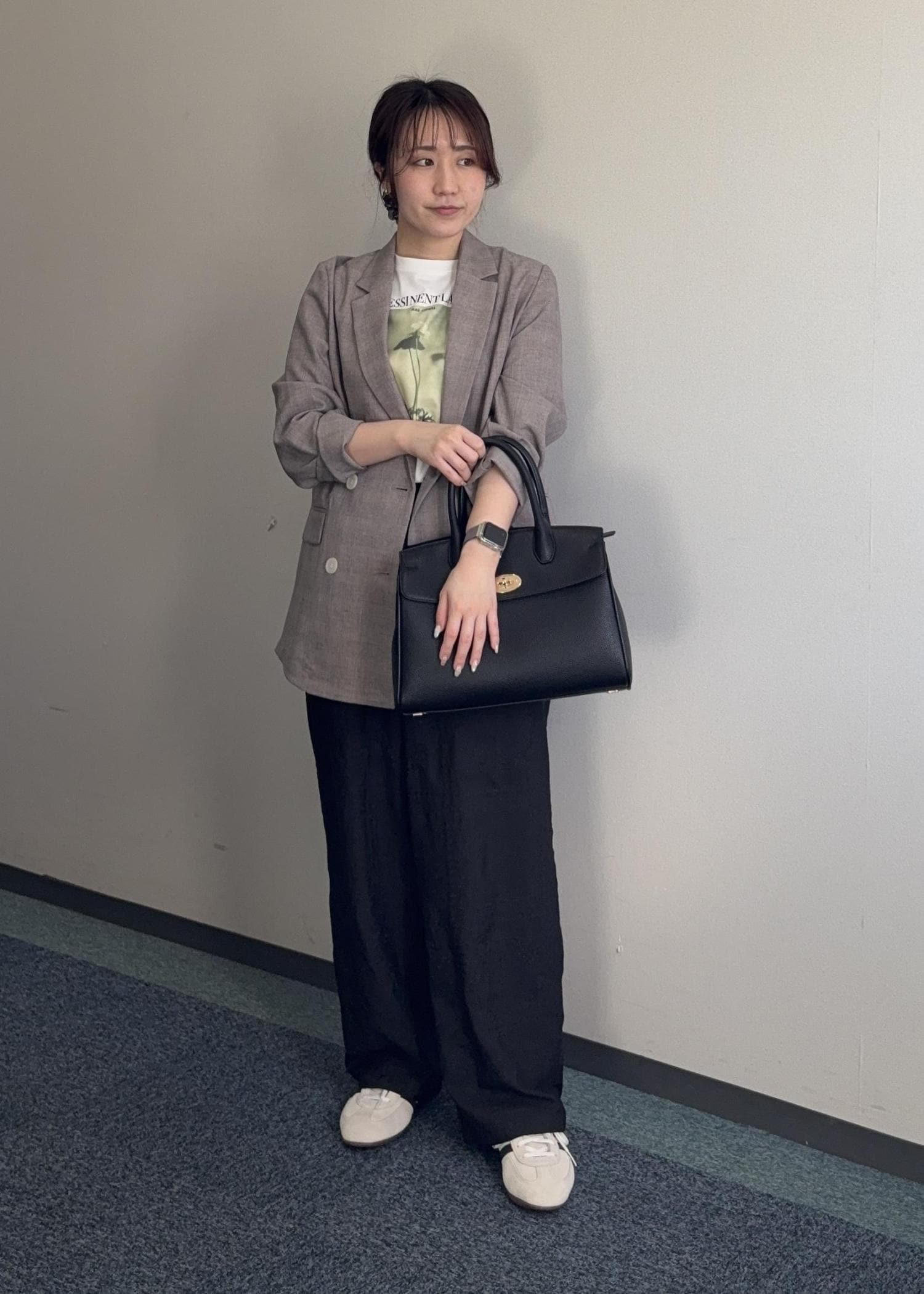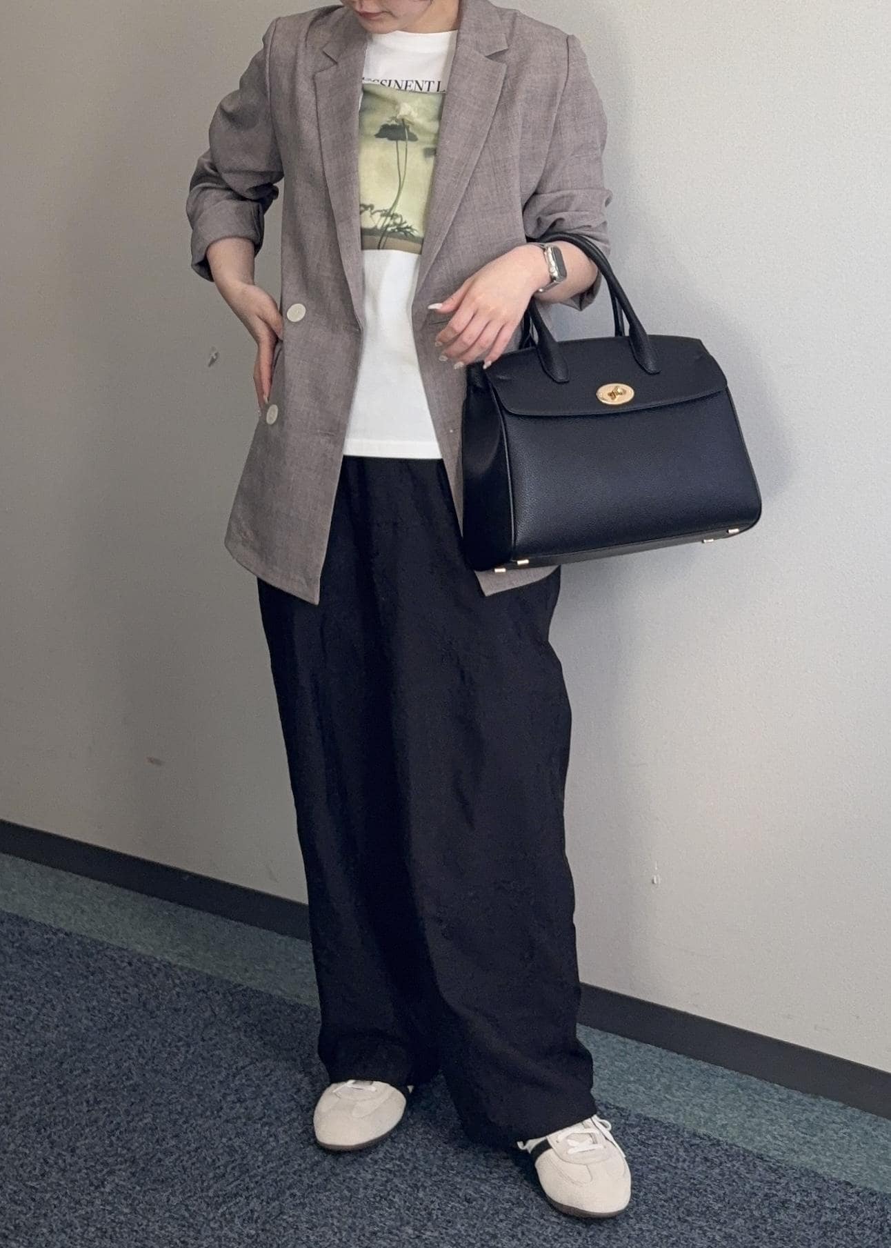 チェックジャケットとレースパンツを合わせ、全体的にゆったりとしたシルエットのコーディネート。スニーカーでカジュアル要素も取り入れました。