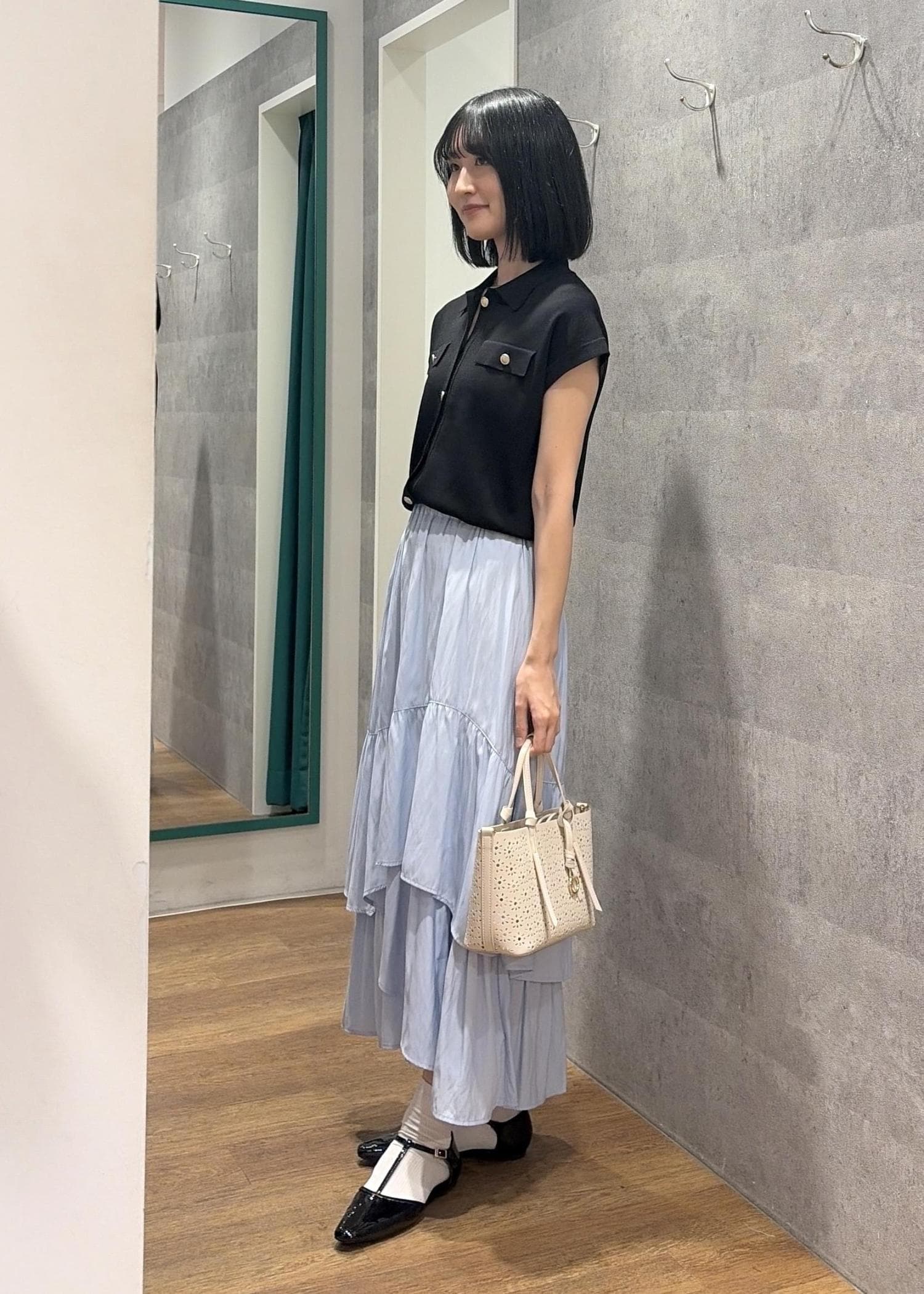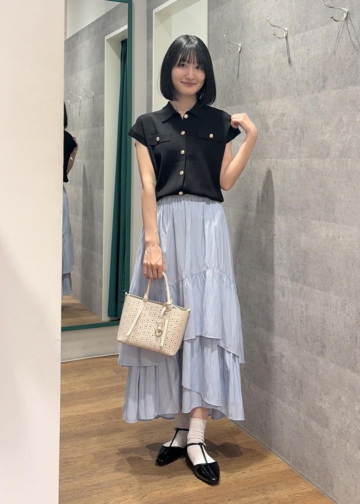金ボタンカーディガンにティアードスカートを合わせて上品なきれいめコーデにしました。