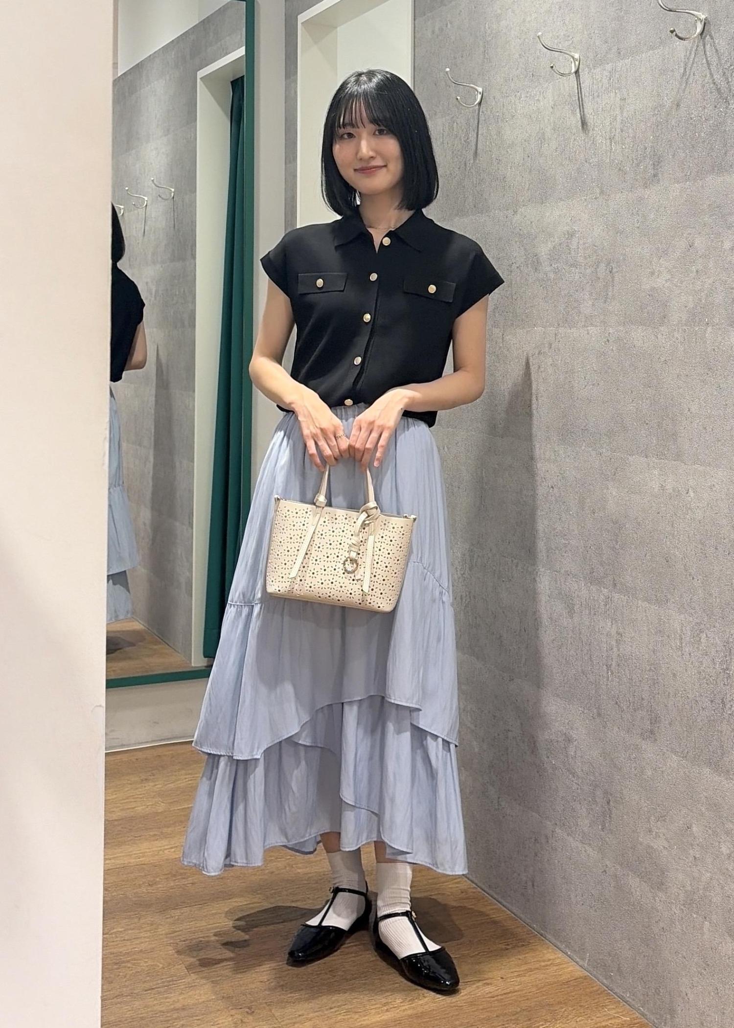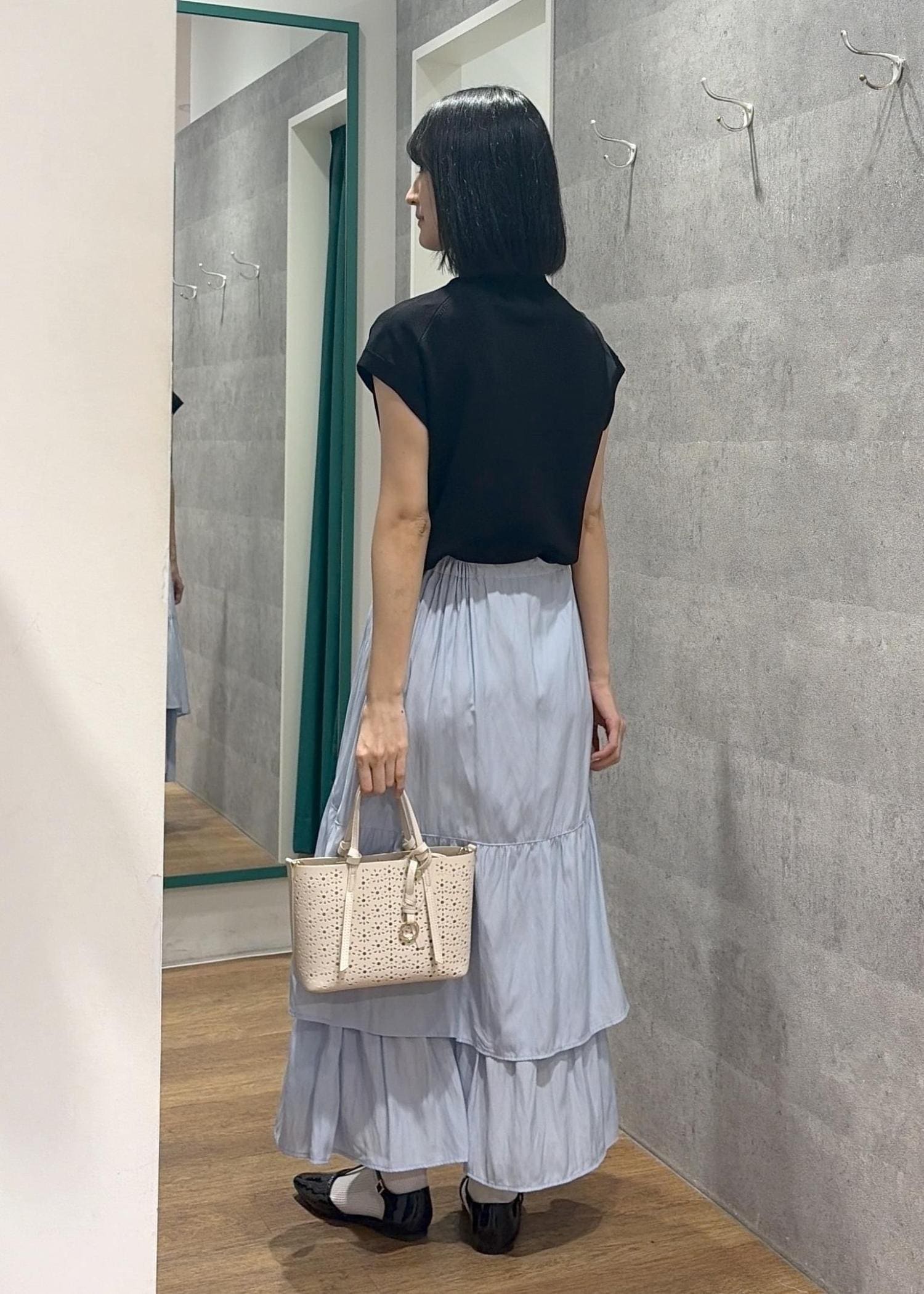 黒は重くなりがちですが、涼しげなライトブルーやレースバッグと合わせることで、重い印象を緩和して軽やかなコーデに見えます。