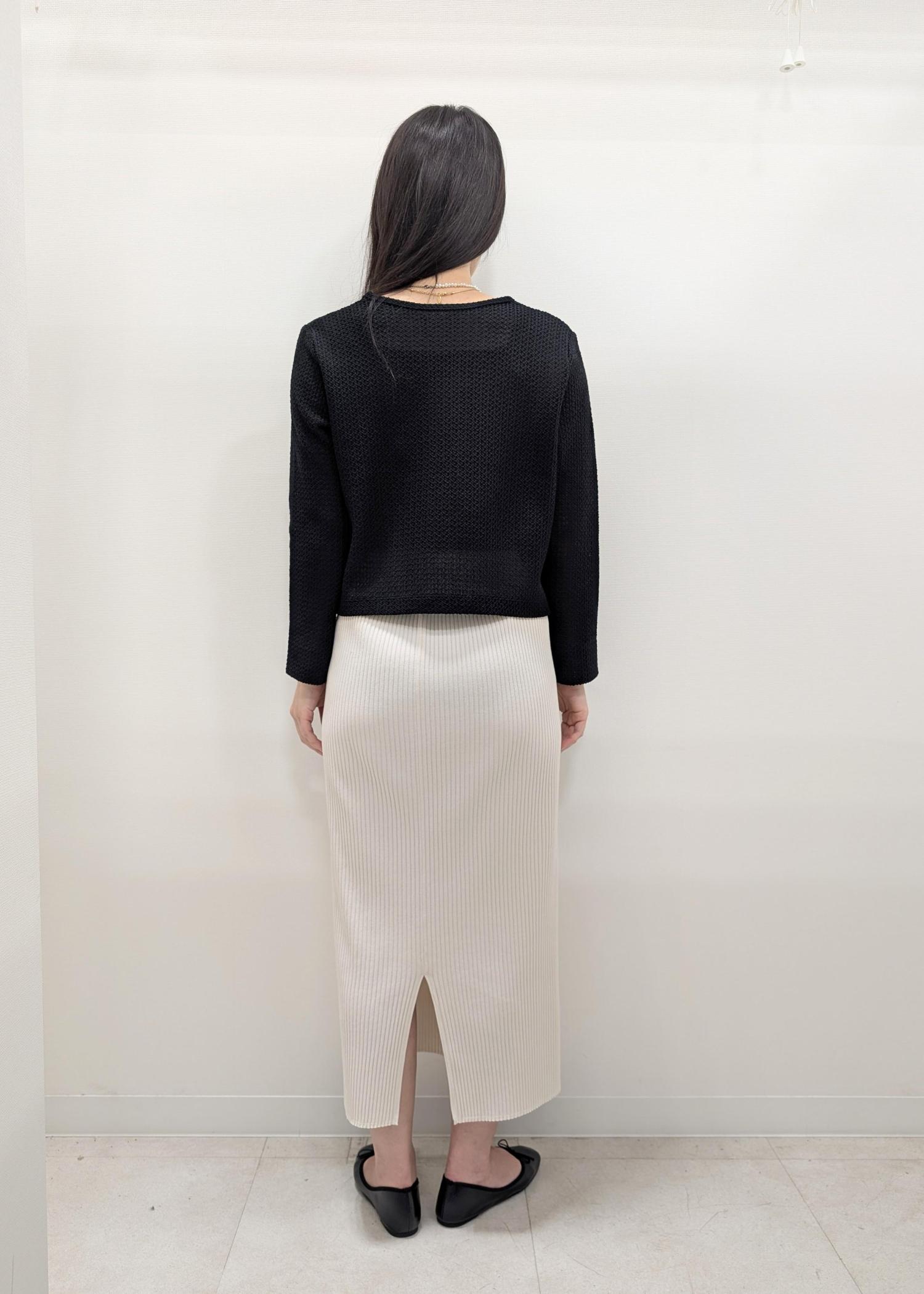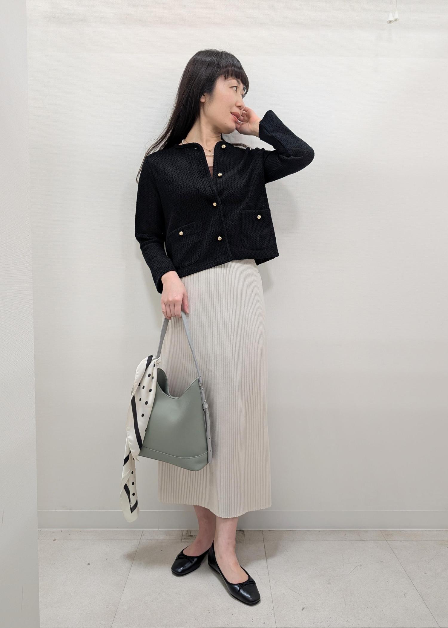 羽織るだけでお洒落見えなジャケット風カーディガンにタイトスカートのエレガントなコーディネート。