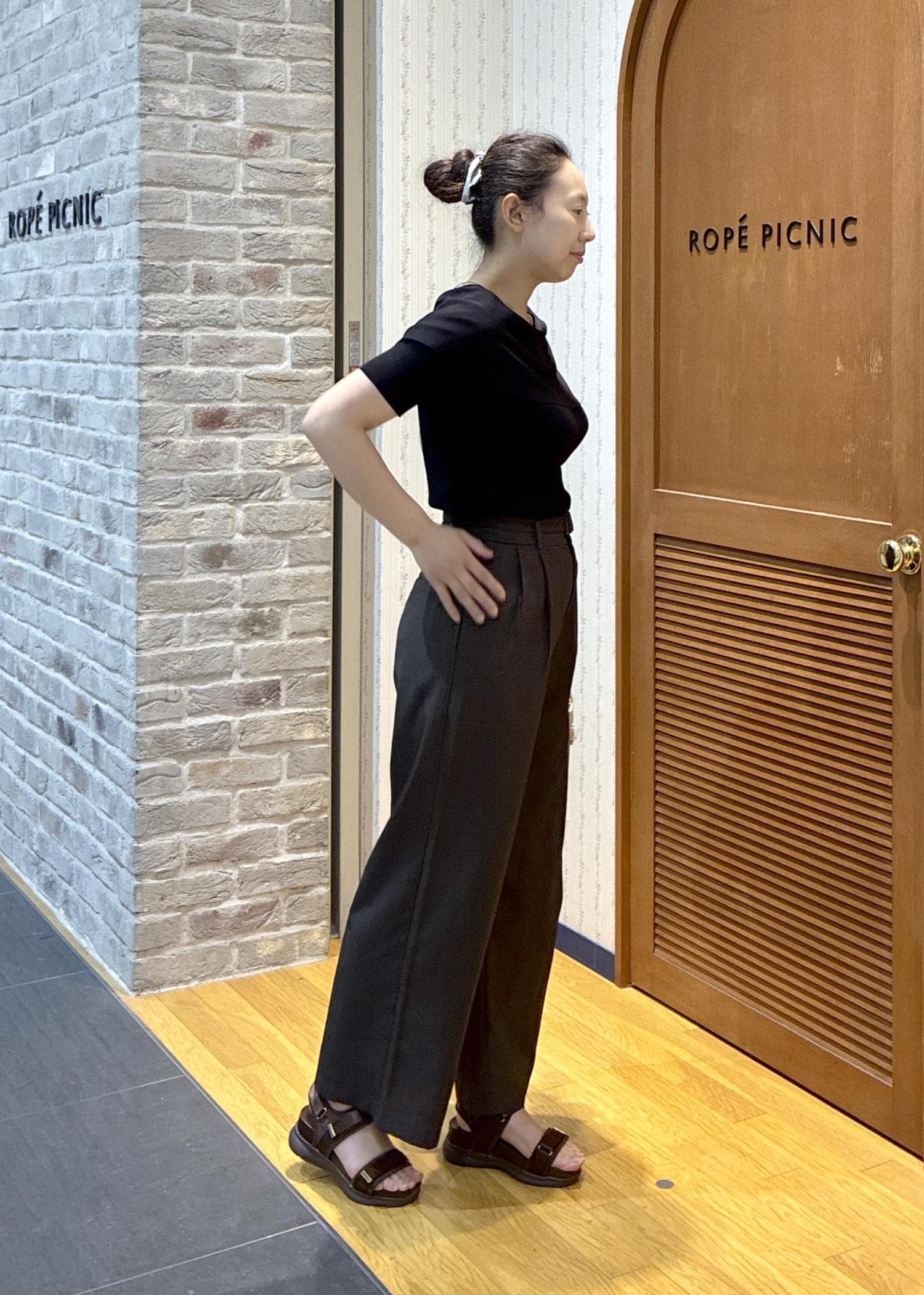 ブラックとダークブラウン、全体的に重くフォーマル感がでてくるので、サンダルで抜け感をだしました。