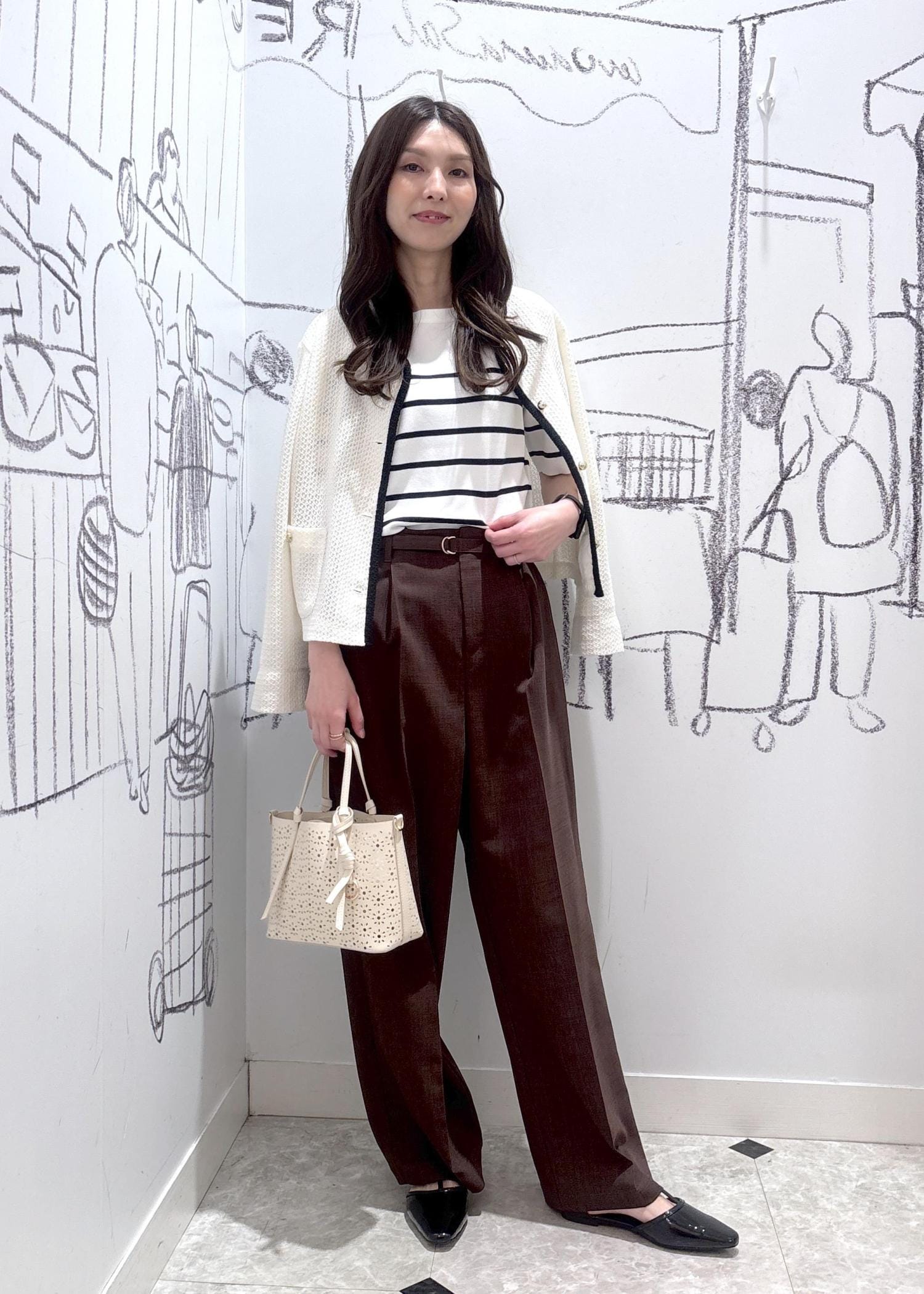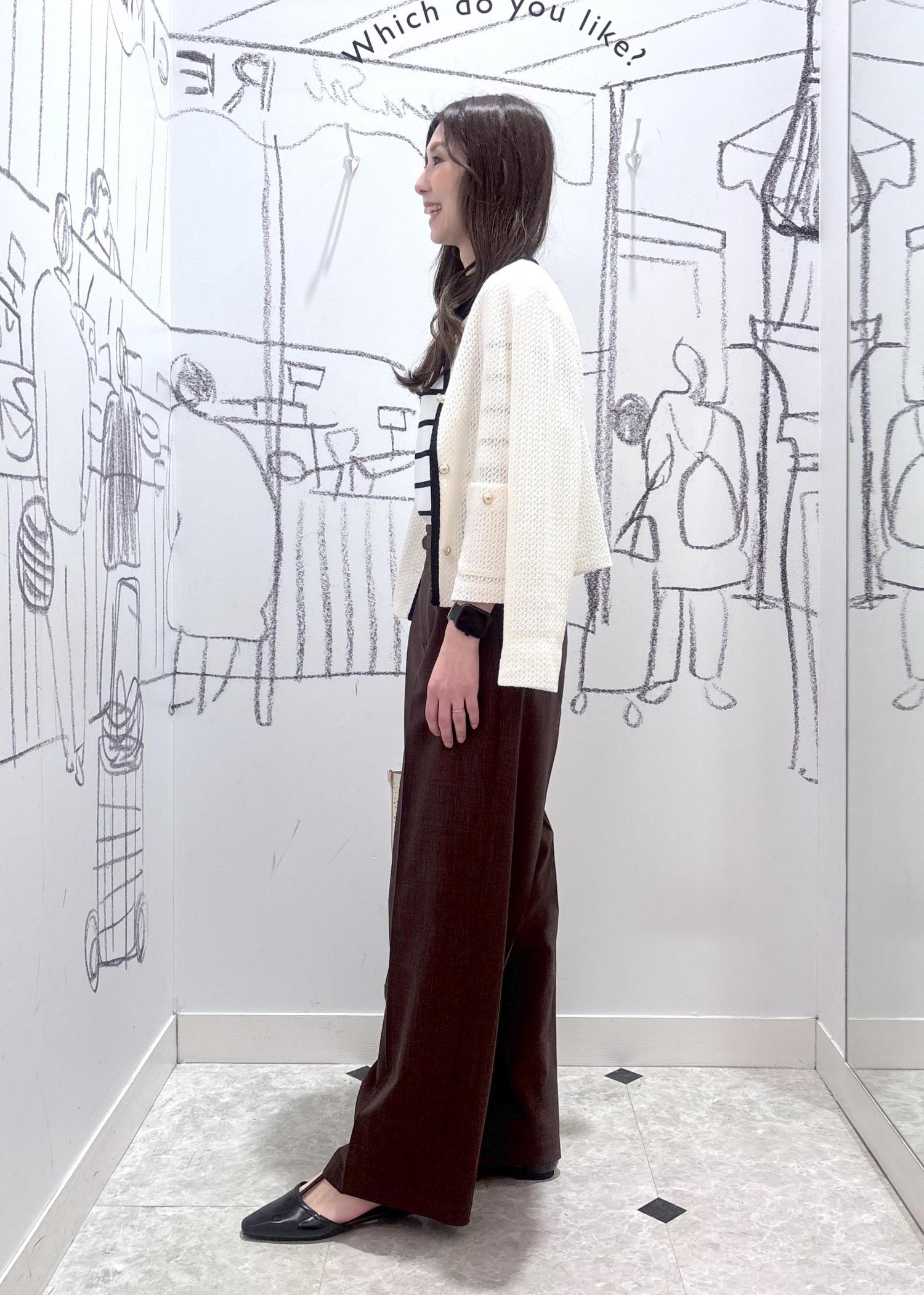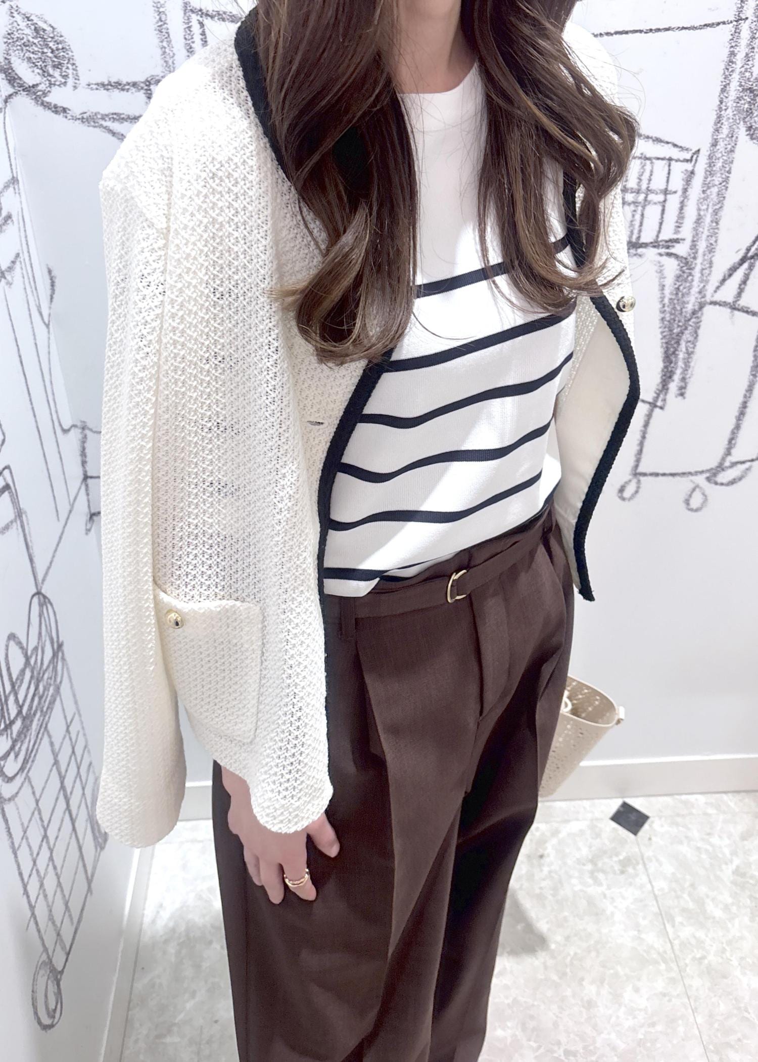 インナーにお手入れもしやすい素材感のボーダートップスを合わせて普段使いもしやすいコーディネートにまとめました。