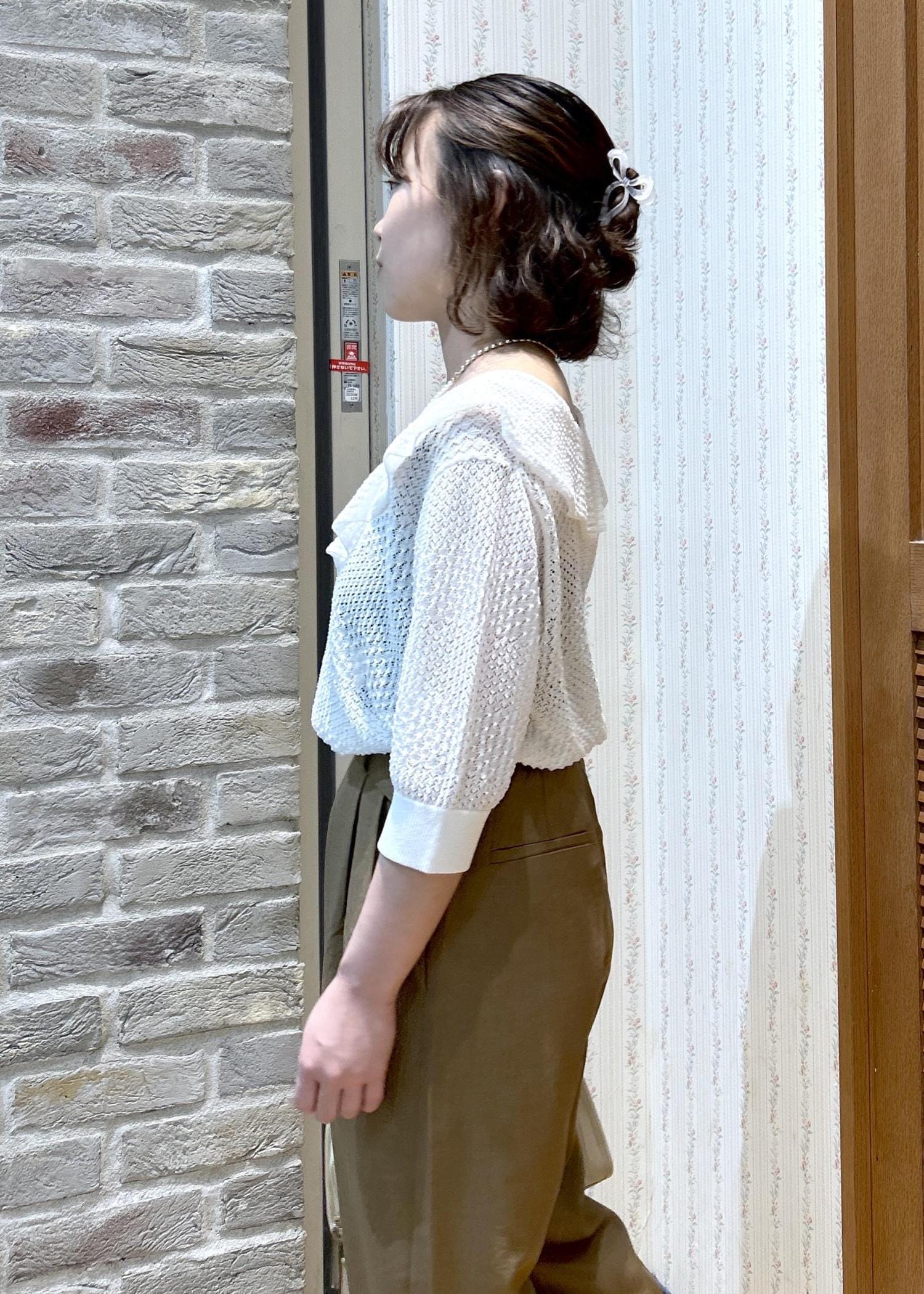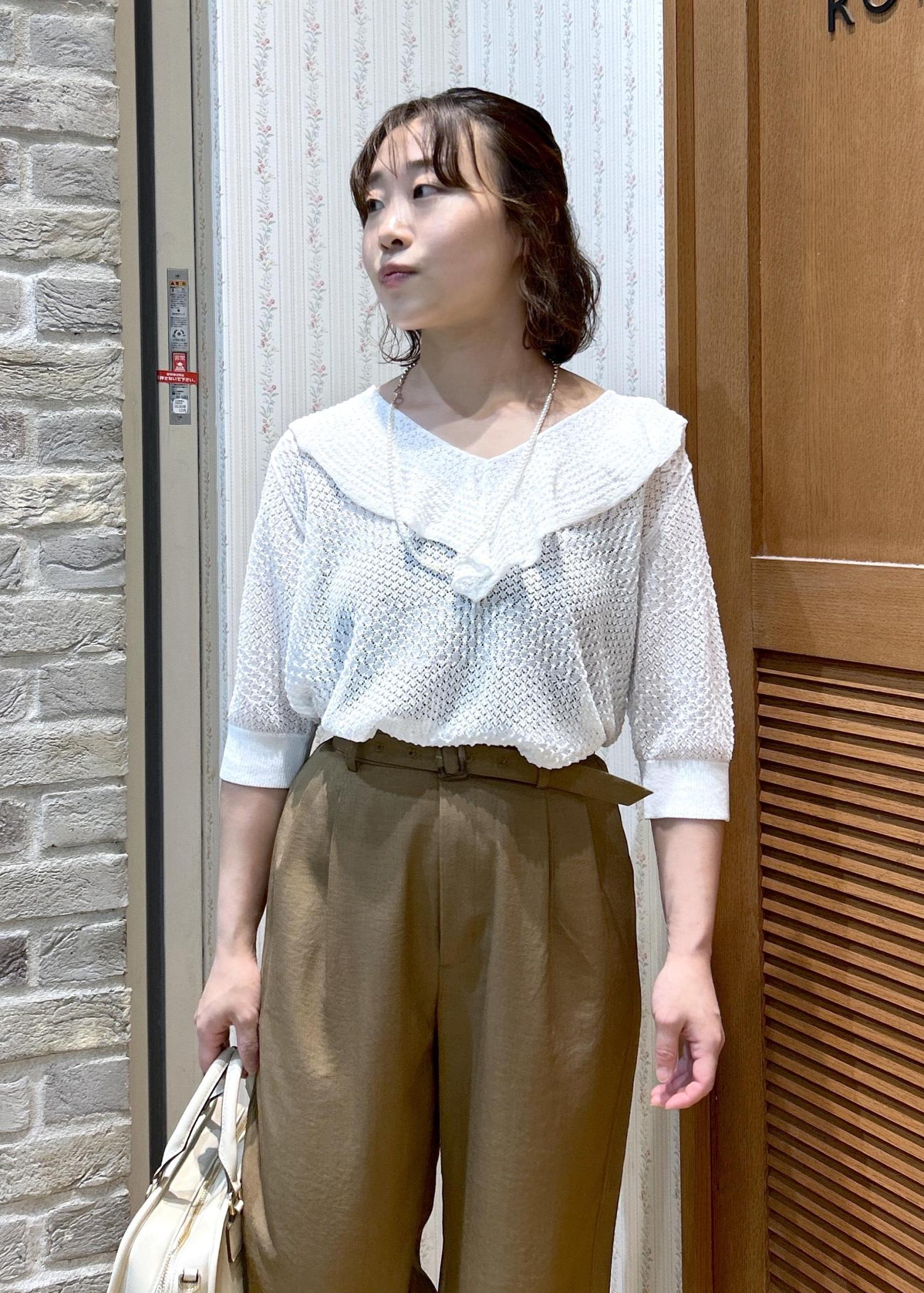ROPÉ PICNIC5分袖フリルニットキナリ / F¥4,994レビュー生地は薄手で柔らかく、ゆるっと着られて着心地が良いです。身長147㎝で着丈がやや長めに感じたため、パンツにインした方がバランス良く着こなせました。Vネックで鎖骨ラインがキレイに見え、女性らしい印象です。