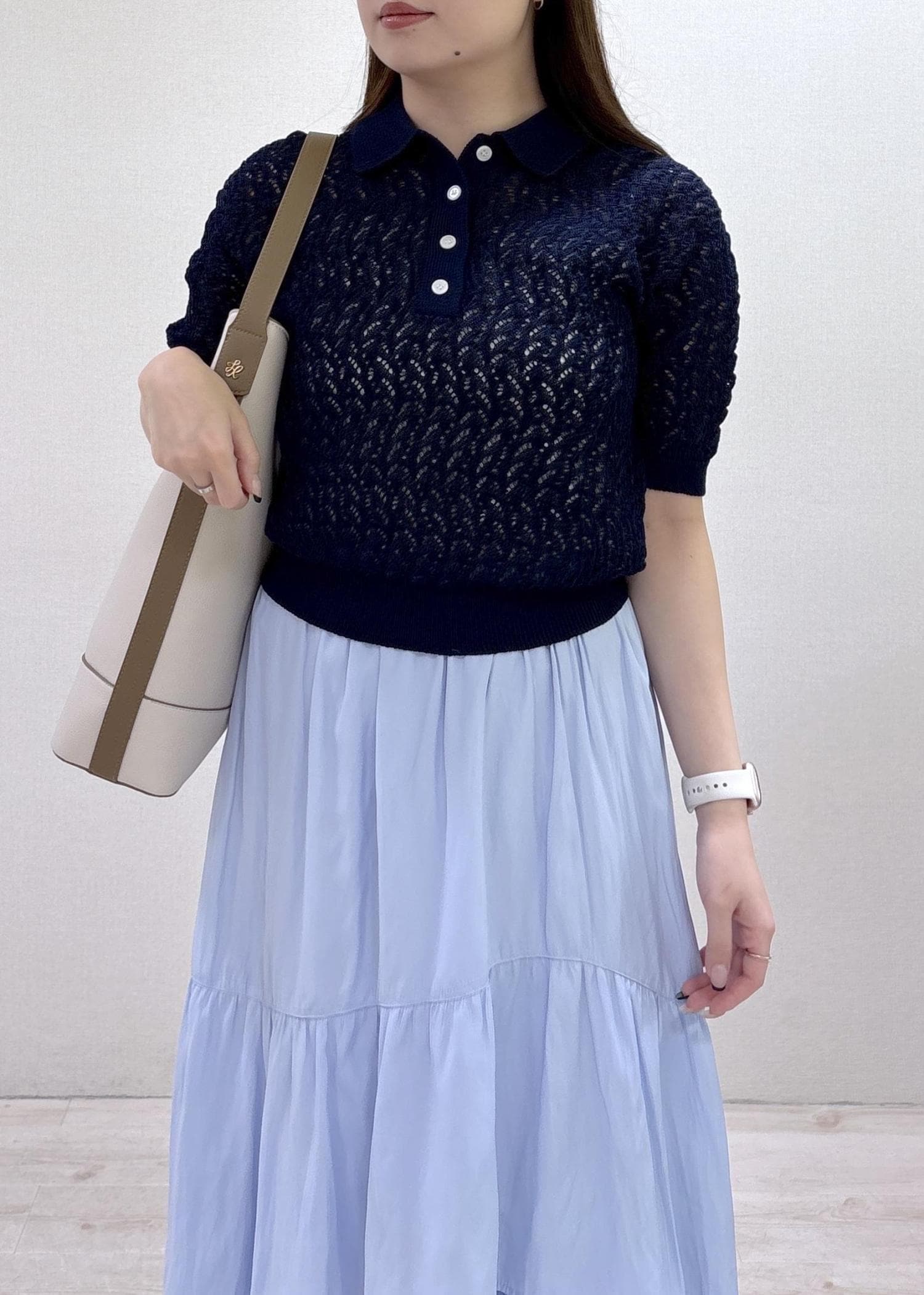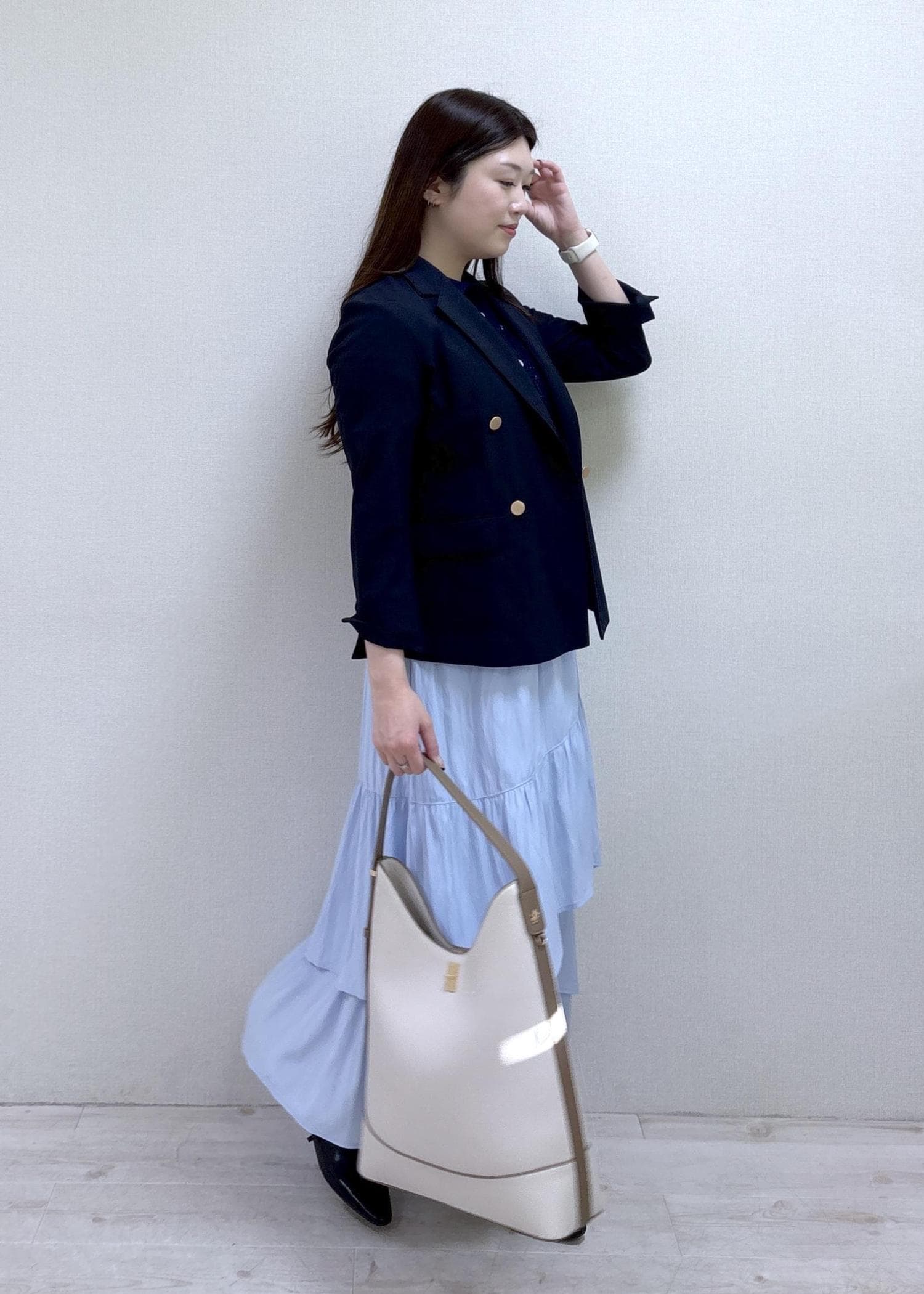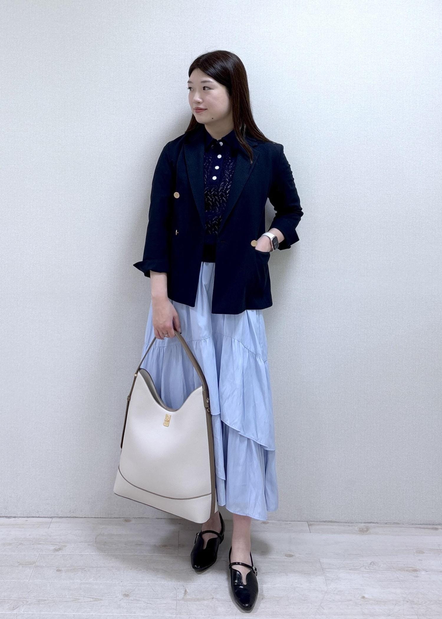 ネイビー×ブルーの組み合わせげ爽やかな、春〜初夏にかけてオススメのお仕事コーデです。