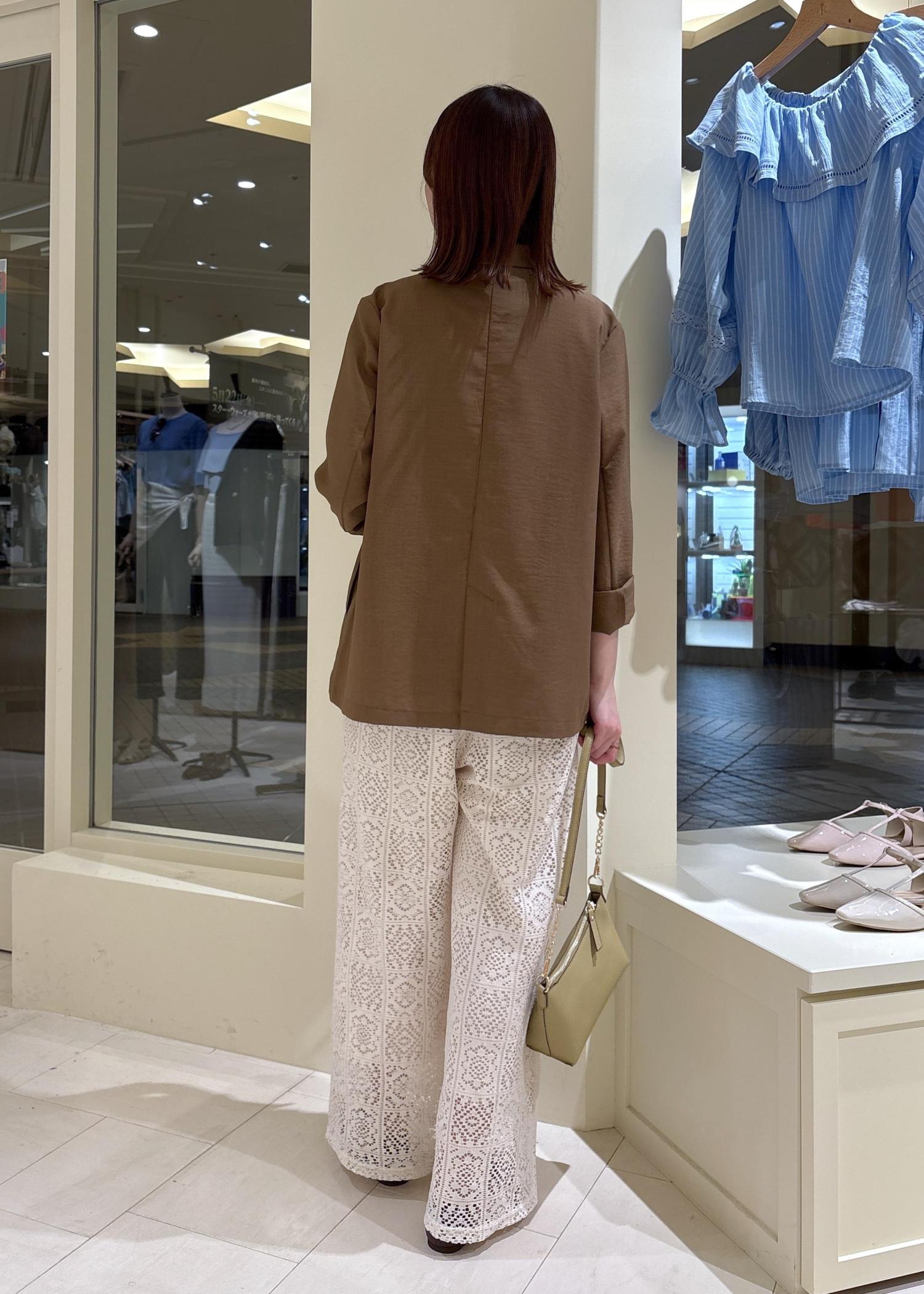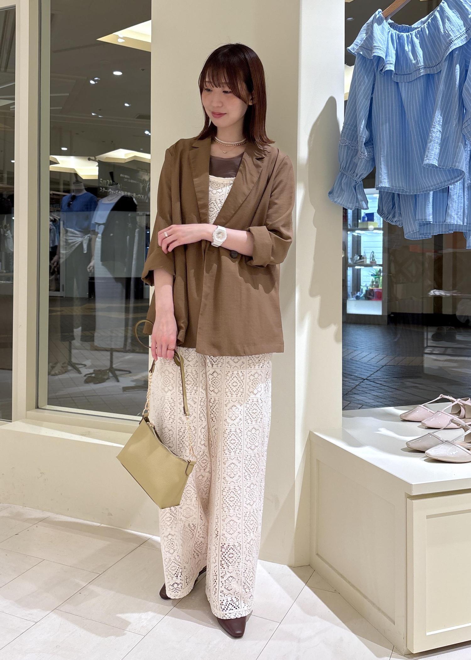 レースのオールインワンにジャケットを合わせた、大人カジュアルなスタイリングです。