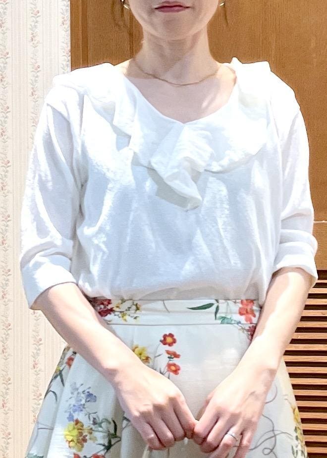 ROPÉ PICNIC5分袖フリルニットオフホワイト / F¥4,994レビュー肘が隠れるくらいの袖の長さで、丈はすっきりしています。