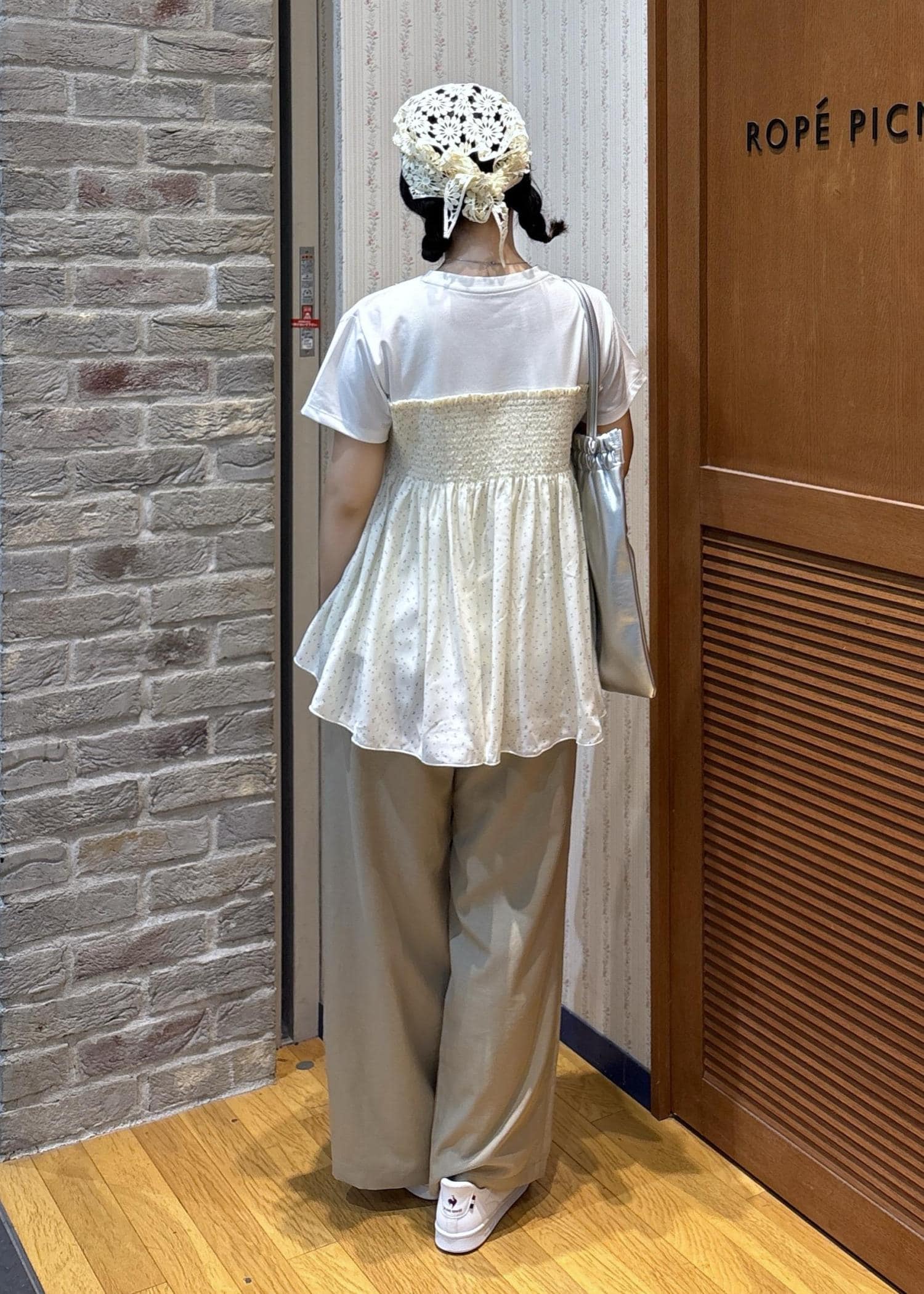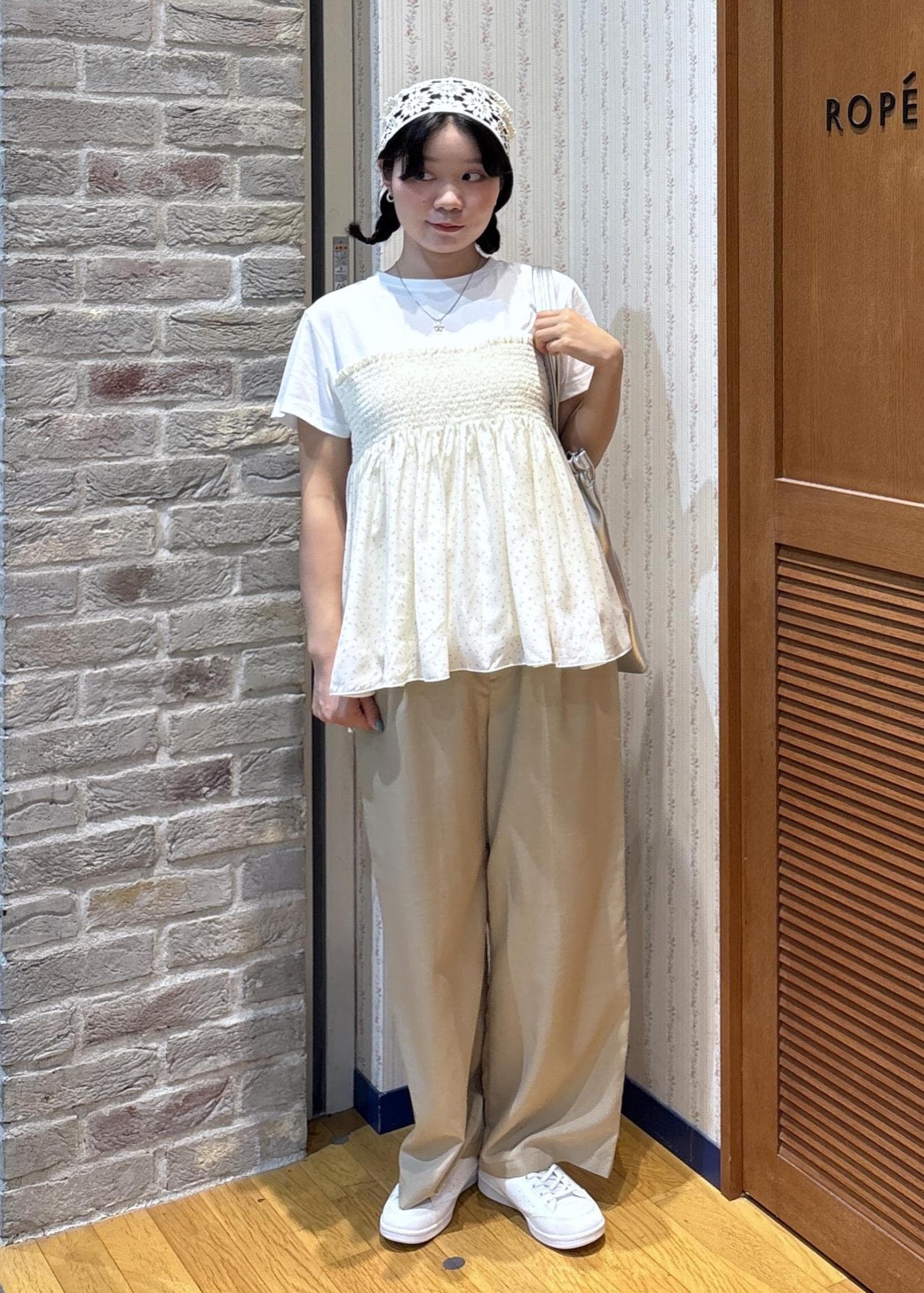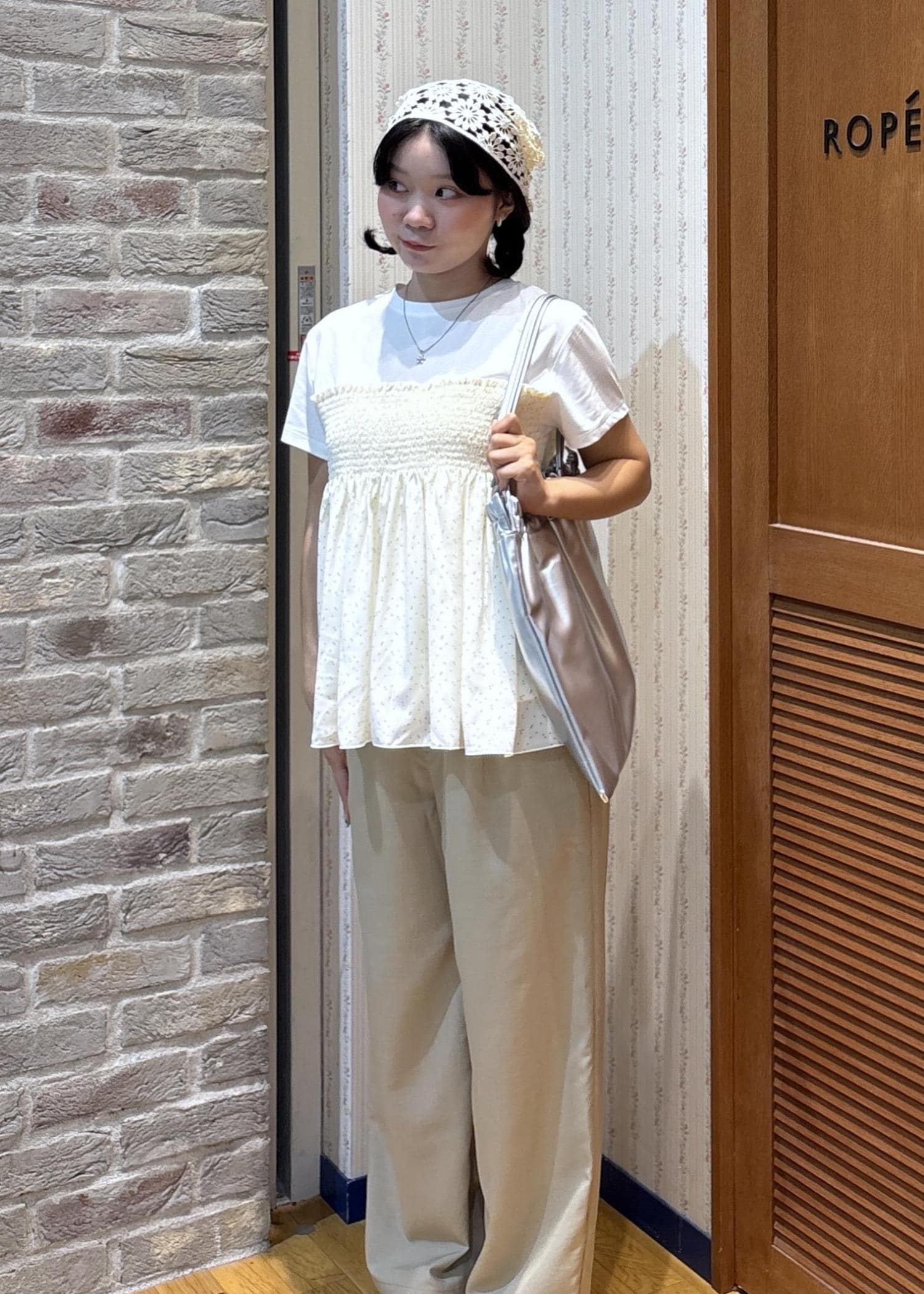甘めなトップスに、上品見えするリネンライクシリーズのパンツを合わせました。