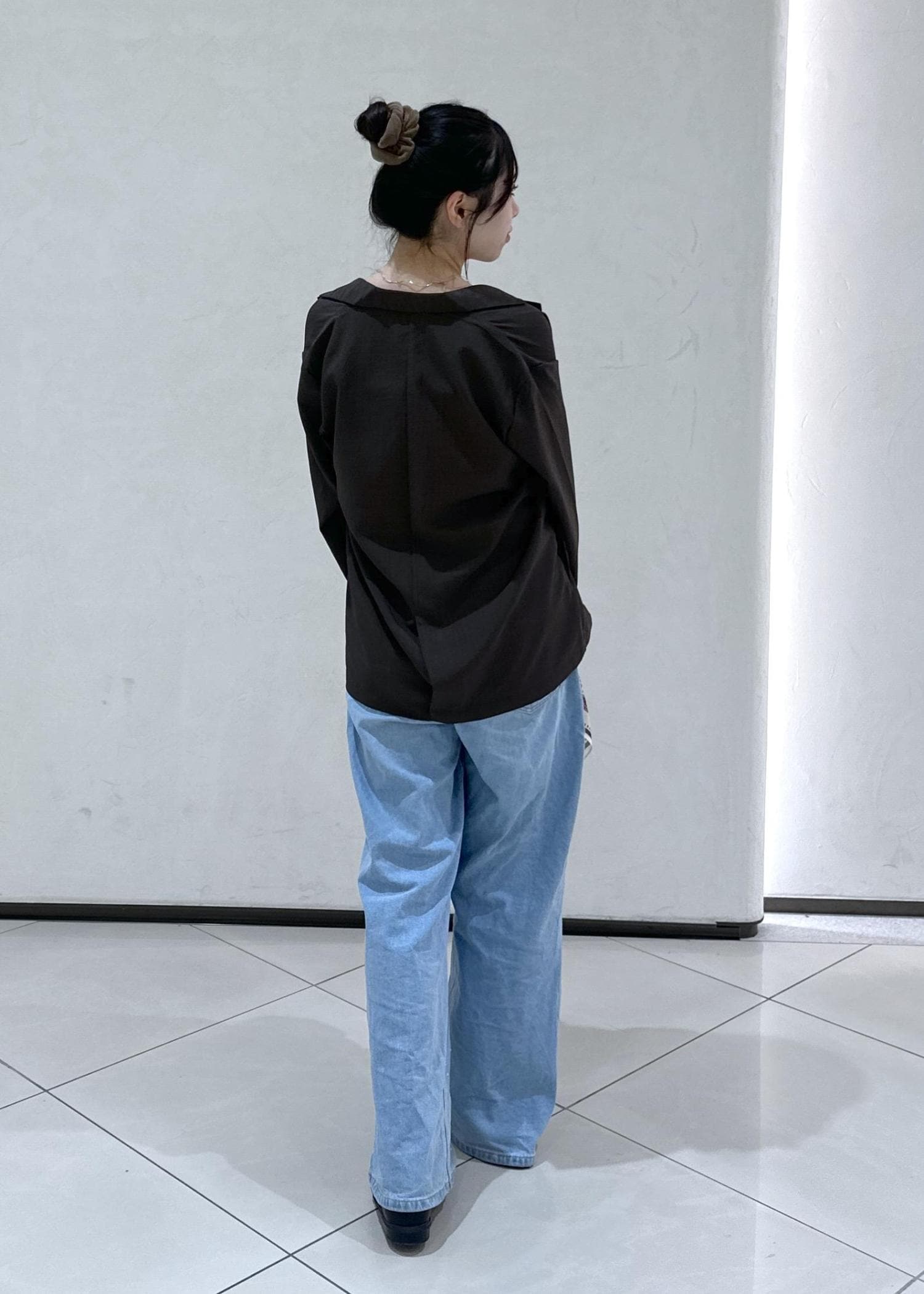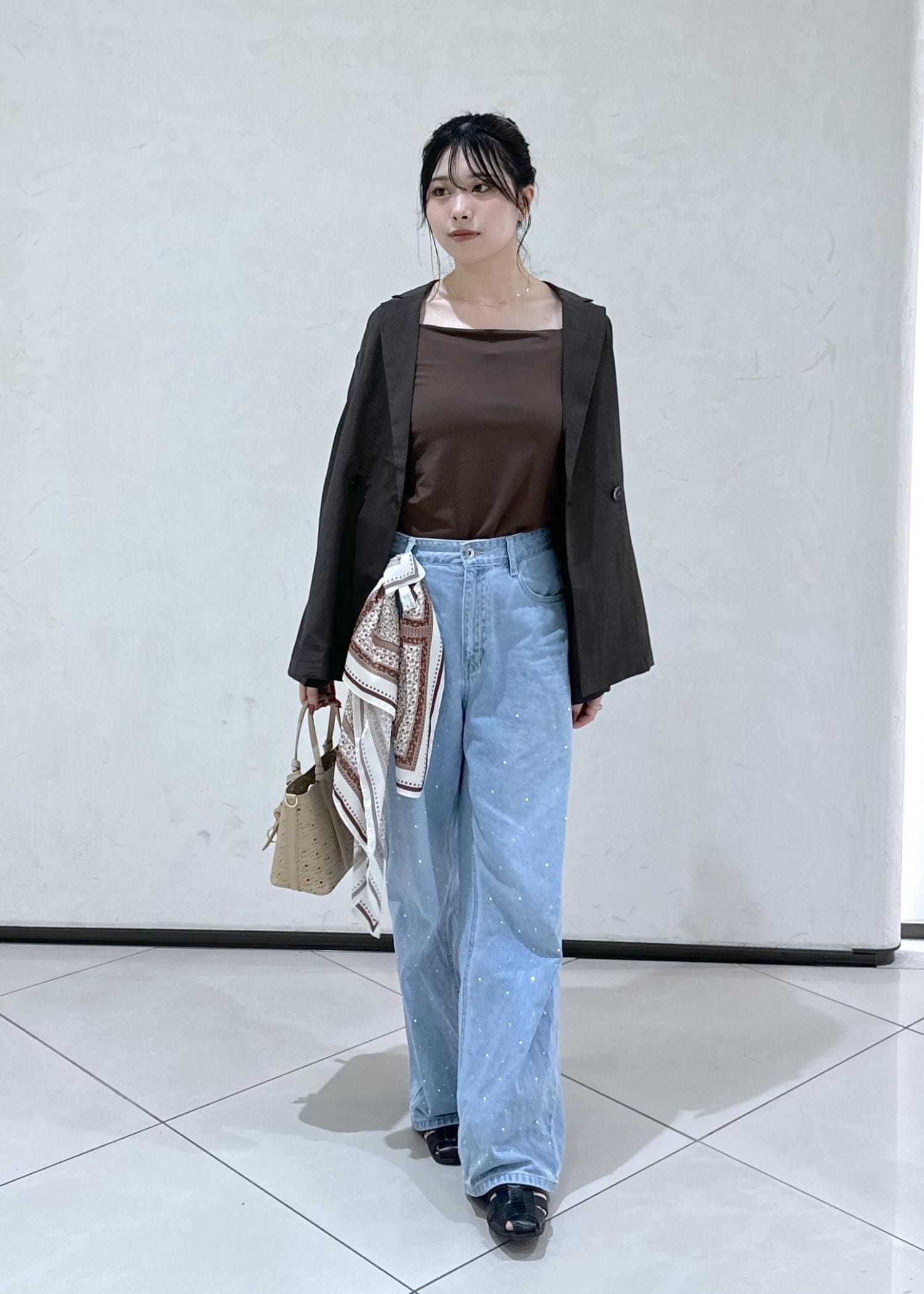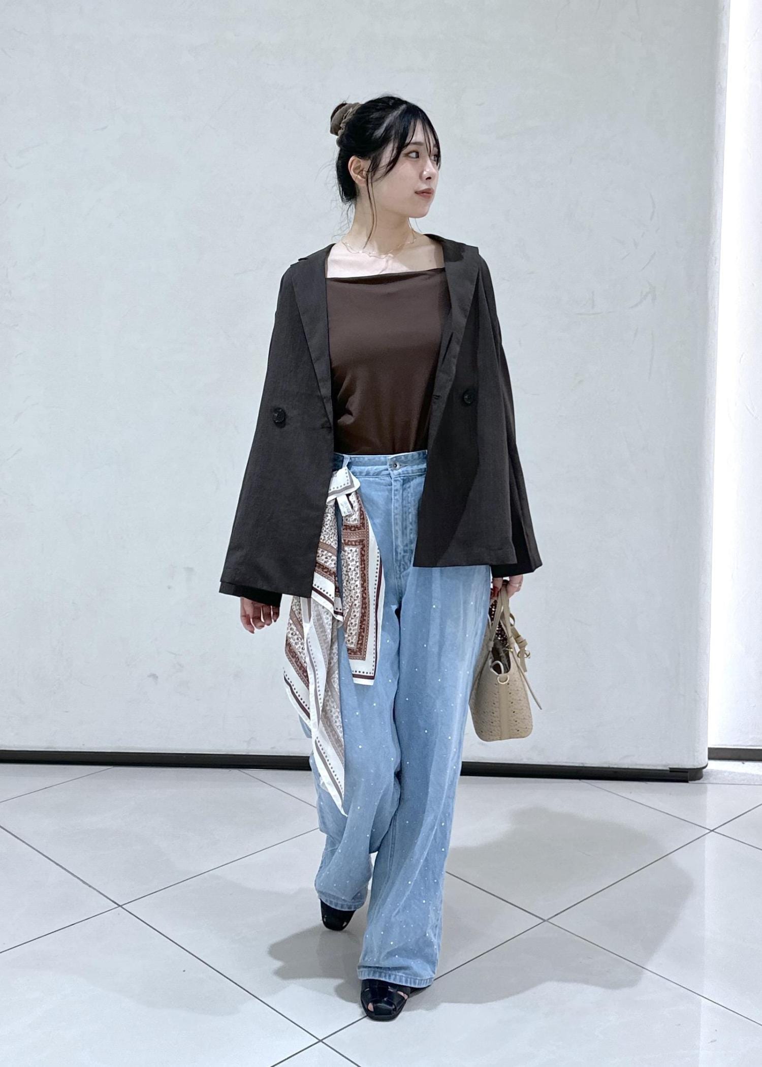 ジャケットにデニム合わせの定番大人カジュアルコーデにワンポイントでスカーフをつけたこなれ感抜群のスタイリングです!