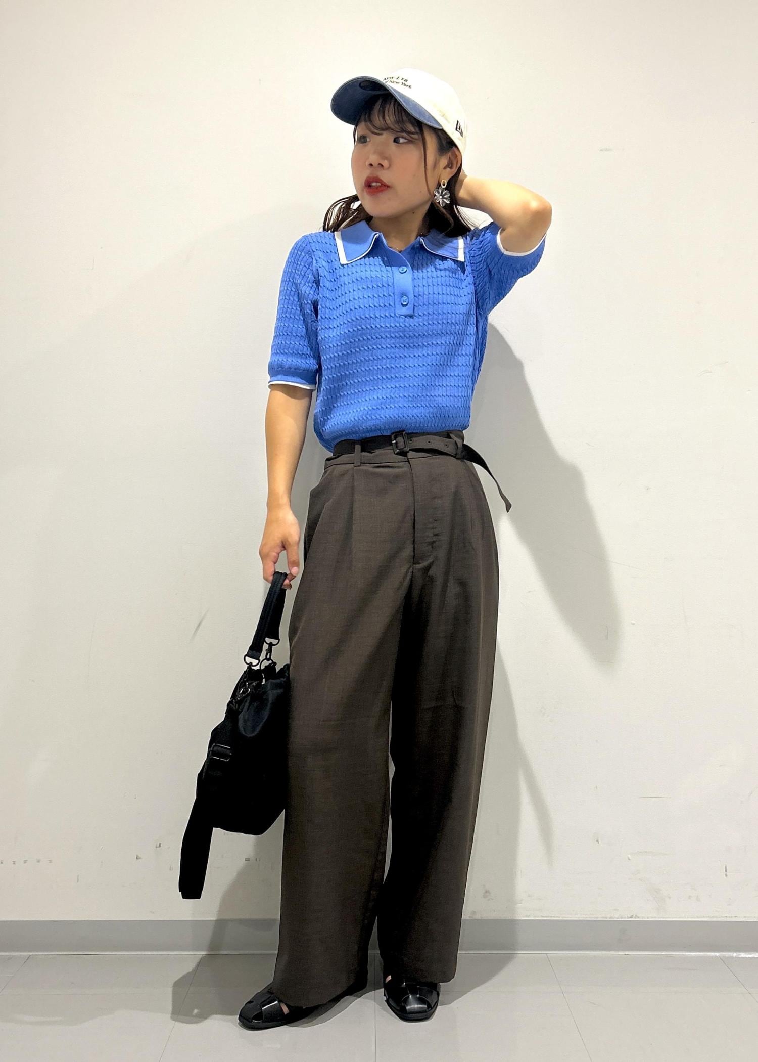 こちらのトップスは、襟元にフリルが付いているので、華やかな印象になります!ふわっと感があり、腕も包み込んでくれるので細見え効果もあります!