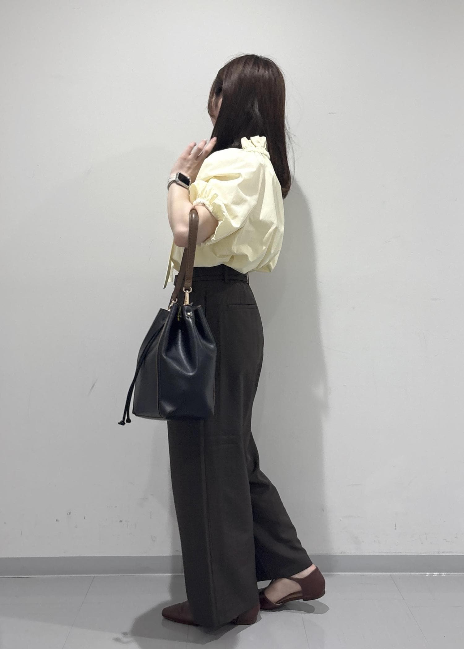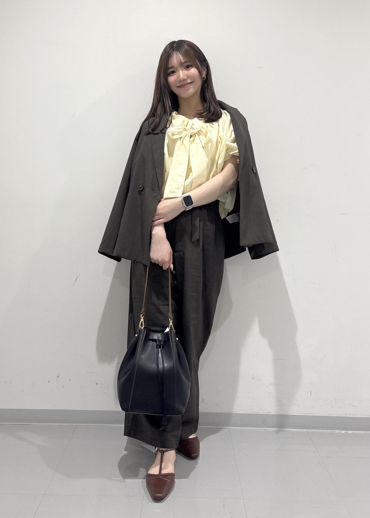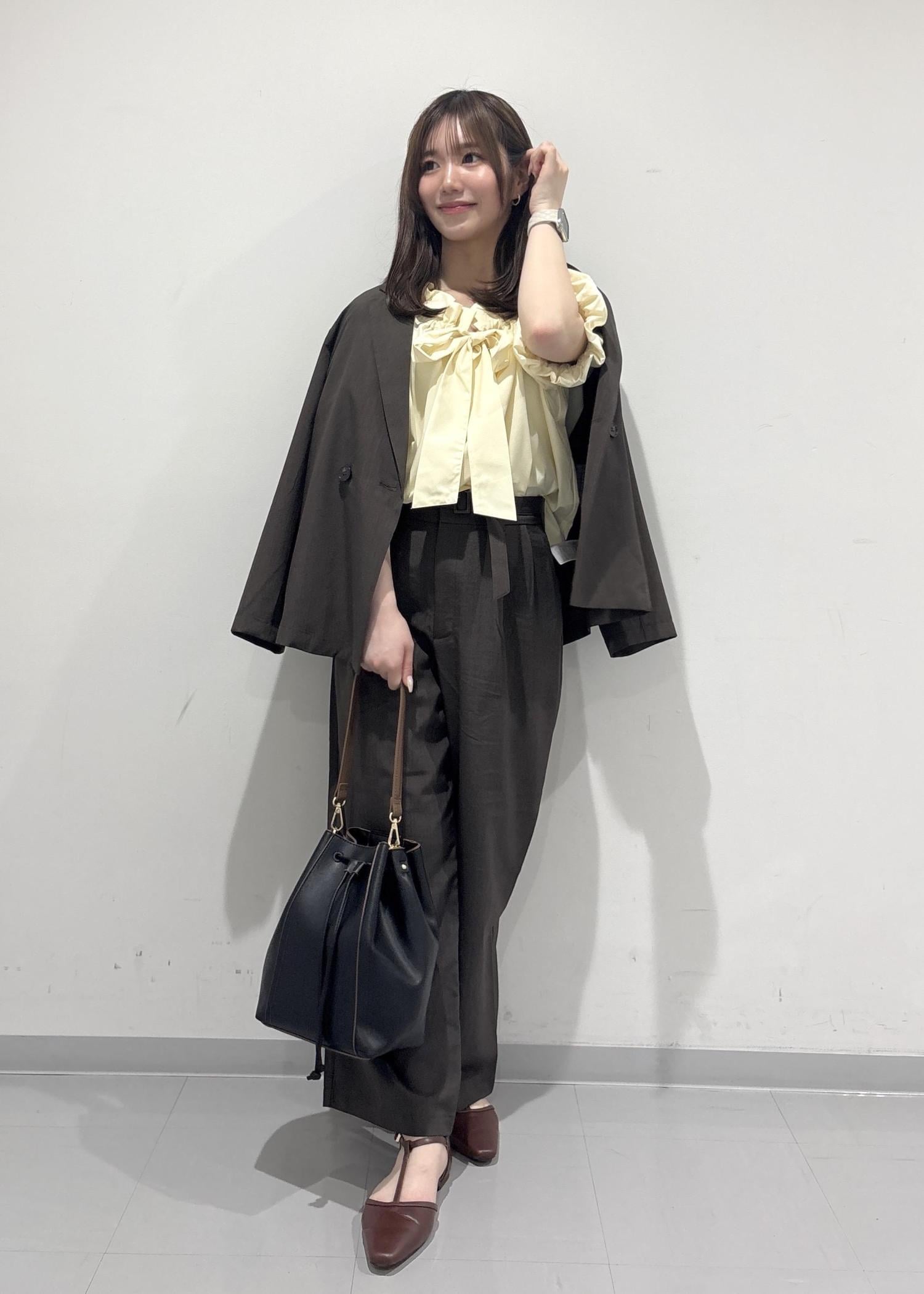 こちらのコーデは、パステルイエローのブラウスで甘めで柔らかい印象を出して、ダークブラウンのジャケットとパンツで上品で大人っぽく引き締めてみました!あとは、Tストラップのパンプスで抜け感を出したのもポイントです!