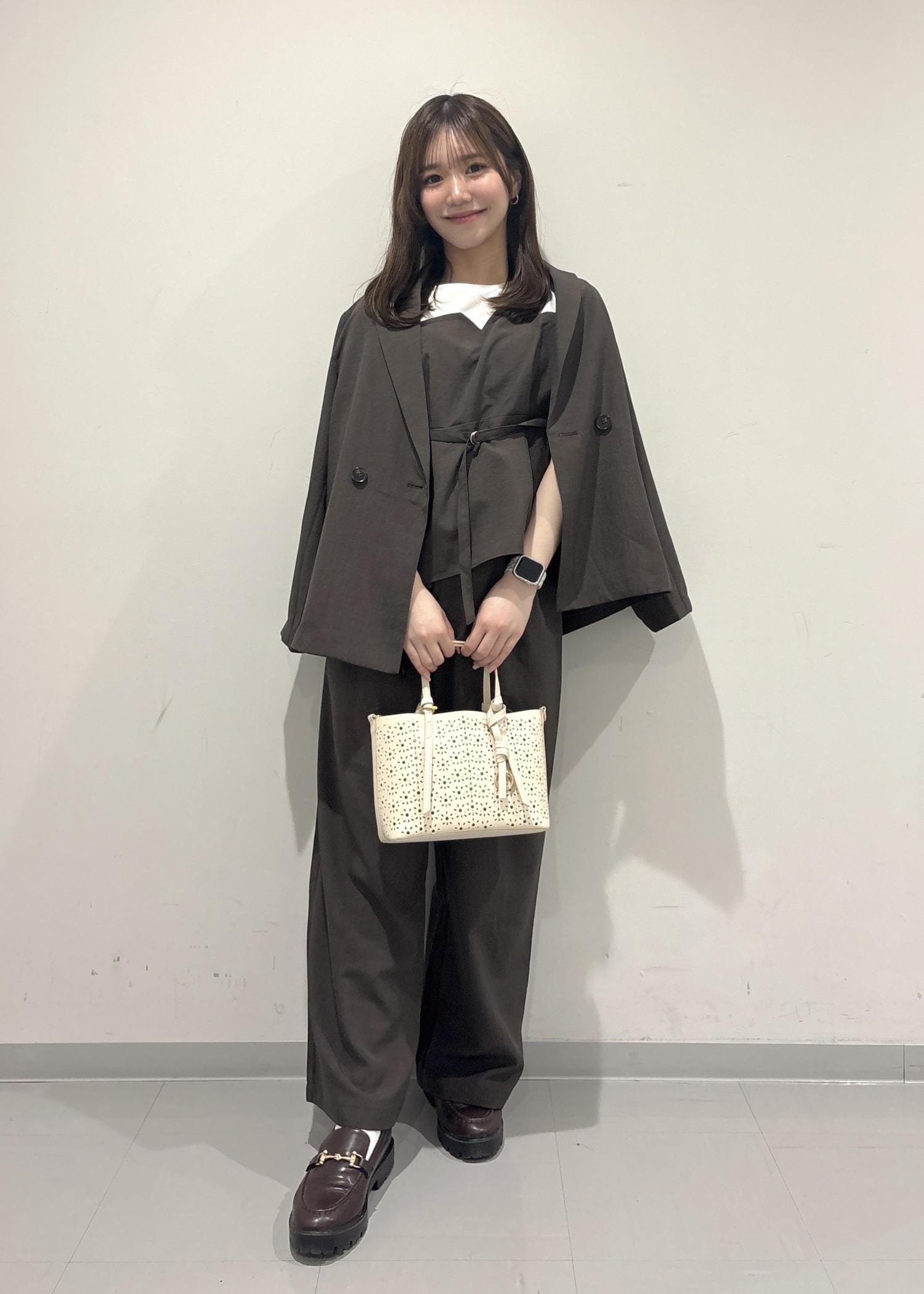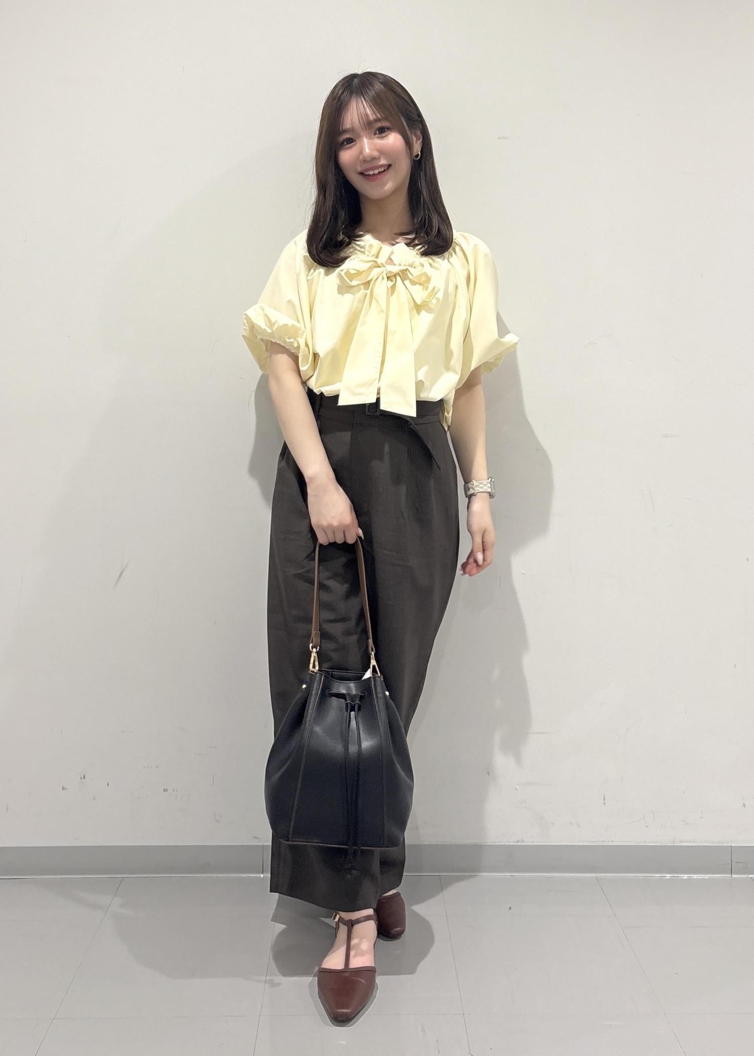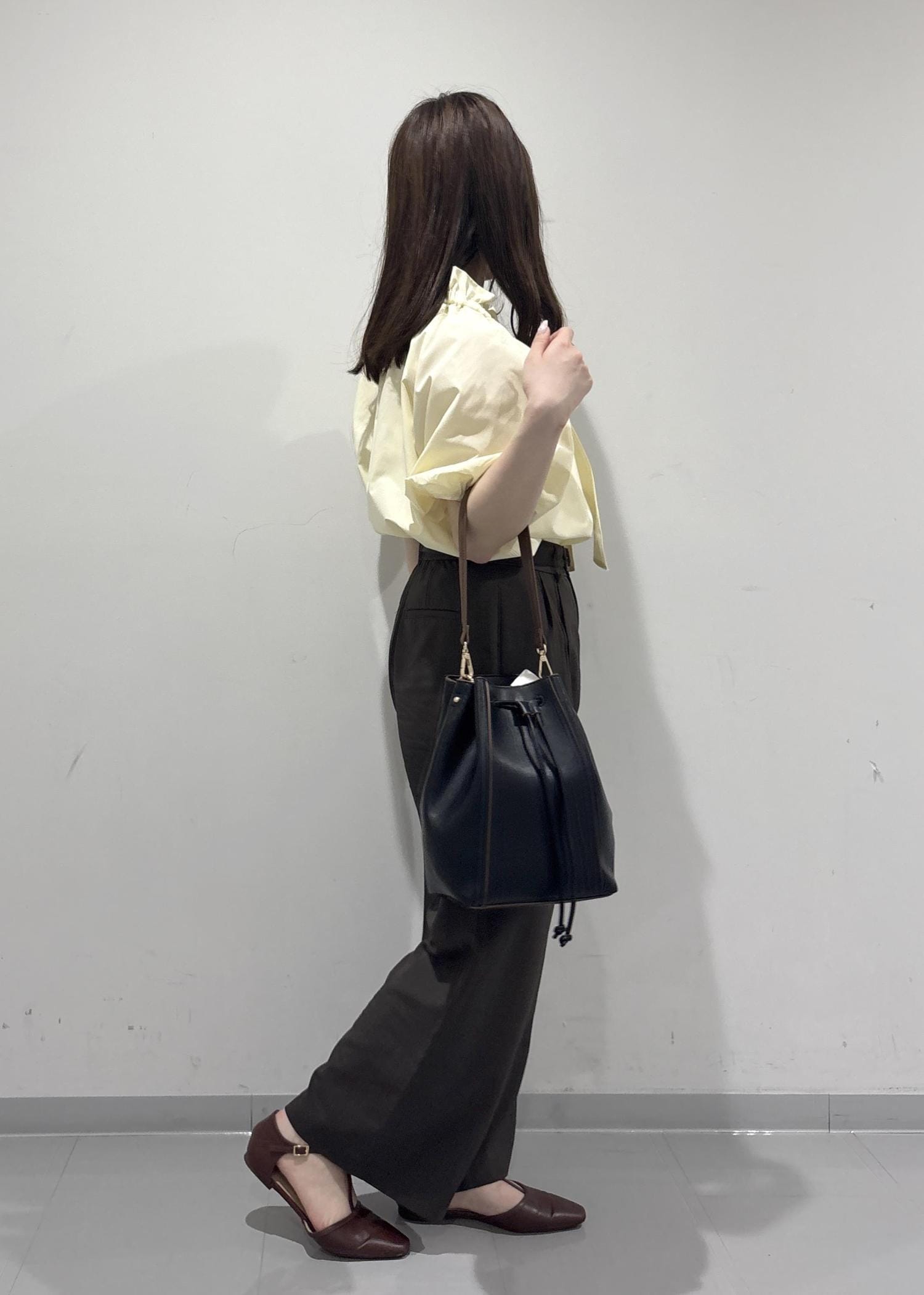 こちらのコーデは、パステルイエローのブラウスで甘めで柔らかい印象を出して、ダークブラウンのジャケットとパンツで上品で大人っぽく引き締めてみました!あとは、Tストラップのパンプスで抜け感を出したのもポイントです!