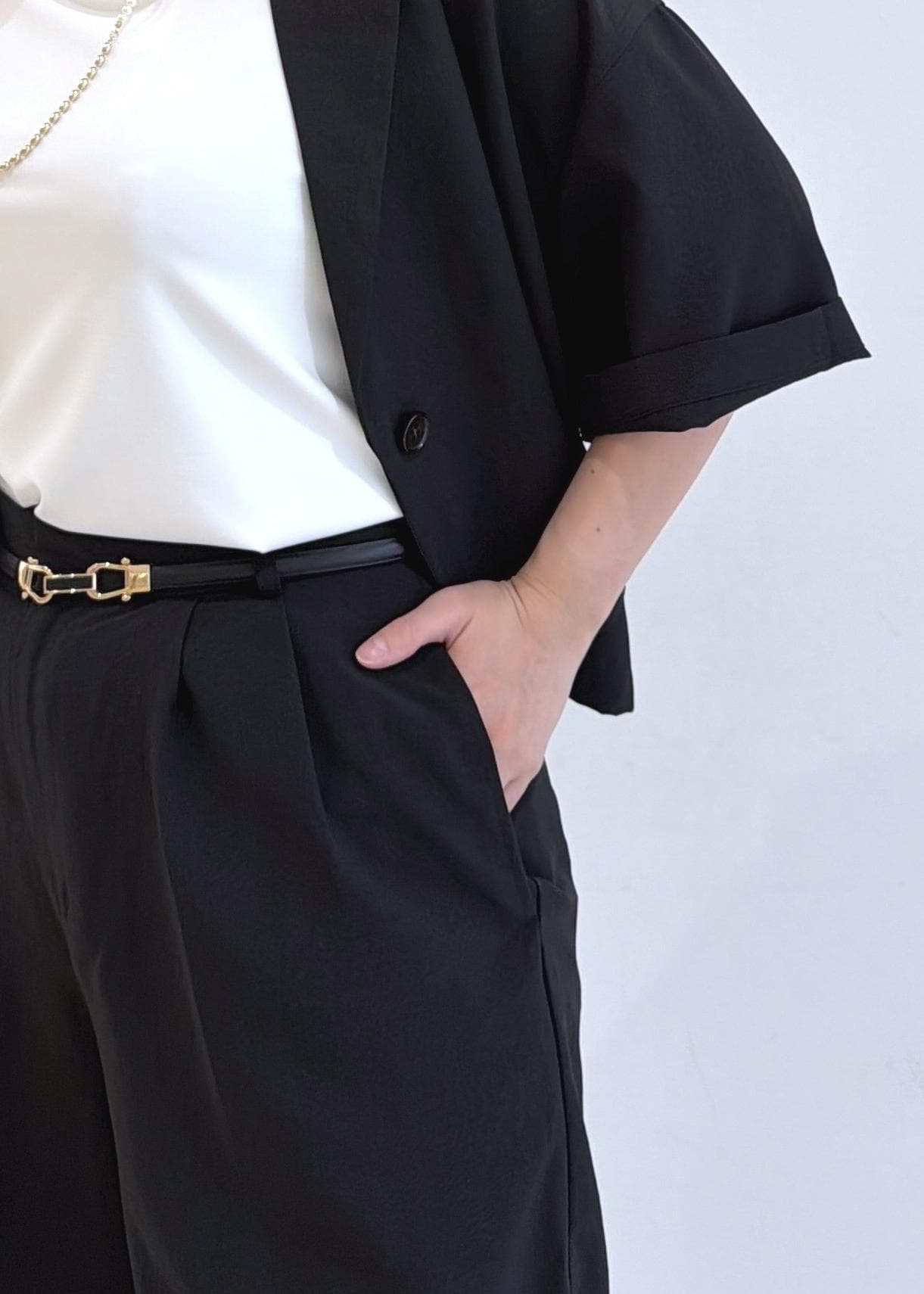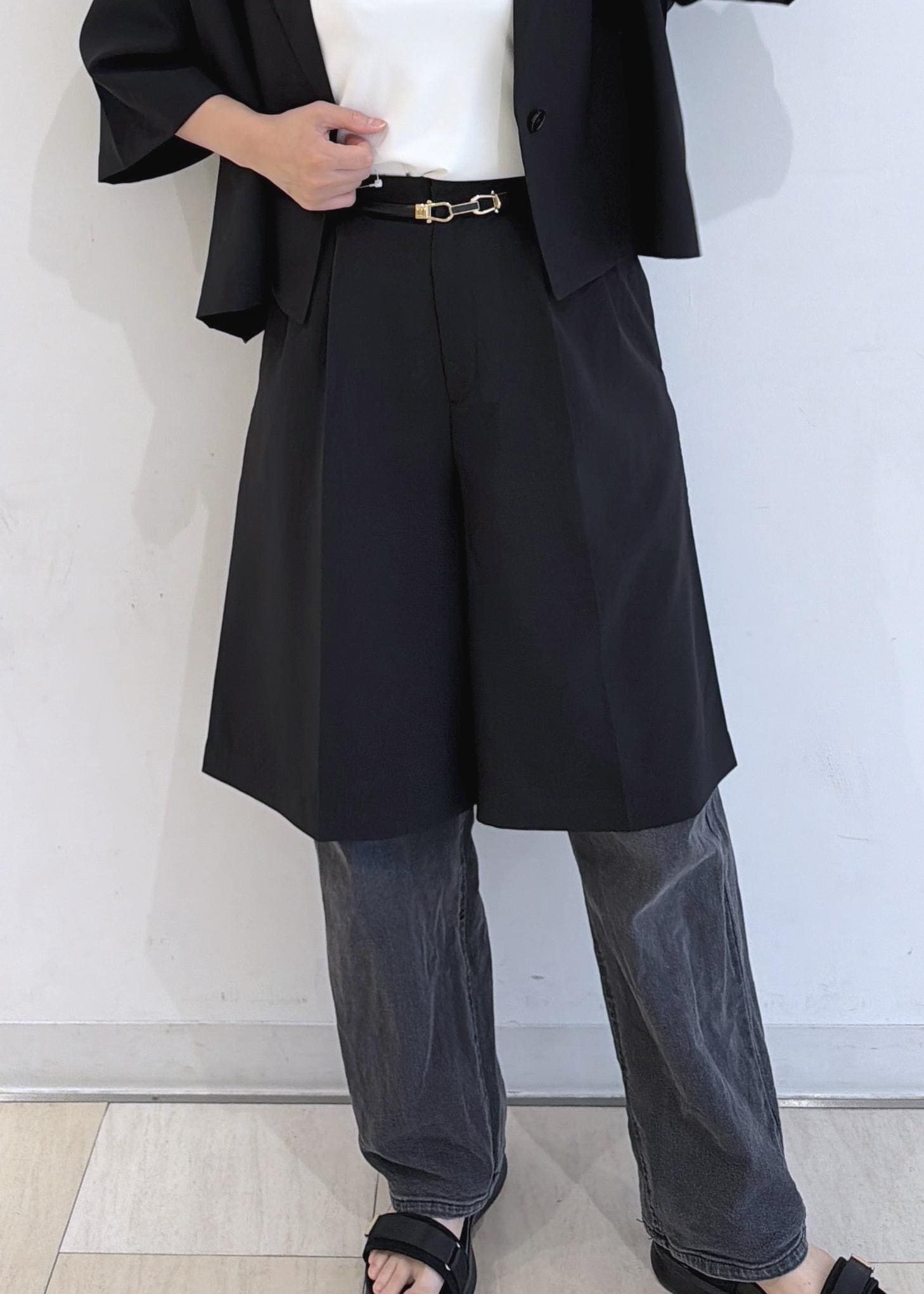ROPÉ PICNICエアリーリネンライク タックハーフパンツ/UVカット・速乾ブラック / F¥4,994レビュー156cmで膝くらいの丈感です!