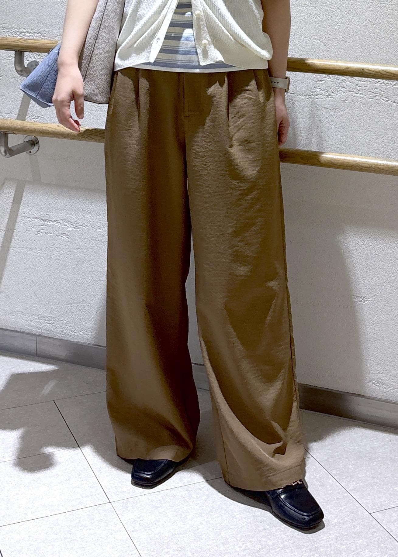 エアリーリネンライク タックワイドパンツを使ったカジュアルコーデ。