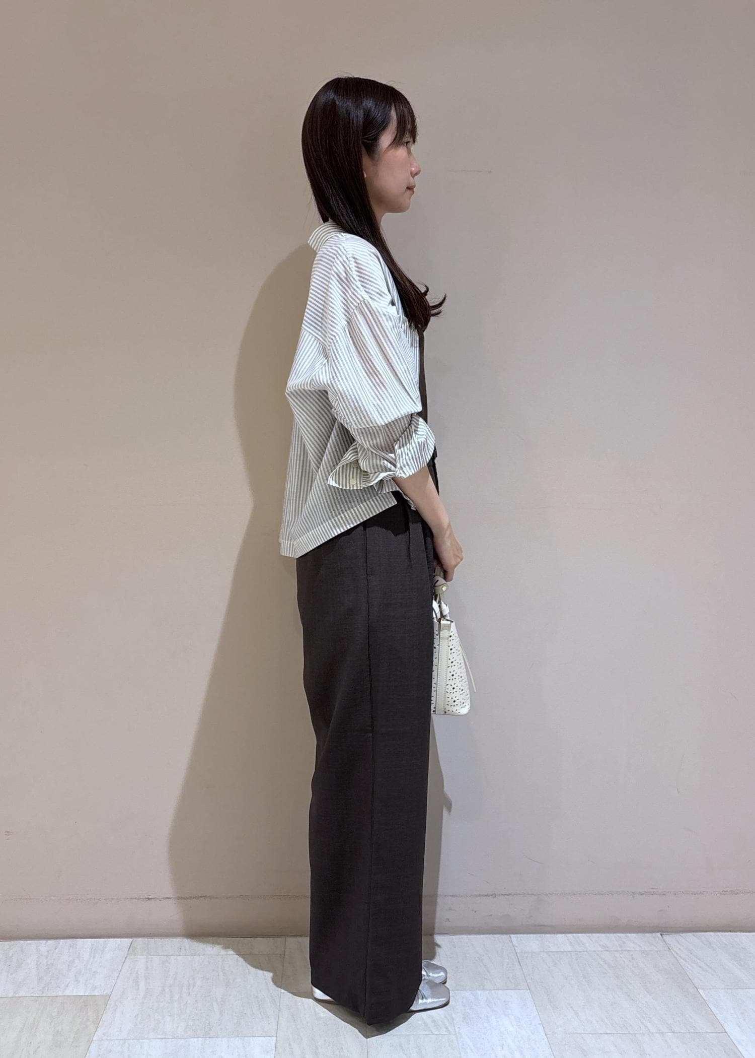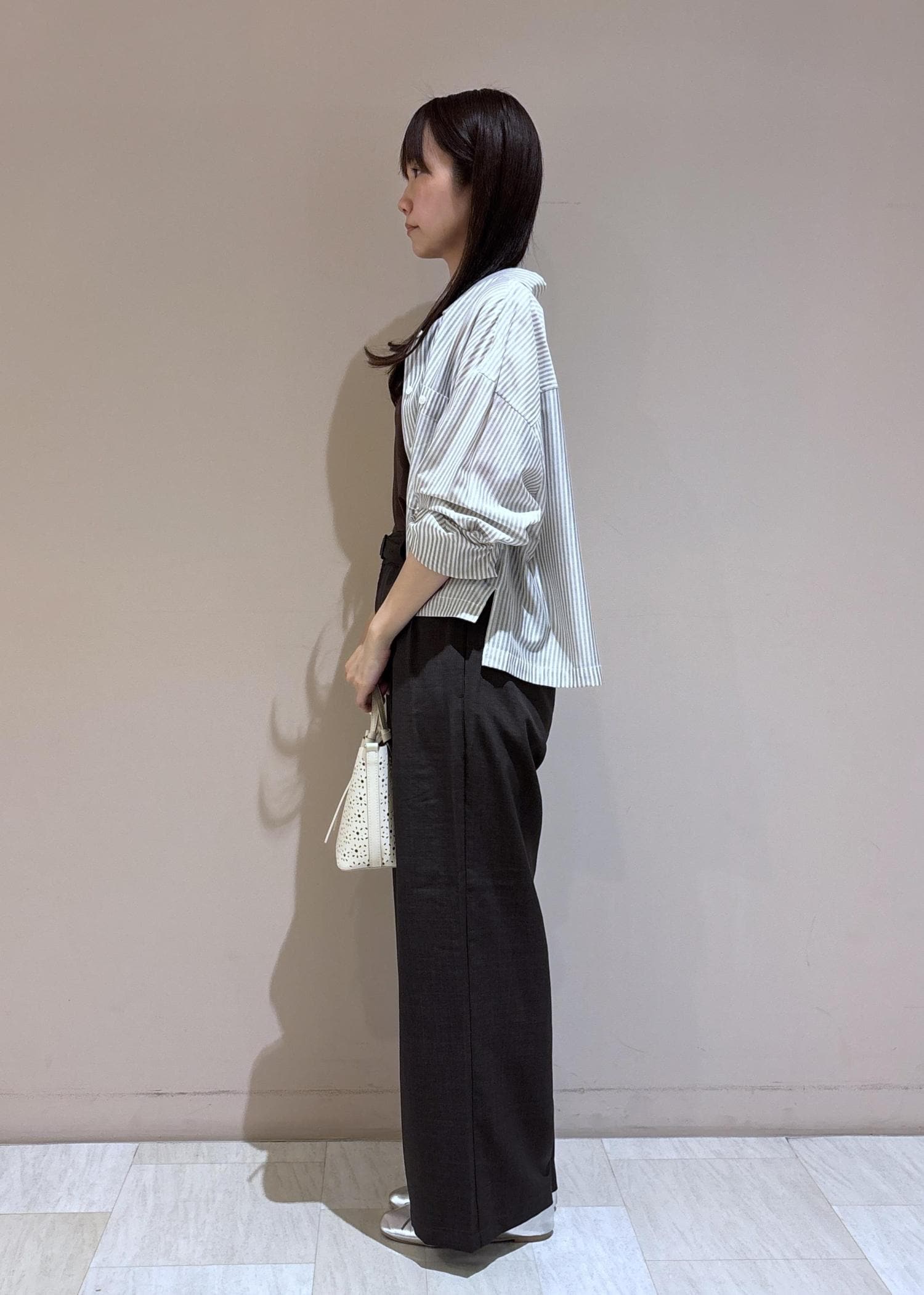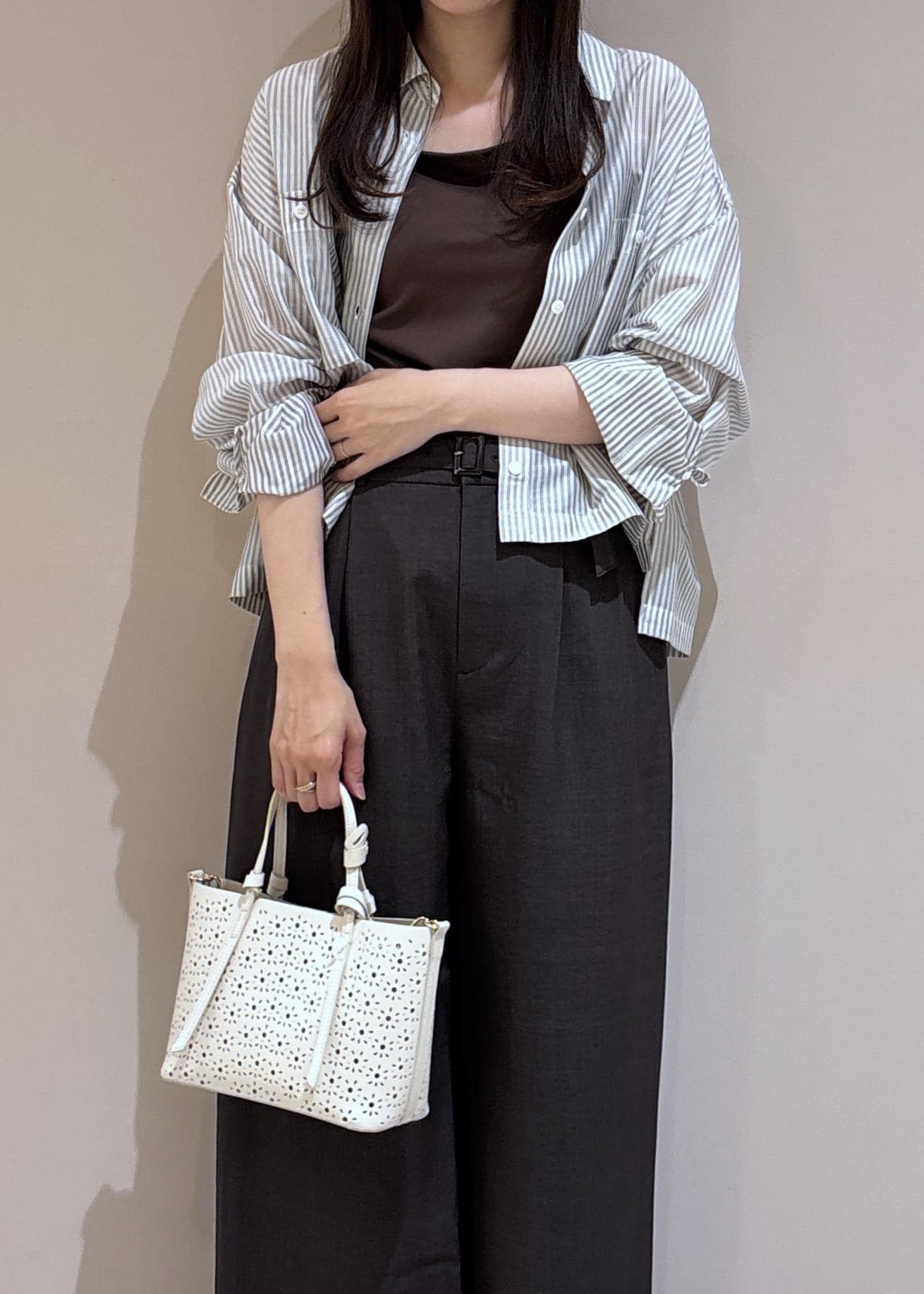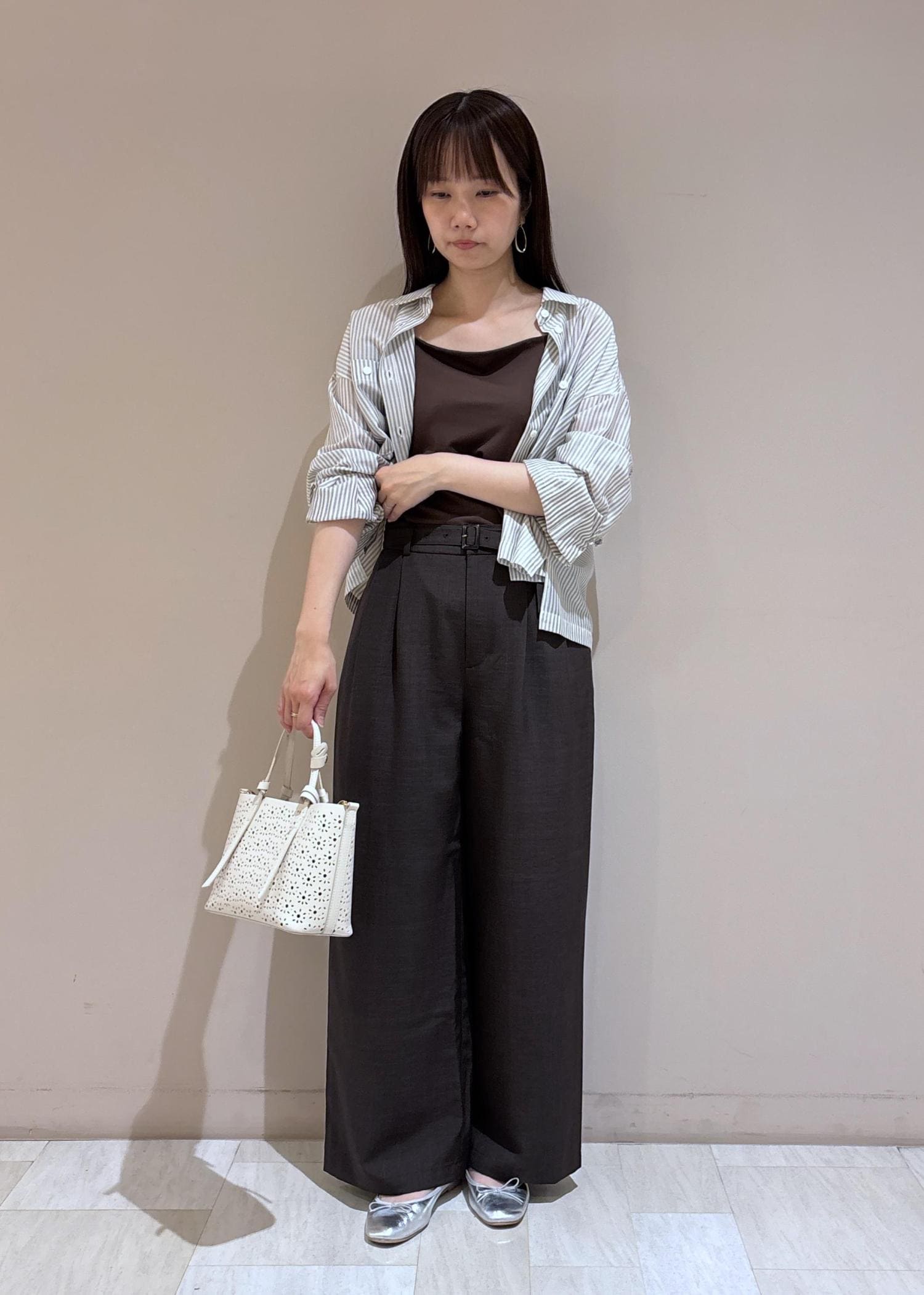 ブラウンのキャミソールとパンツに透け感のあるシャツを合わせて、初夏におすすめの爽やかなブラウンのコーディネートにしてみました。