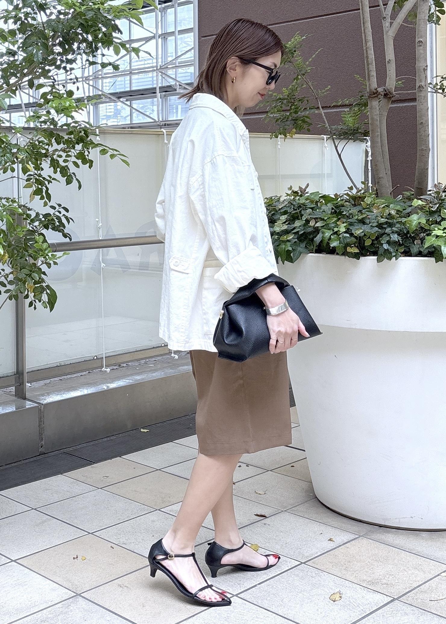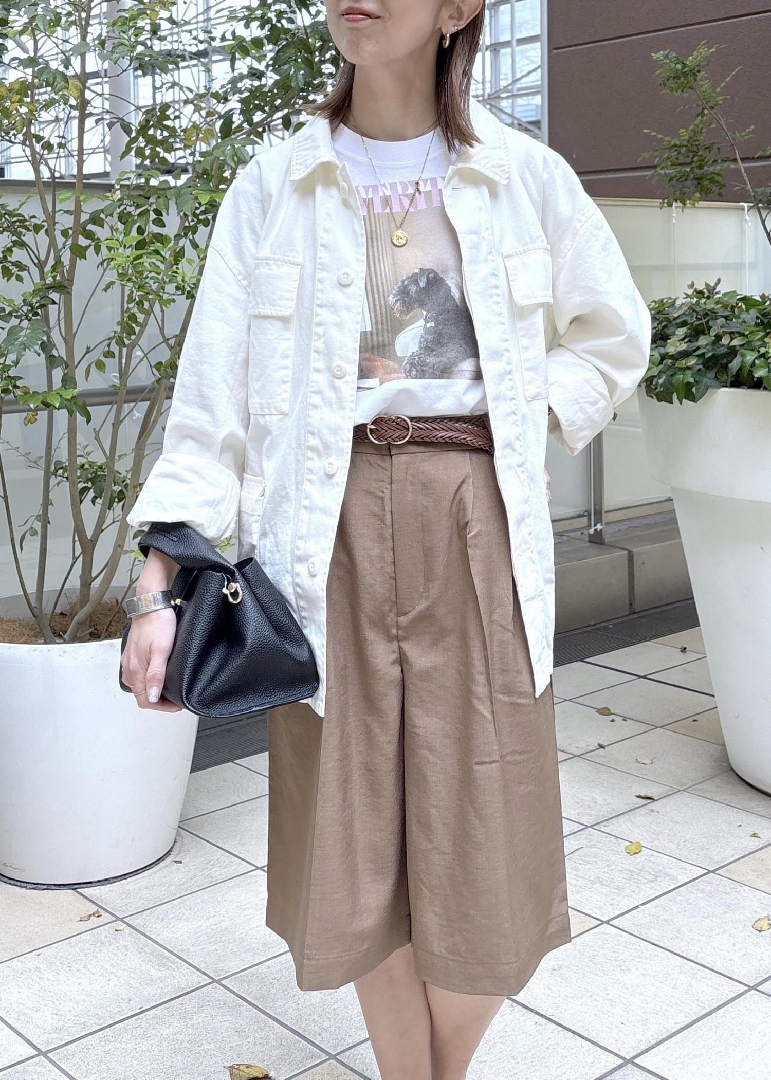 ホワイト×キャメルの色合わせが大人カジュアルな印象に。