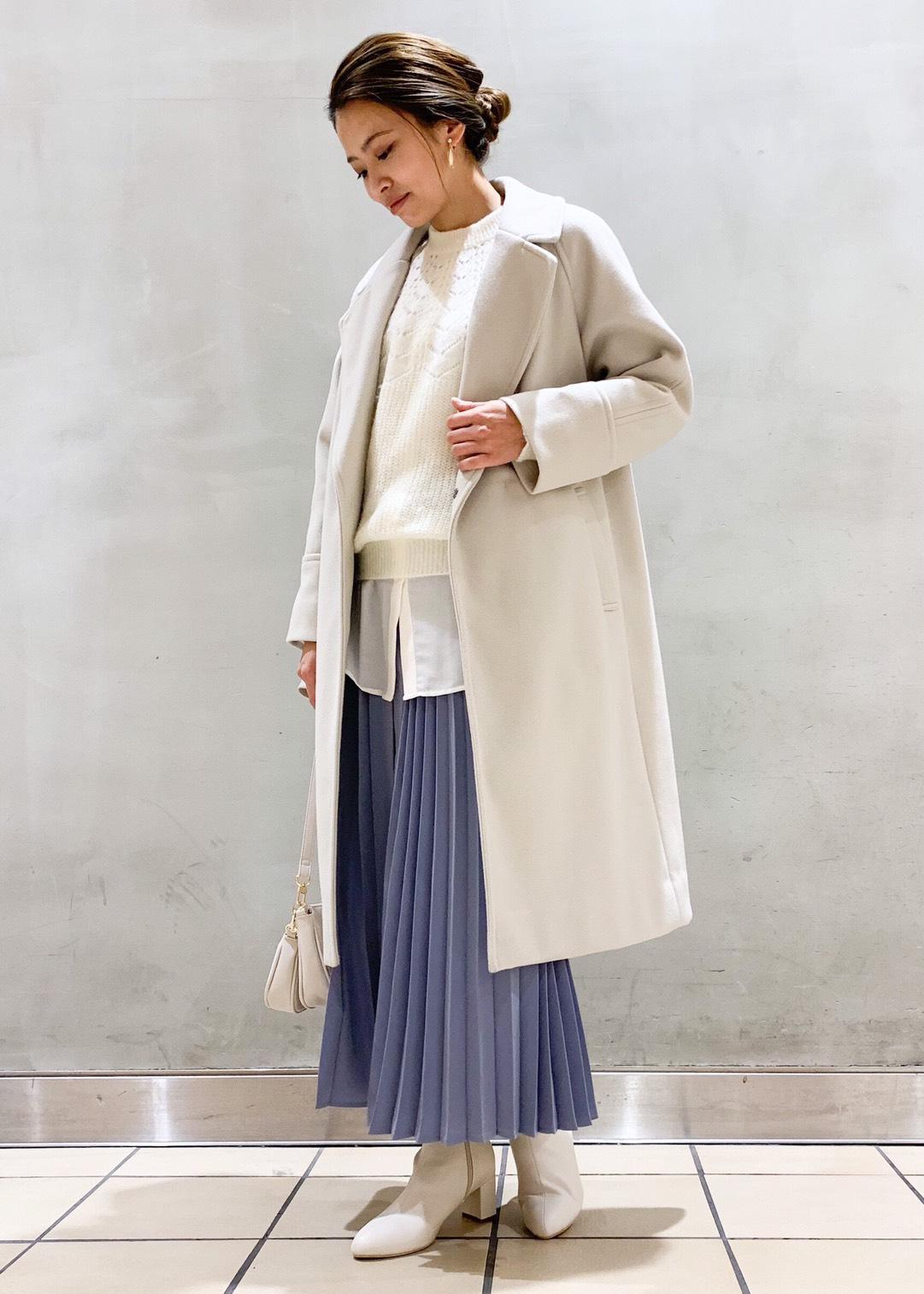 ロングコートはマニッシュになりすぎないオーバーチェスター型で、ニットに合わせても袖の通しやすいシルエットです。