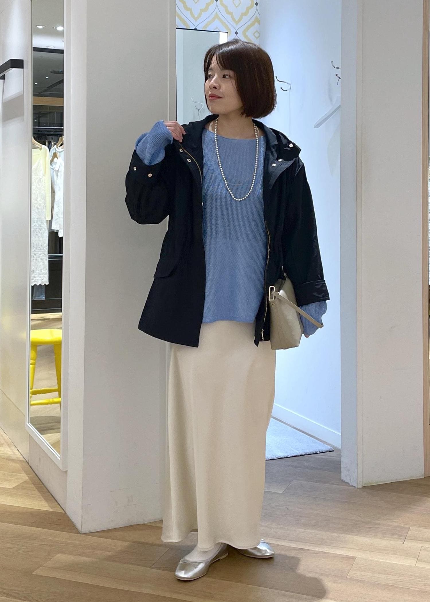 ブルーのサテンパンツがアクセントになるニットを着たキレイめコーデです。ふわっと柔らかなフォックス混のニットにサテンジョグパンツと意外性のあるアイテム同士を組み合わせるとトレンド感がupします!