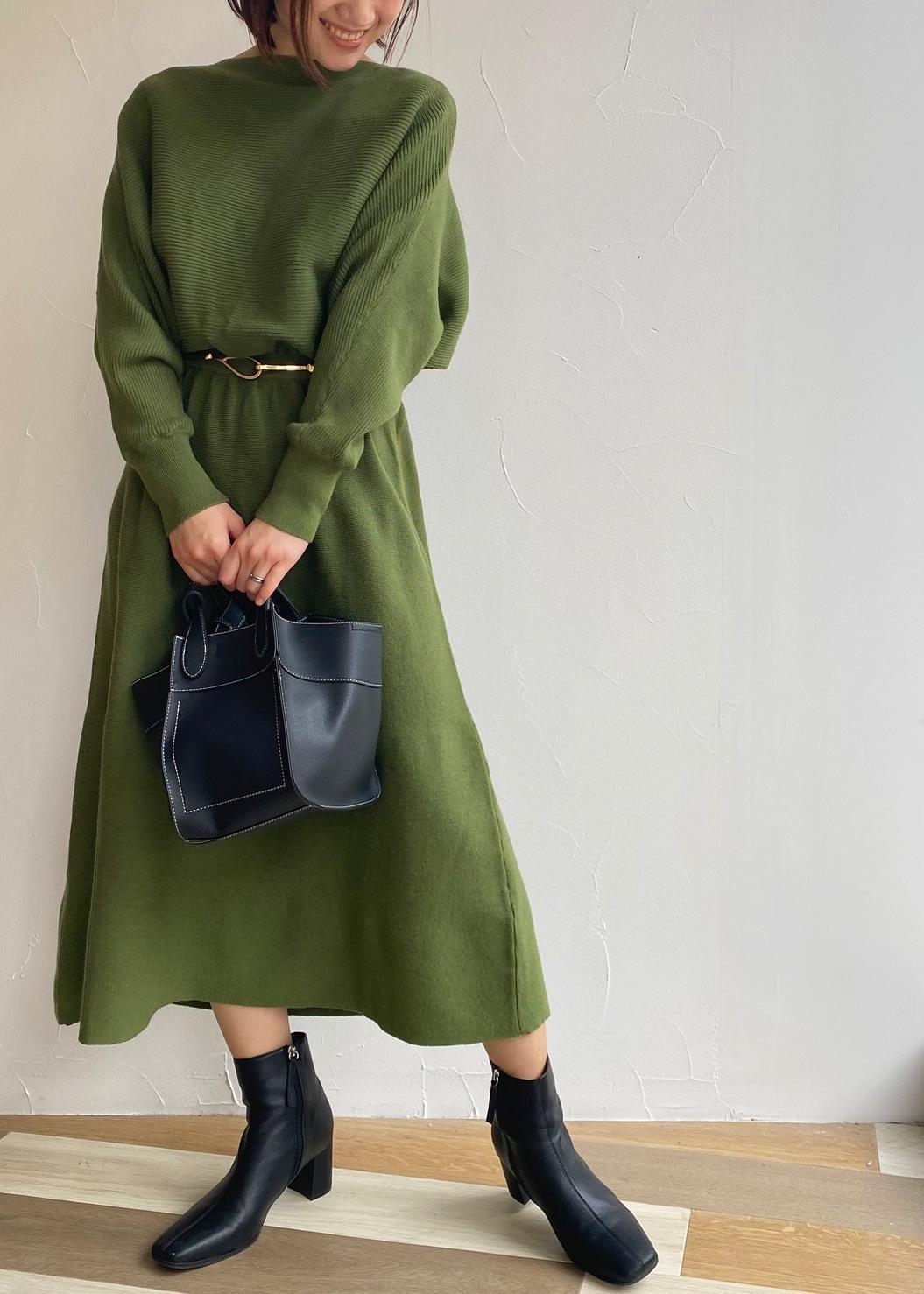 シンプルなニットワンピースですが深めのグリーンが目をひきます!ショートブーツで合わせるとバランス良くスタイルアップします!