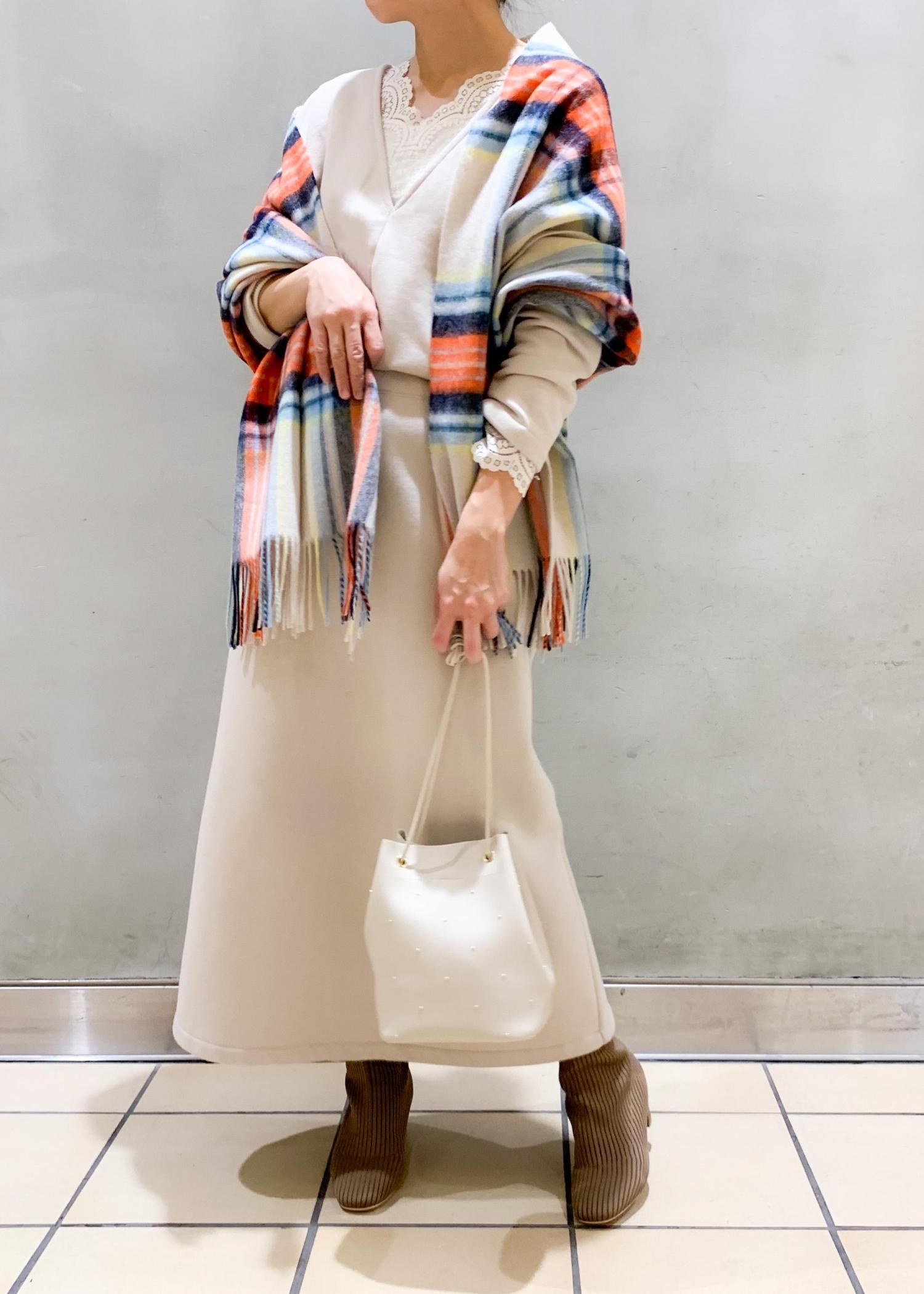 ウールのチェック柄ストールを首元にボリュームを出して巻いてポイントに。