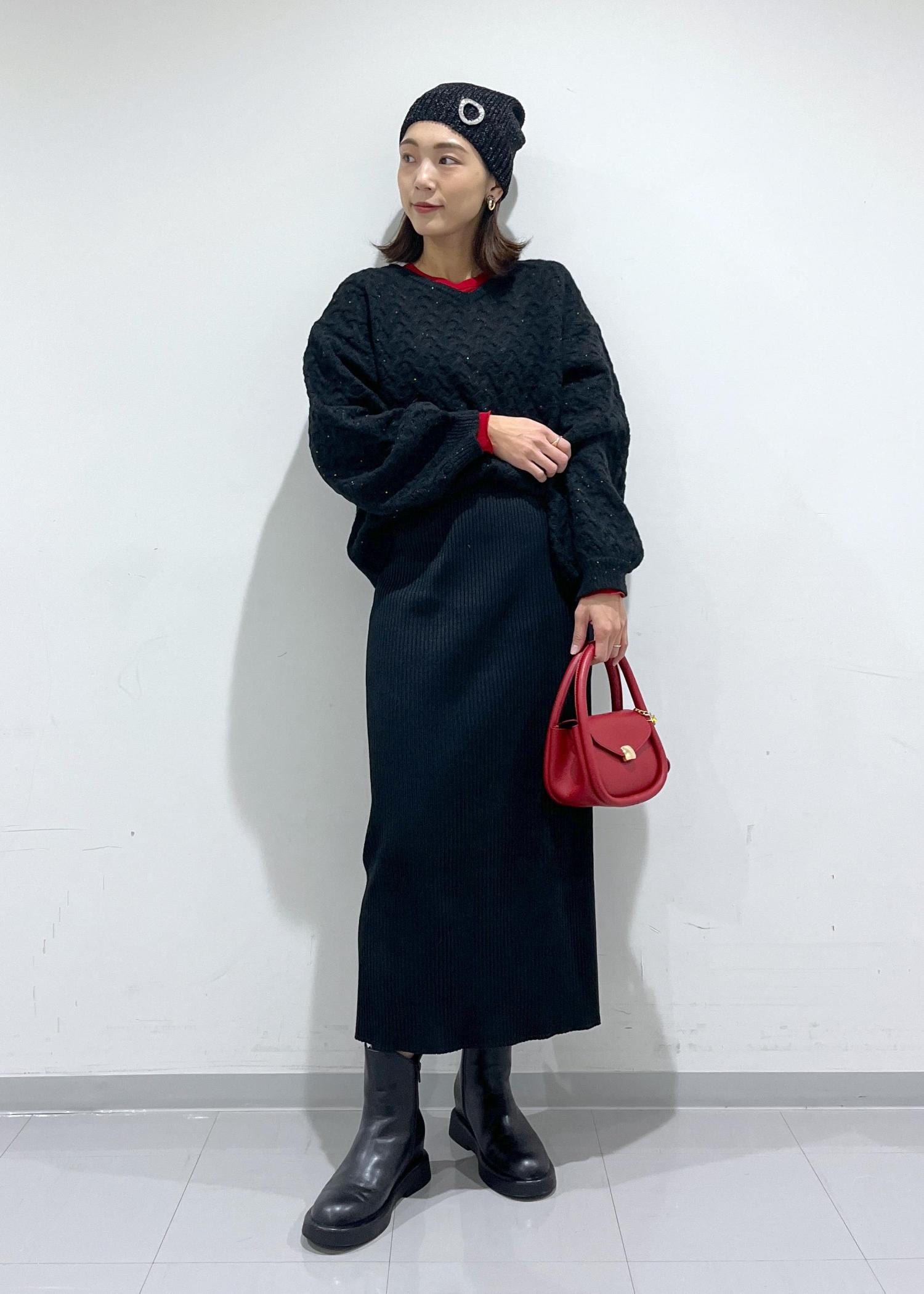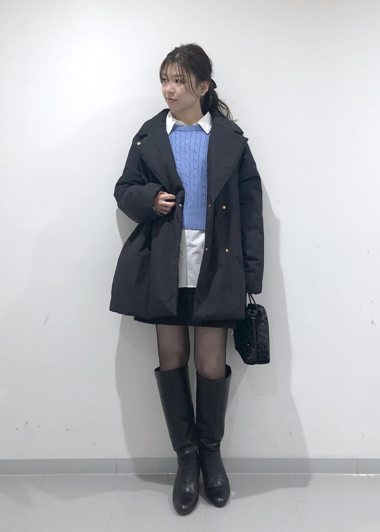 オーバーサイズのロングコートと レザー調スカートを合わせた 今年らしいコーデです。
