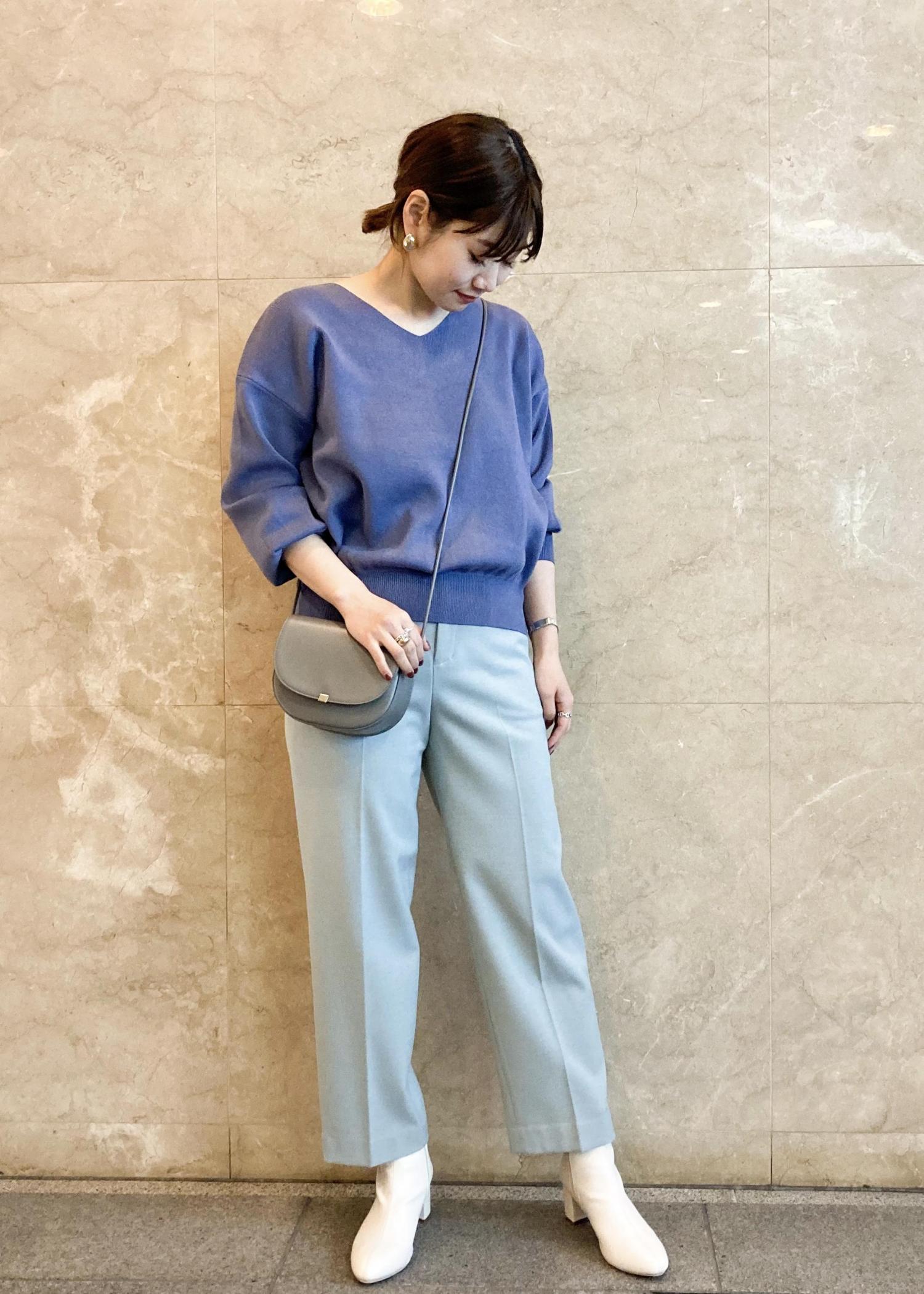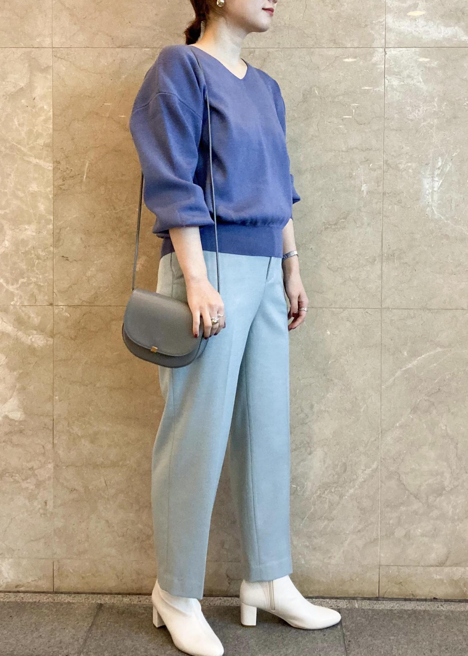 ブルー系のワントーンでまとめたシンプルなスタイリング。 明るめのカラーでまとめてこなれ感を。 シンプルなアイテムで、コートのデザインがアクセントになります。 今年らしいホワイトカラーを差し色にし、スッキリとまとめています。