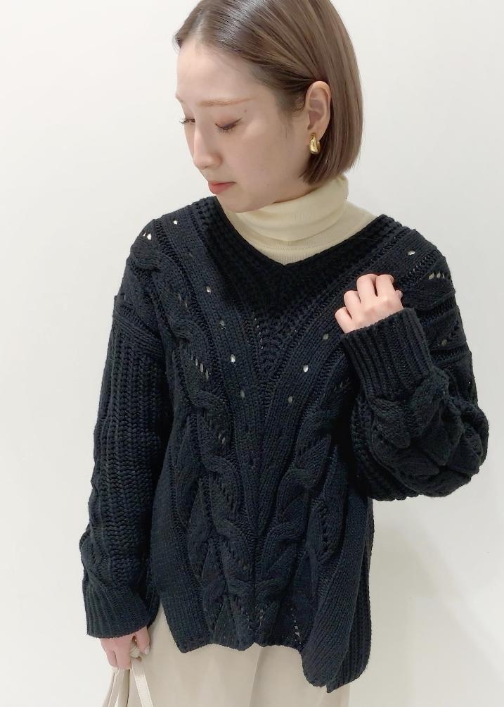 レイヤード次第で色々な着こなしができる透かし編みニットを使ったコーディネートです。