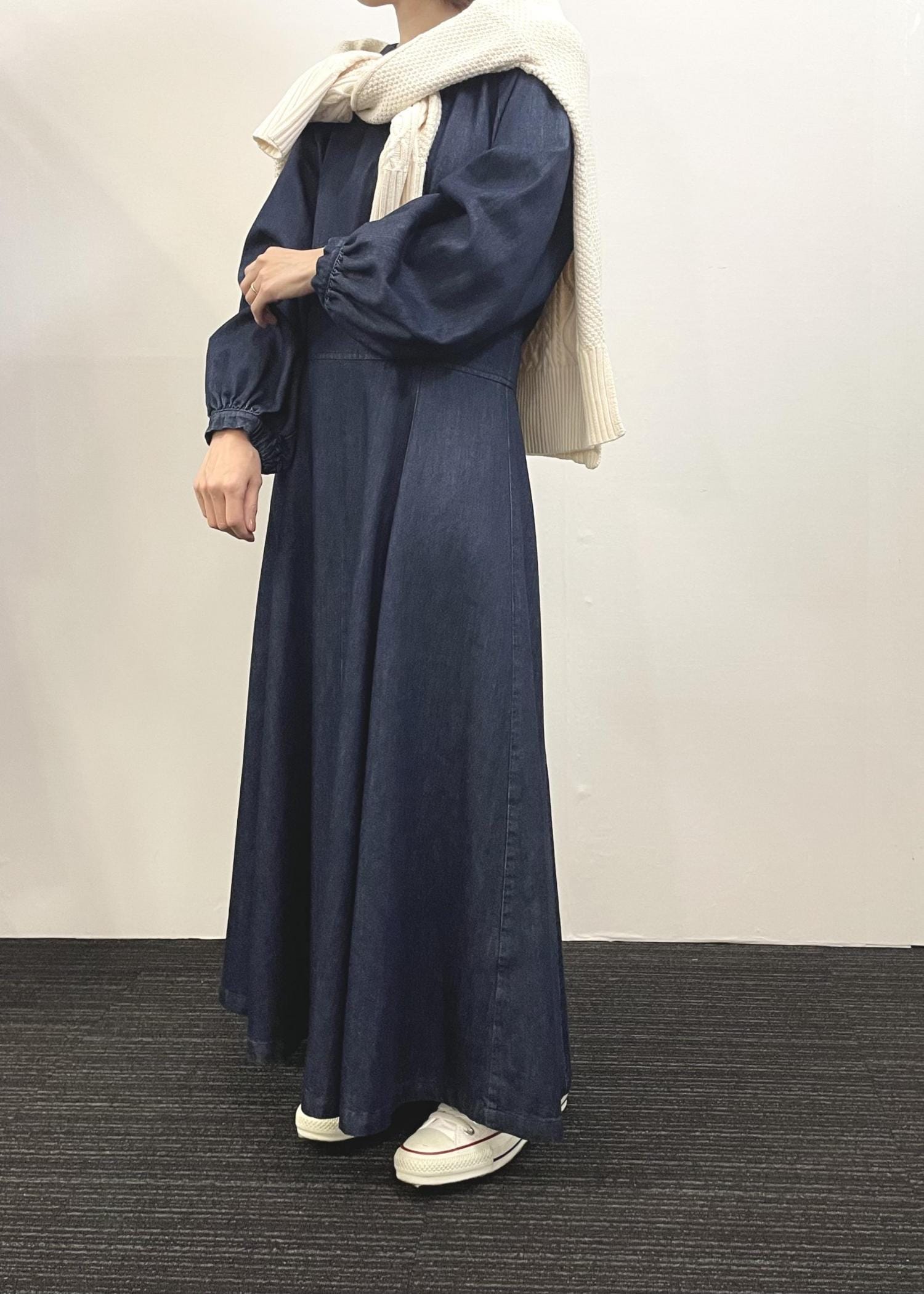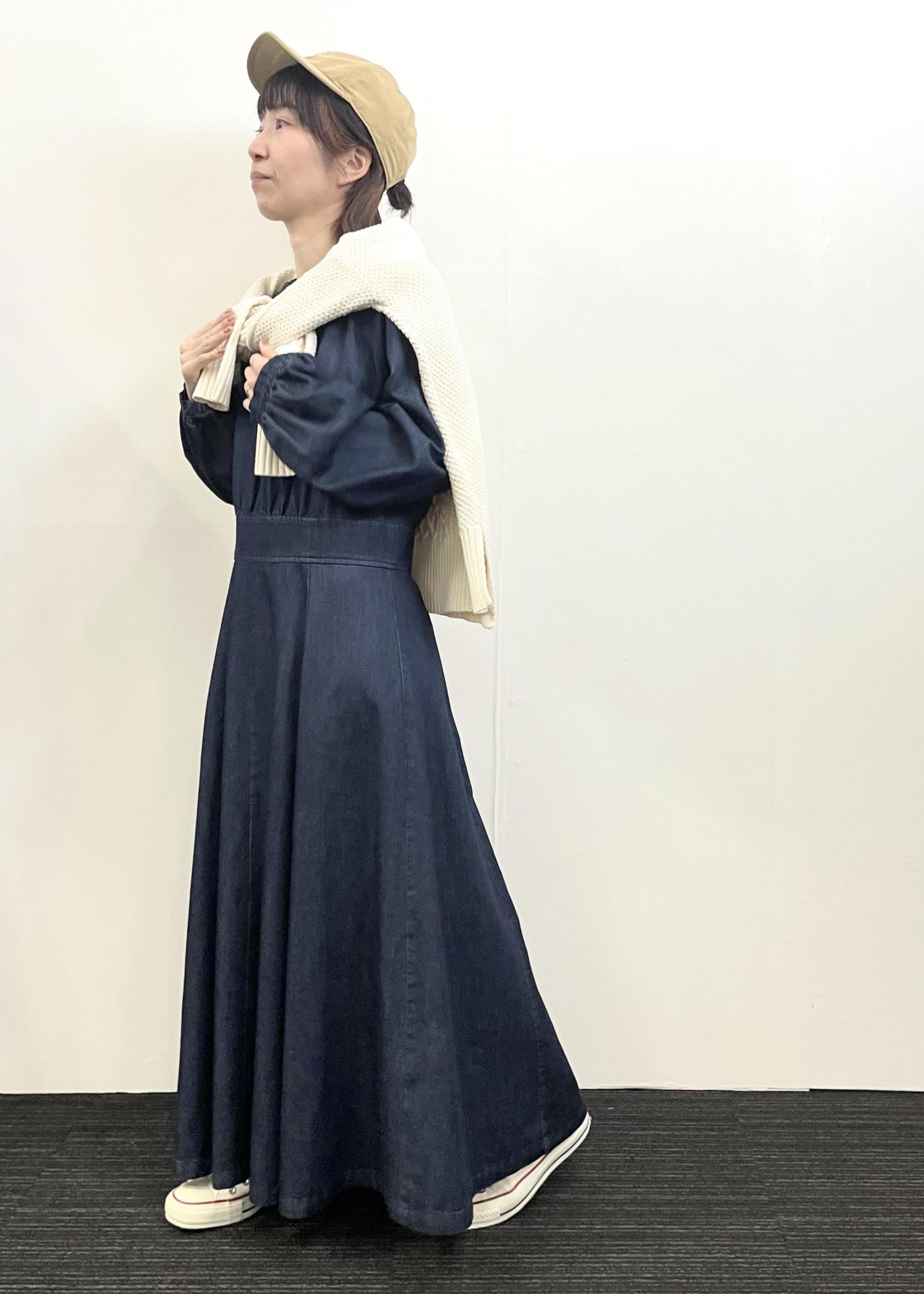 低身長さんにもおすすめトレンドのデニムワンピ! ウエストの程よい高さの切替がバランス良く 軽くサラッとした生地で着心地もよいです。 1枚でキレイめに合わせてもいいし こんな風にカジュアルダウンするのも○♪