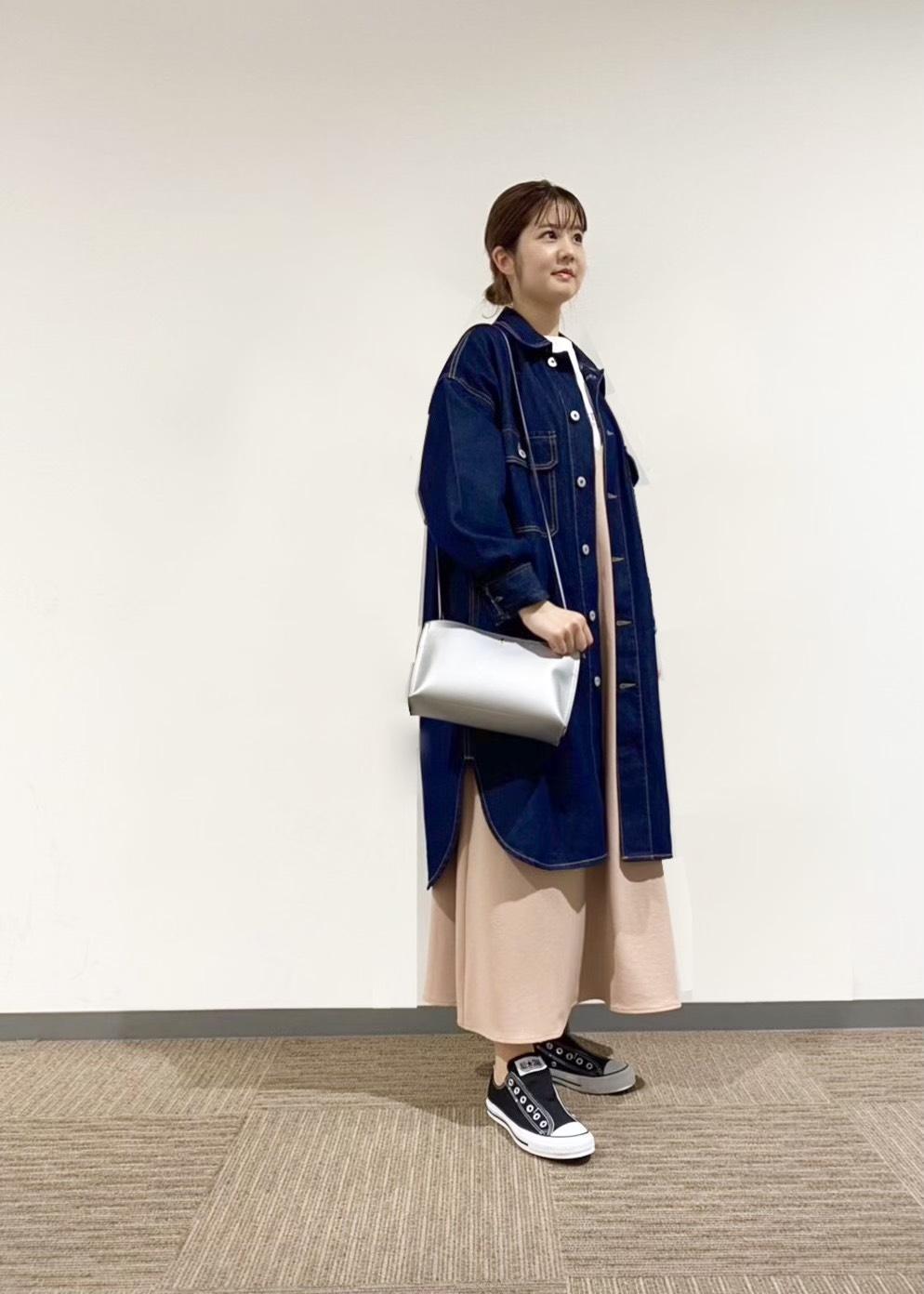 春らしいペールトーンのワンピースにアクセントとしてデニムのジャケットを羽織りました。
