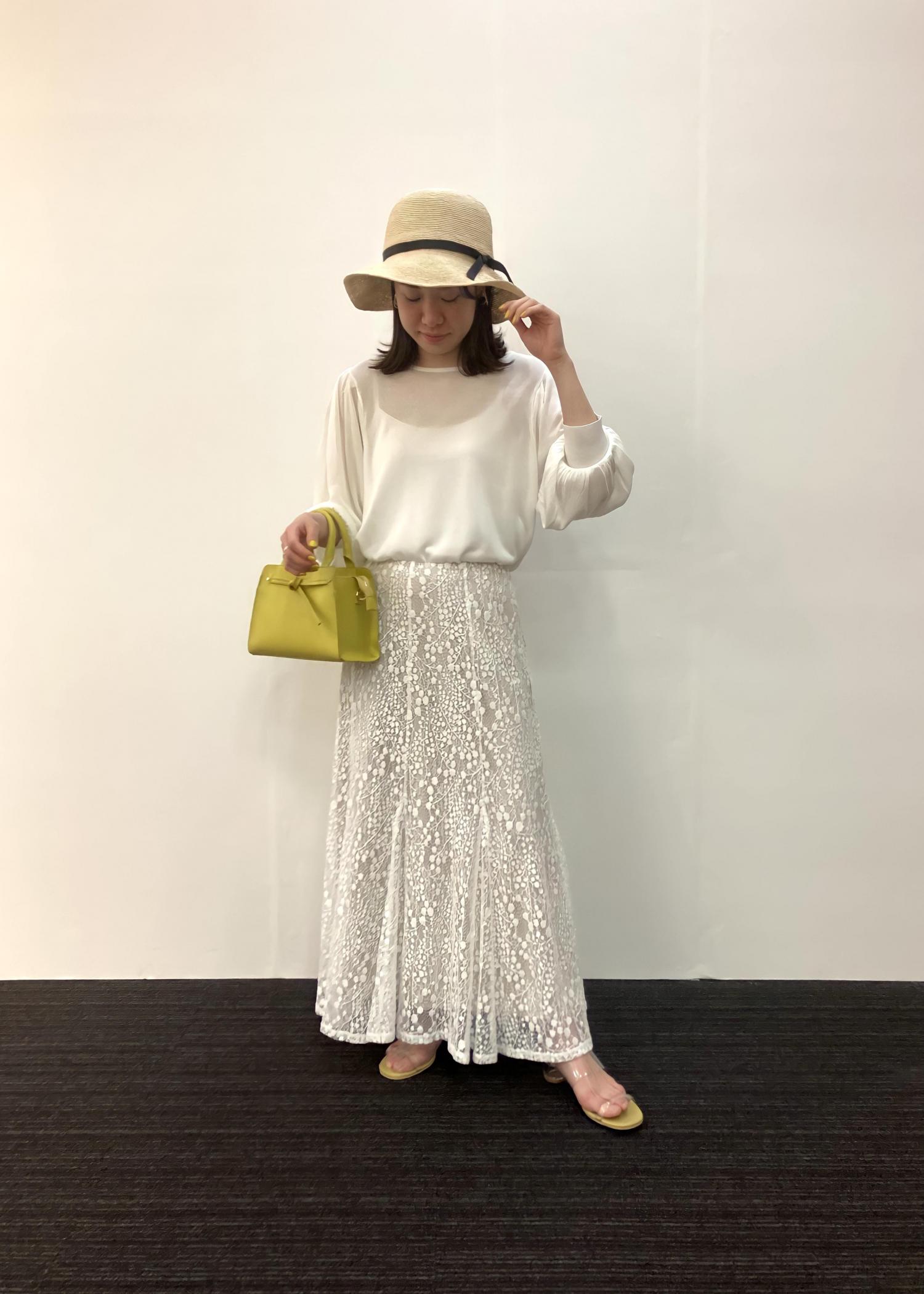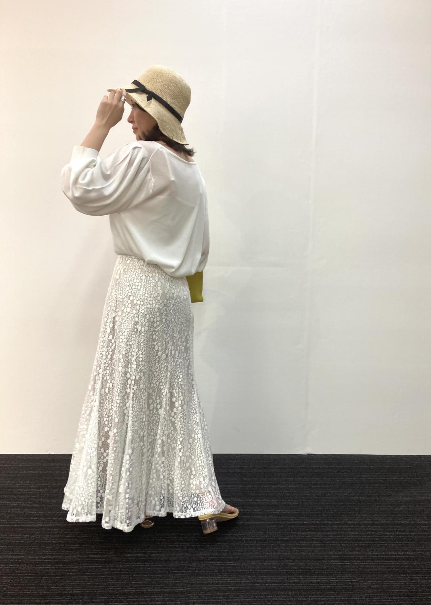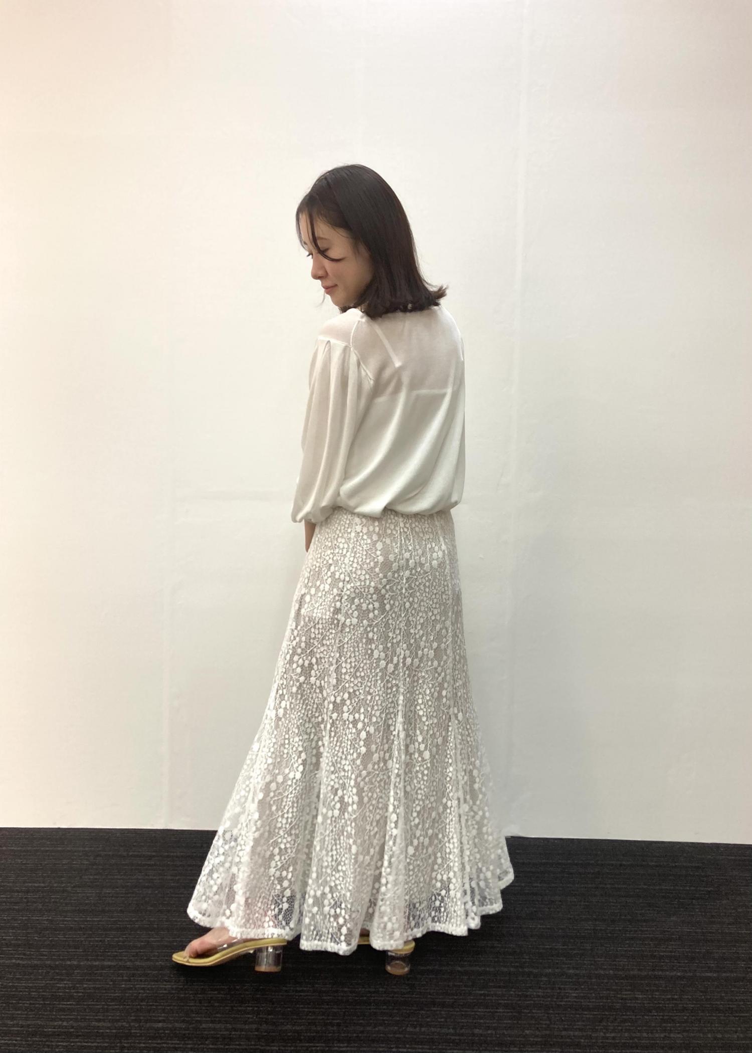 主役のレーススカートが際立つように、透け感のあるトップスを合わせて軽さを出しました。