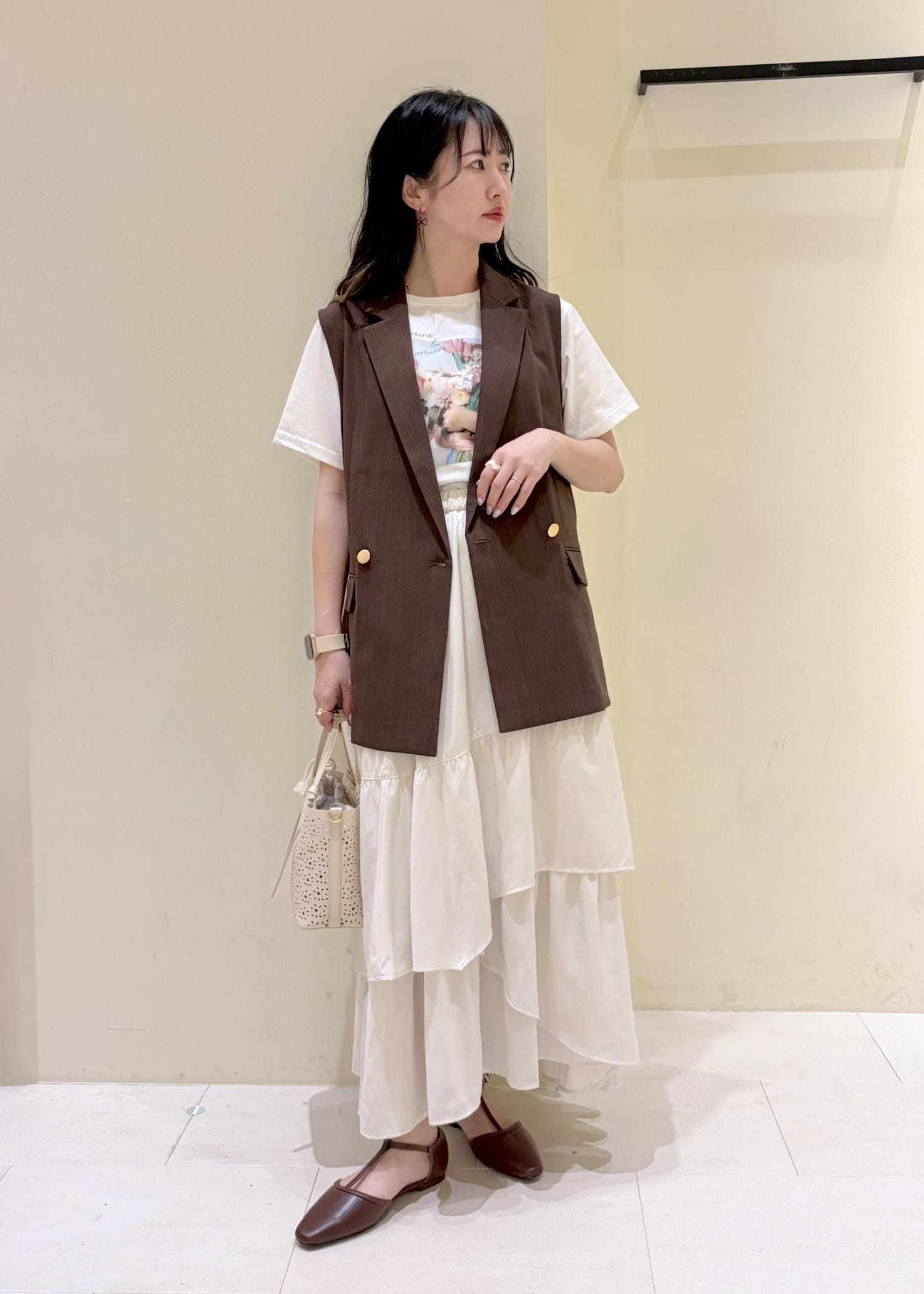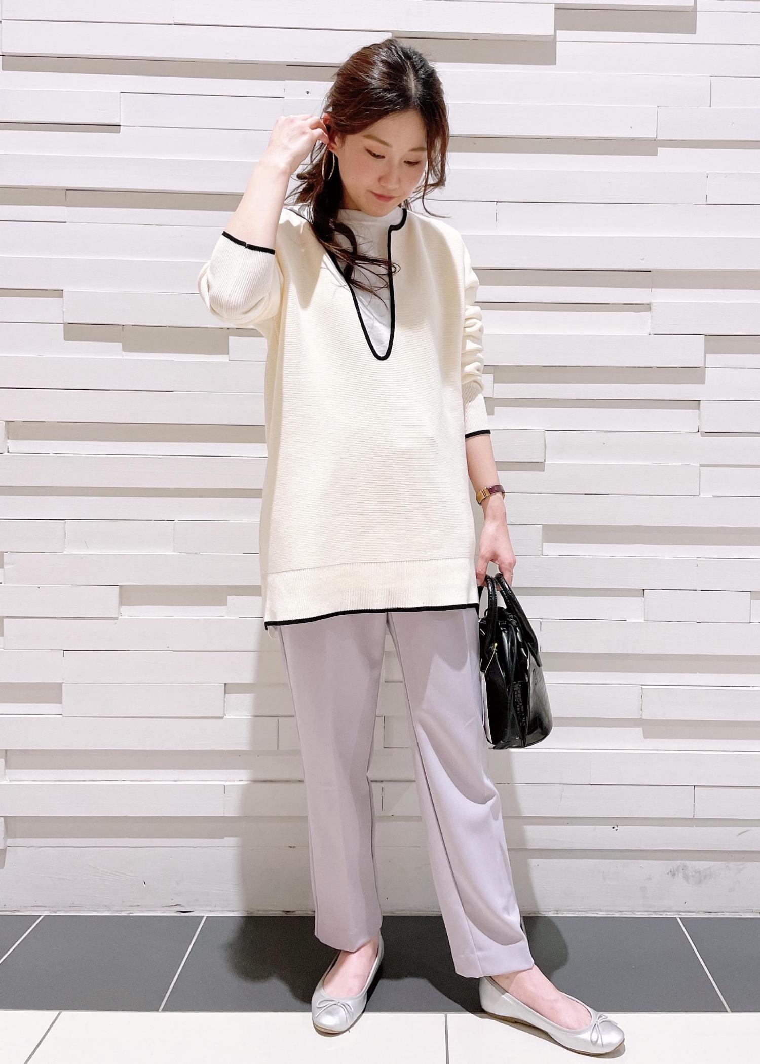 リラックスシルエットニットとロンTのレイヤードスタイルに、テーパードパンツを組み合わせてラフ過ぎないスタイリングに。 深Vネックはトレンドアイテムで、Vネック部分は配色ラインが入っておりシンプルながらも存在感があります。 この春のレイヤードスタイルにおすすめです。