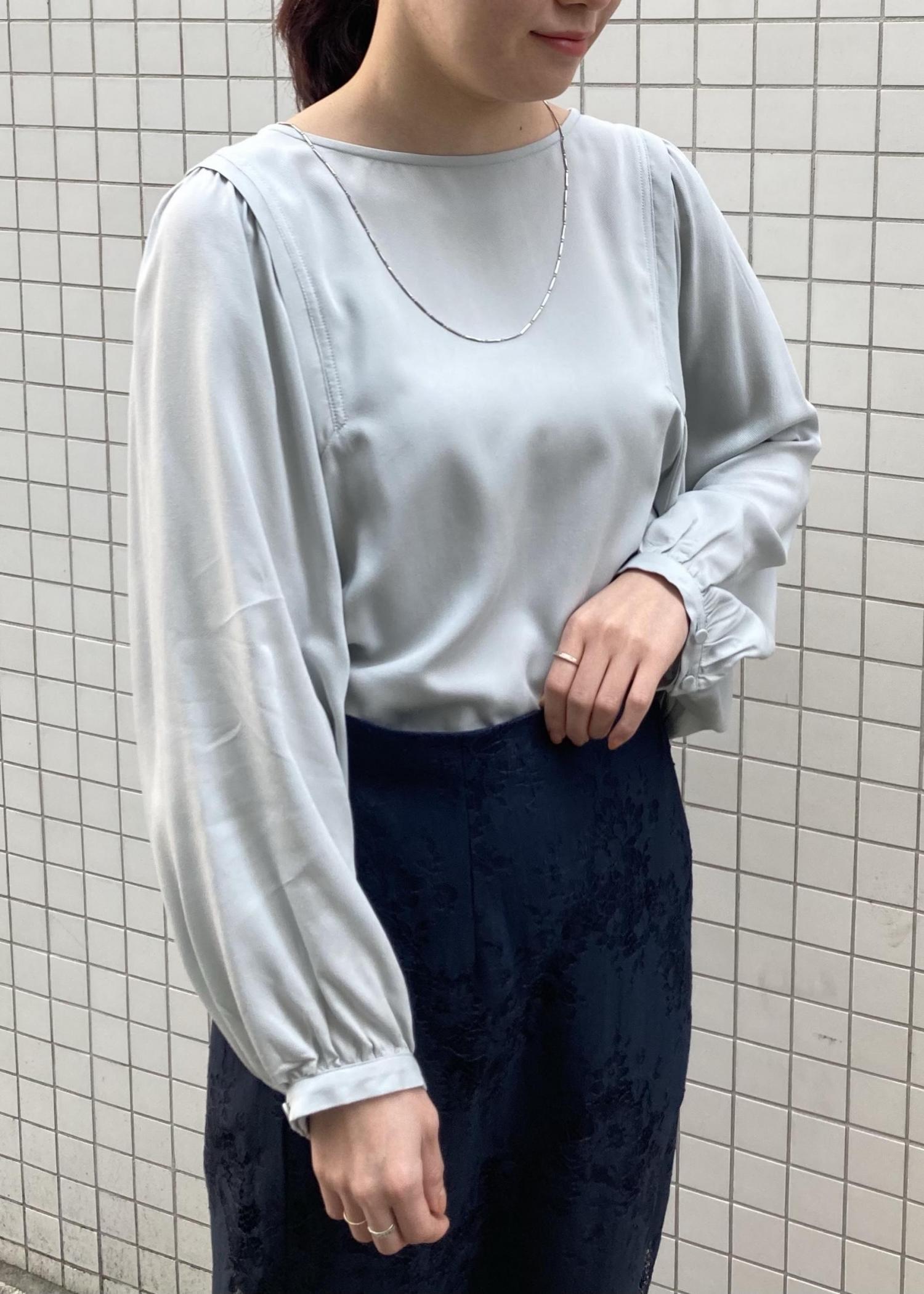 レーススカートをメインに、通勤におすすめのスタイルにしました。 ボリュームスリーブブラウスはインすることで、スッキリとさせました。 レーススカートがアイラインなので、ゆったりしたブラウスと相性がいいです。 チェーンネックレスを合わせるとトレンド感がプラスされます◎