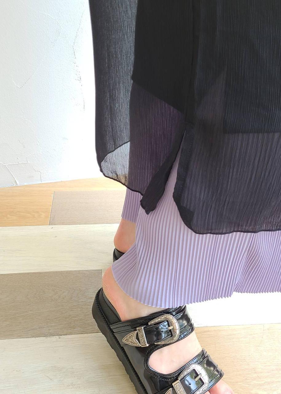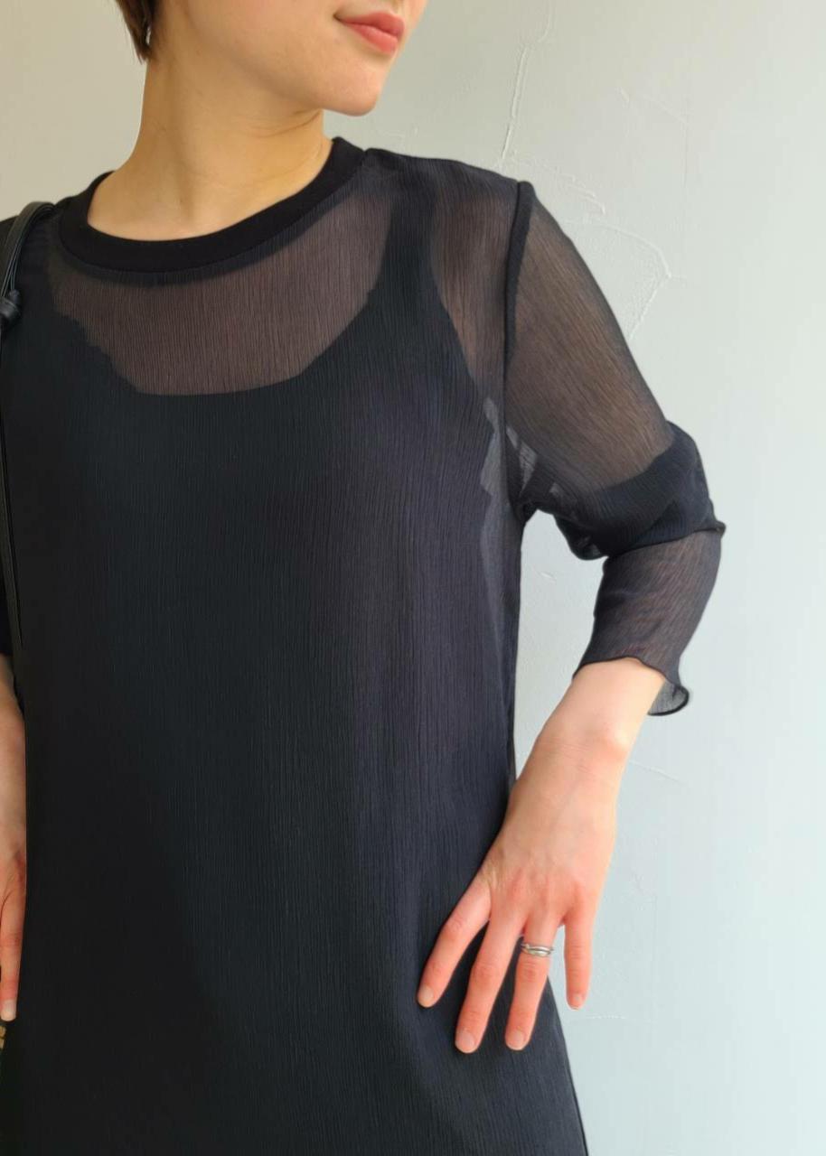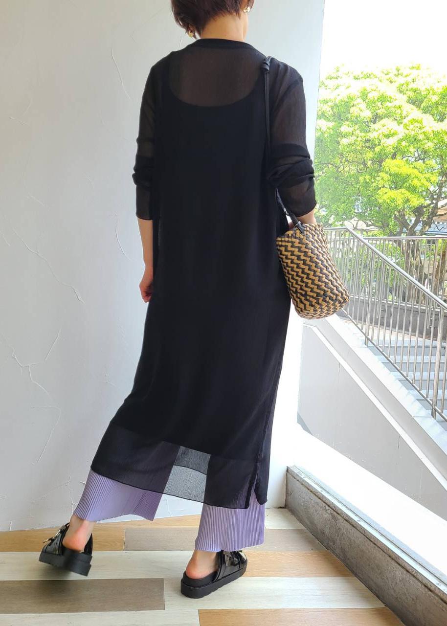 トレンドのシアー感がかわいいワンピースを使ってコーディネートです! ブラック系でシックにまとめて、シンプルに。 足元はサンダルをアクセント重厚感を出しました! 一枚で今年らしく決まるワンピース、おすすめです。