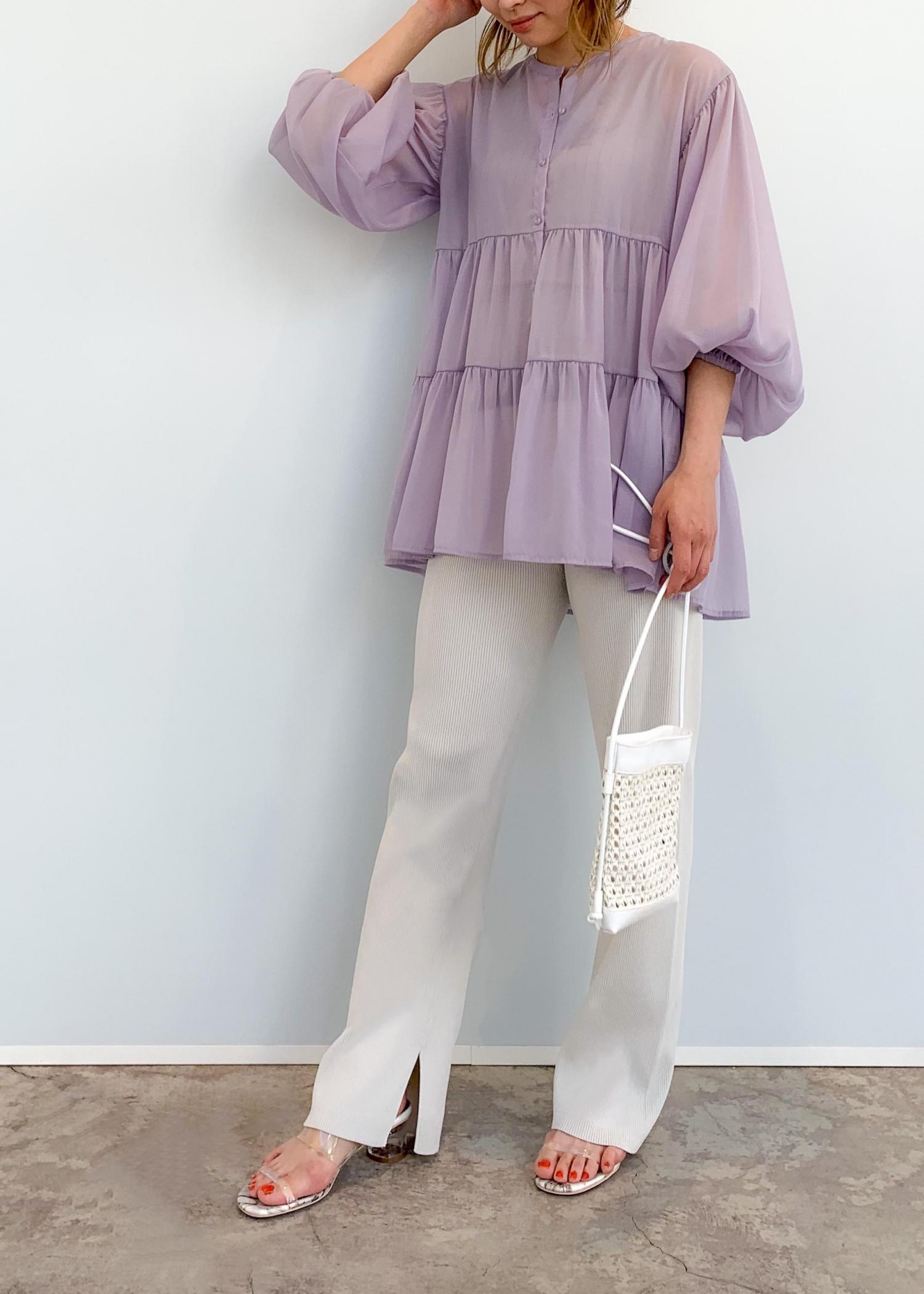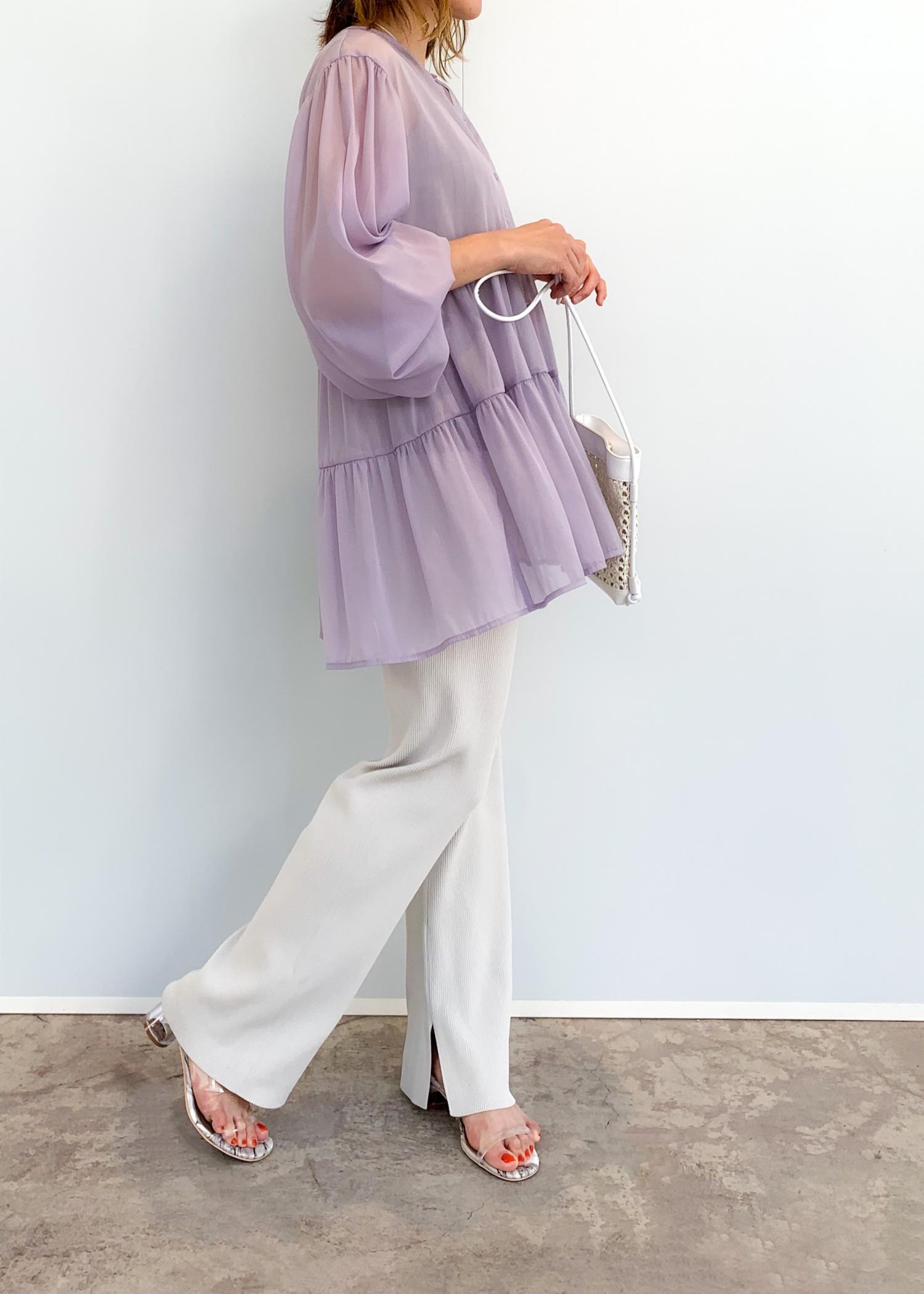 今季トレンドのティアードブラウスは、細かいラメとシアー感が女性らしい1枚です。