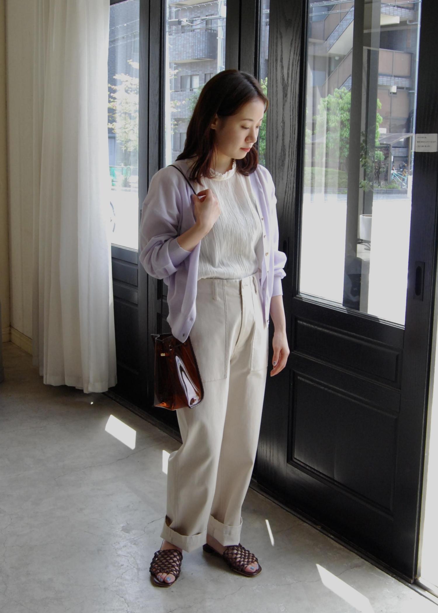 ホワイトでまとめたので、カーディガンのラベンダーでカラーを加えました。