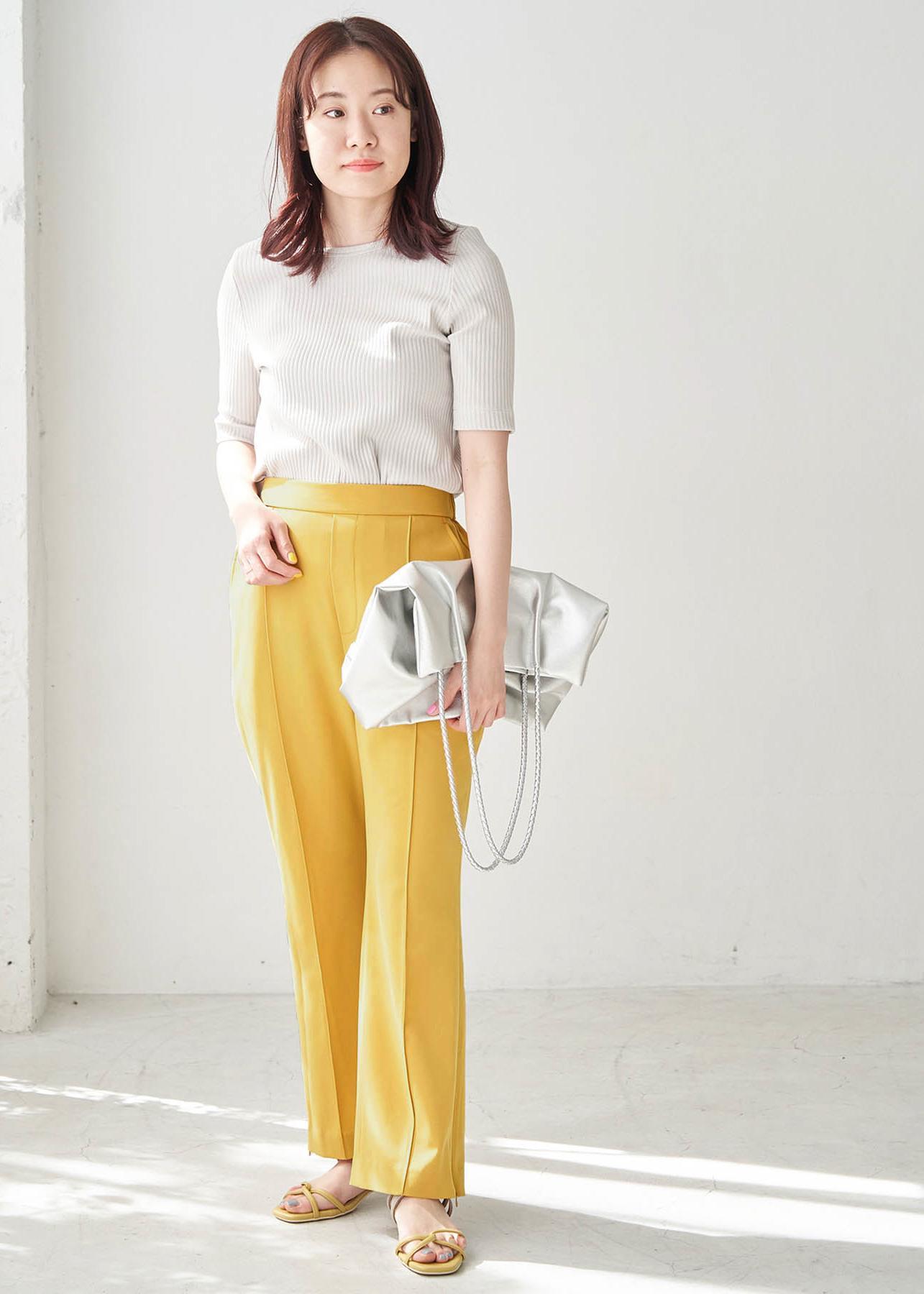 イエローのパンツを主役にコーディネートしました。 パンツとサンダルはイエローで合わせ、バッグのシルバーでアクセントを加えました。 バックが開いたデザインのトップスで、トレンド感を出しています!
