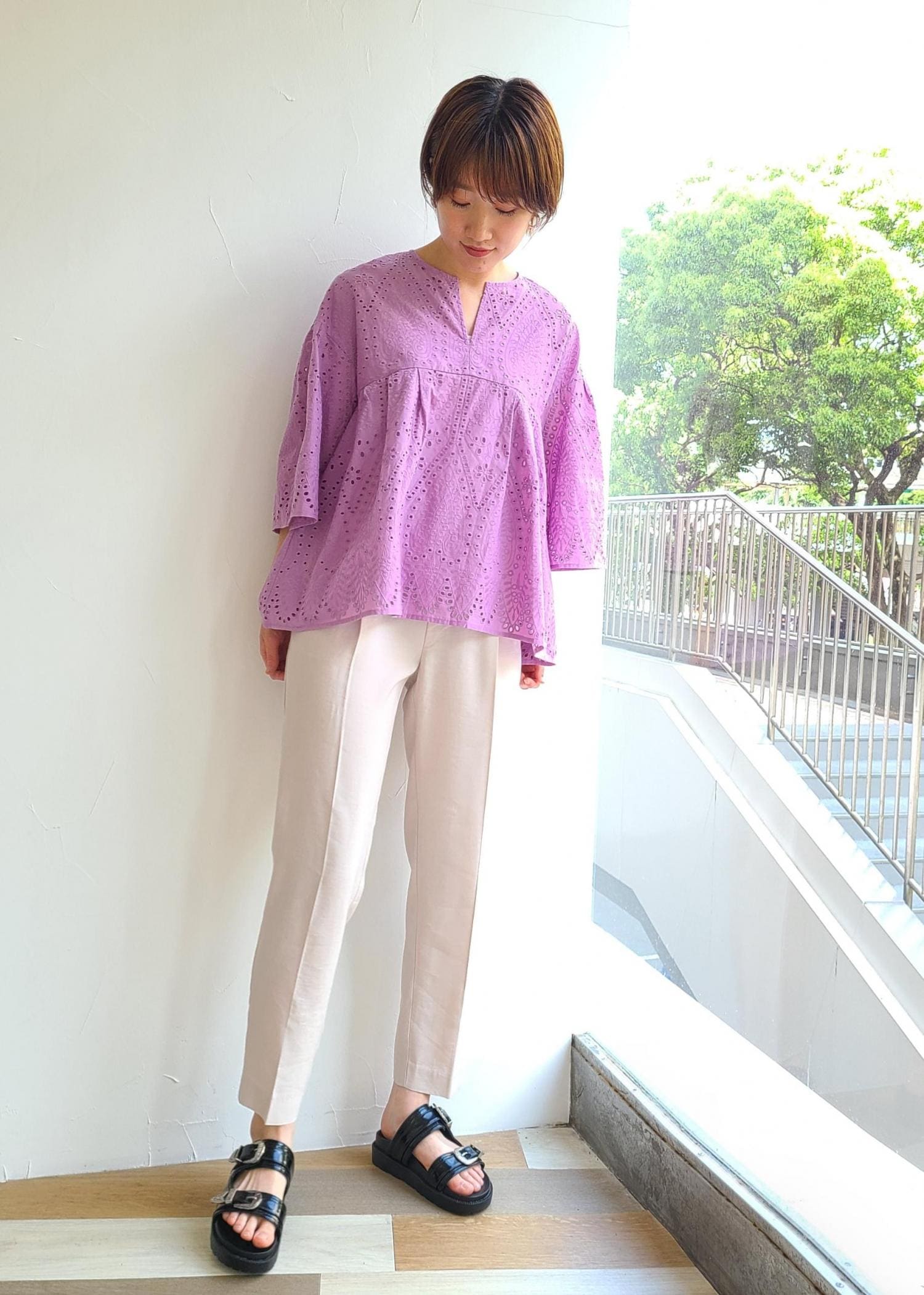 トップス、パンツ共に涼しげな素材で夏を感じさせるコーディネートにしました。