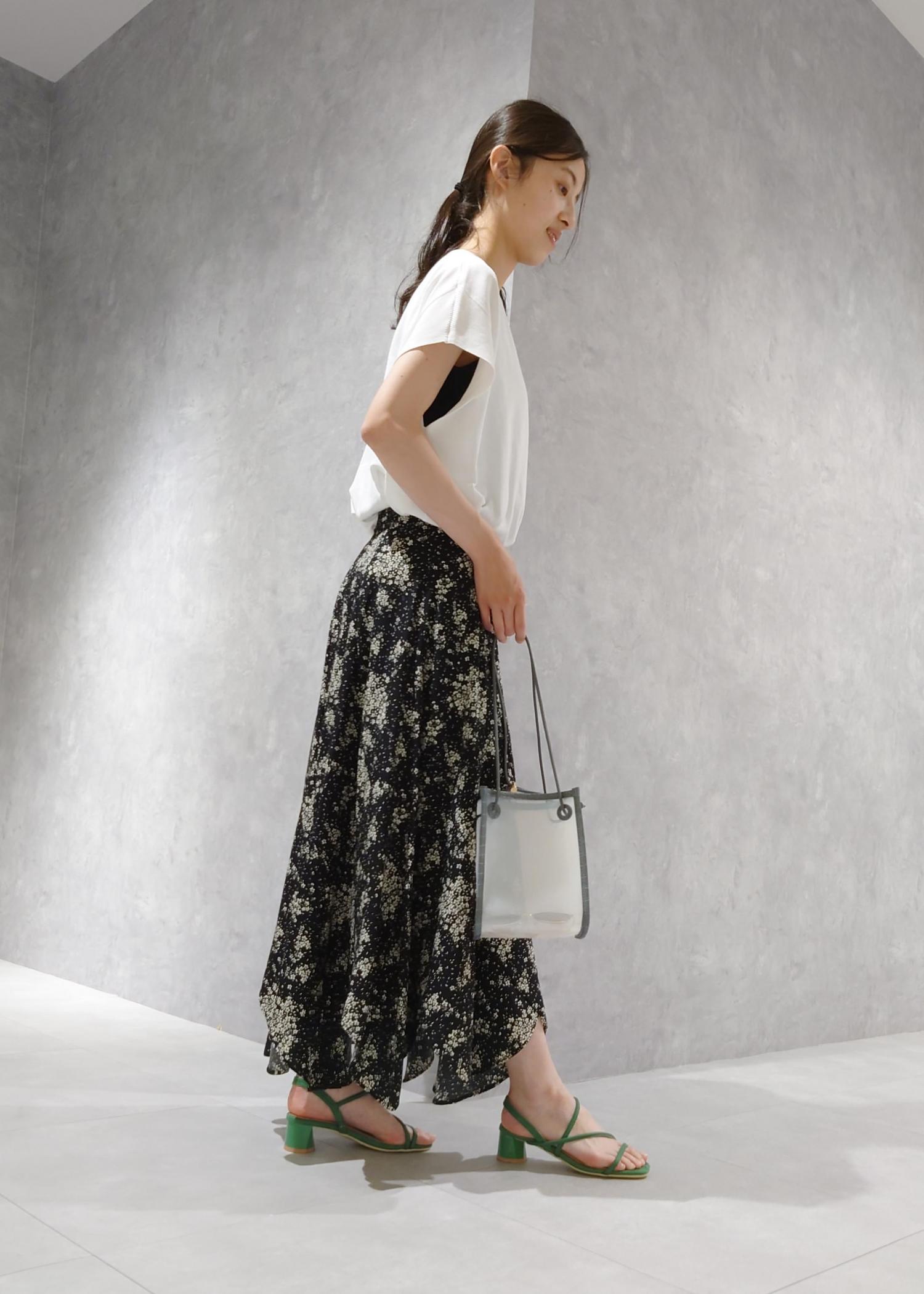 スカートが花柄なので他はシンプルに。カラーのサンダルを合わせてアクセントをつけてあげると、コーディネートにメリハリが出て夏らしくなります。