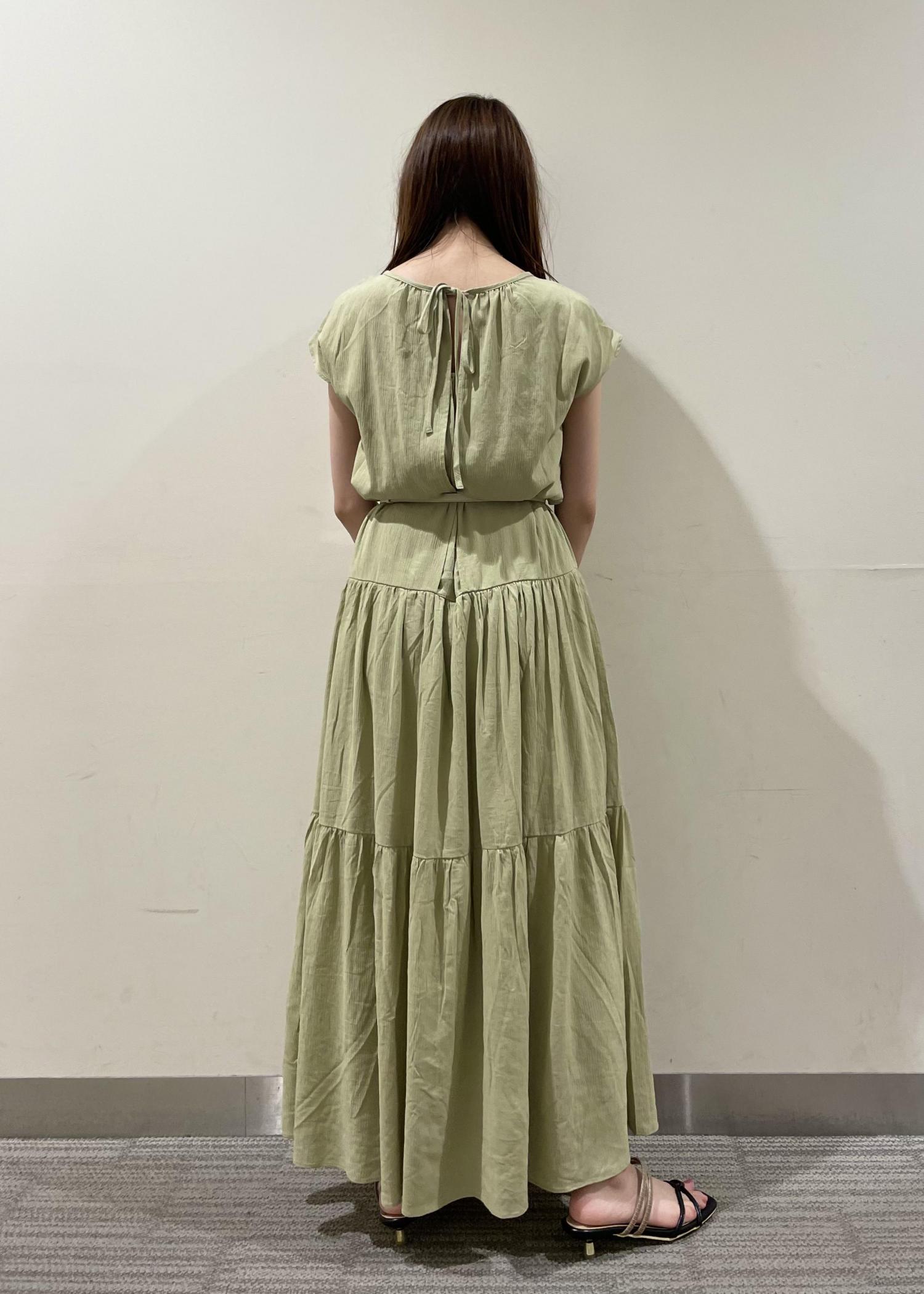 ロング丈のワンピースはベルトで着丈を調節すると、ウエストがマークされスタイルアップも叶います。 ワンピースとバッグのカラーを合わせて 涼しげな印象に。
