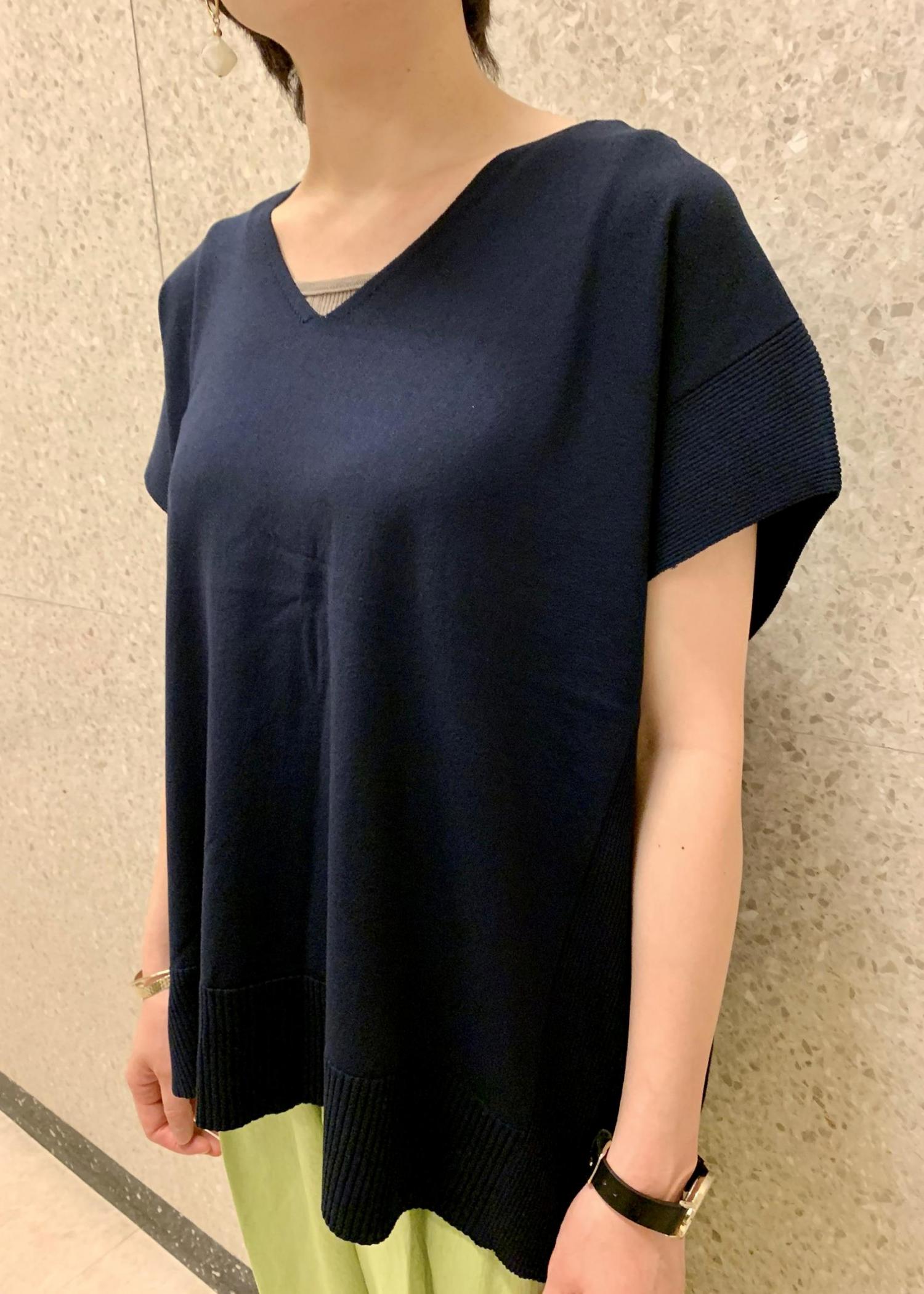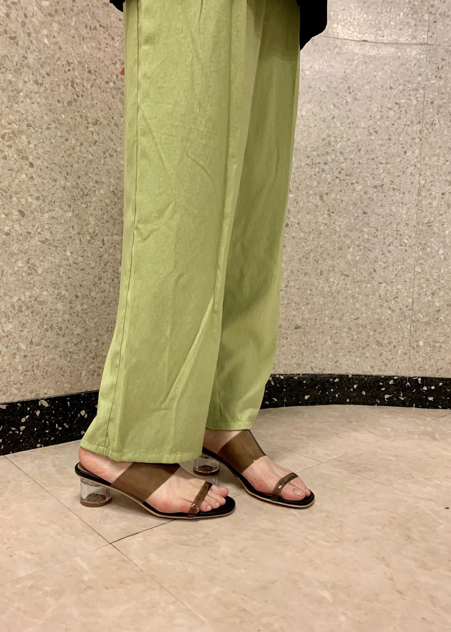 爽やかなグリーンカラーのパンツが主役の、30代でも挑戦しやすいシンプルなバランスのコーディネートです。 ややゆるっとしたシルエットなので、足元はクリア素材のサンダルにし、涼しげで軽やかな印象にしています。