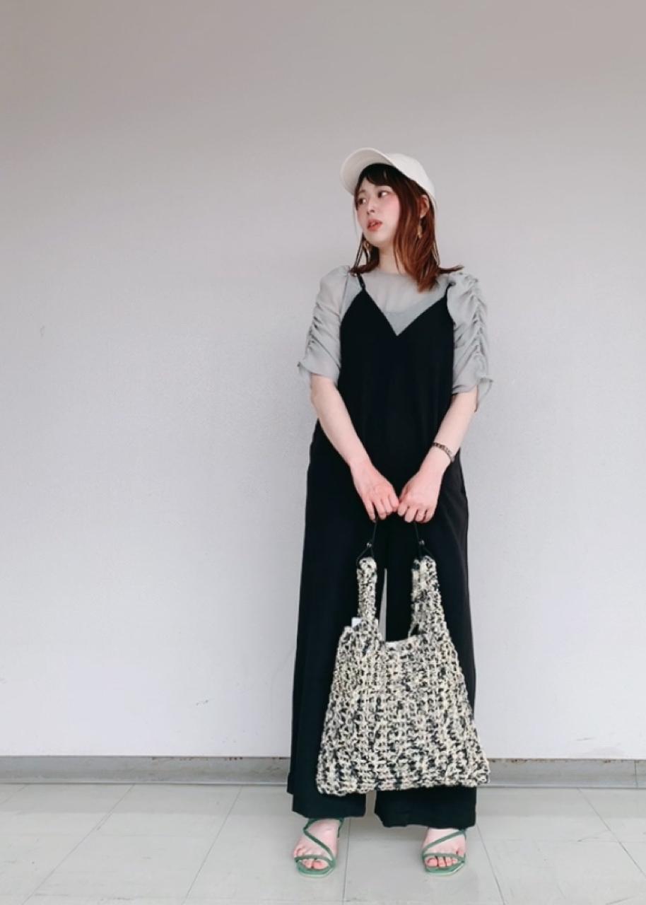 袖にボリューム感あるブラウスがトレンド感があり、ゆったりめに着れる夏ブラウスです。 オールインワンもゆったりとした作りでストレスなく着て頂けます。 可愛く、楽ちんに着れて、ちょっとしたお買い物やお散歩等におすすめのコーディネートです。