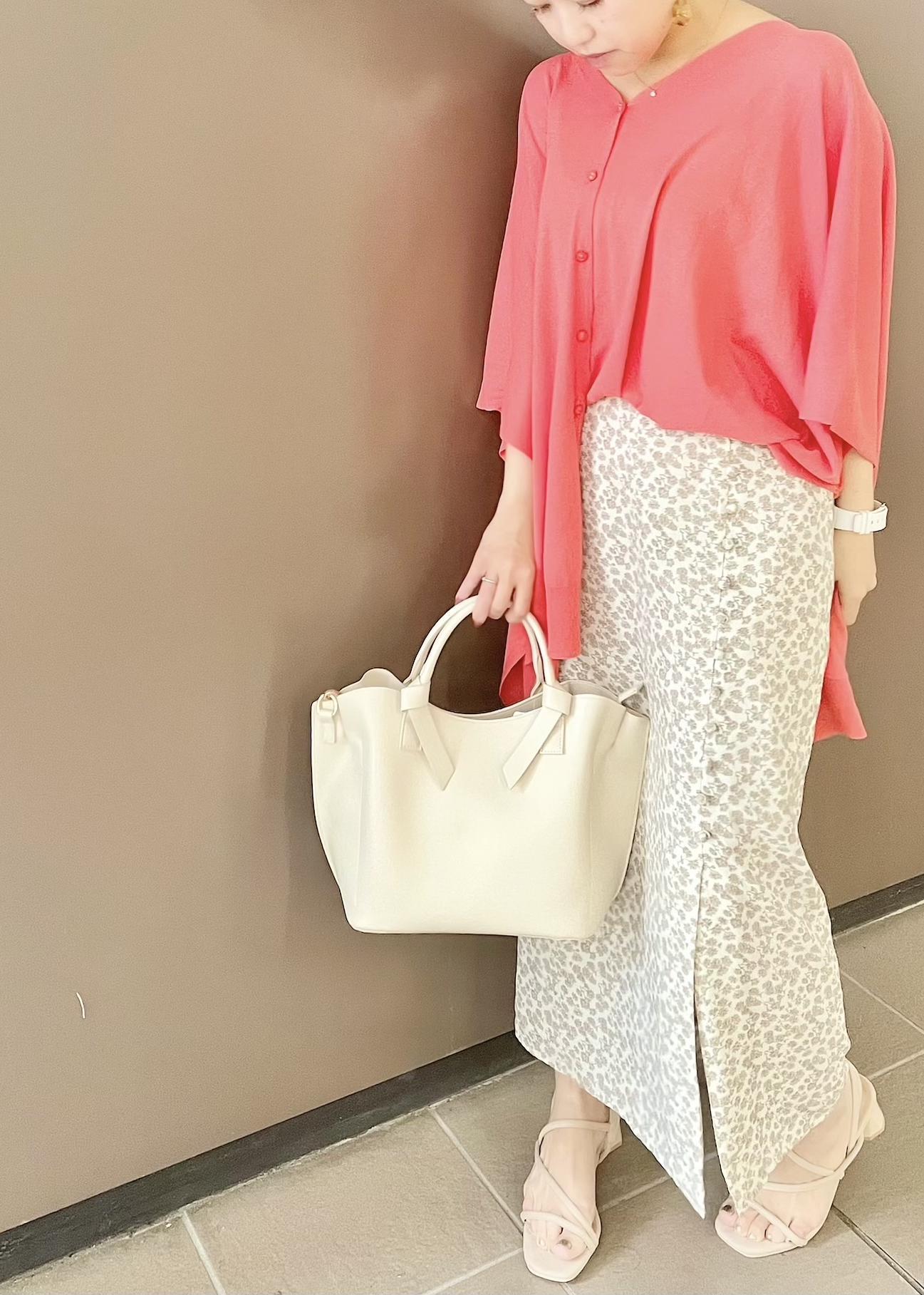 カラーカーディガンとIラインスカートで女性らしいシルエットでも存在感のあるコーディネートにしました。