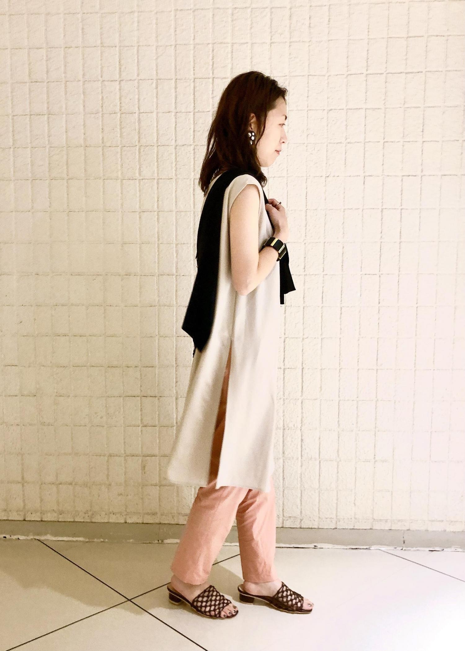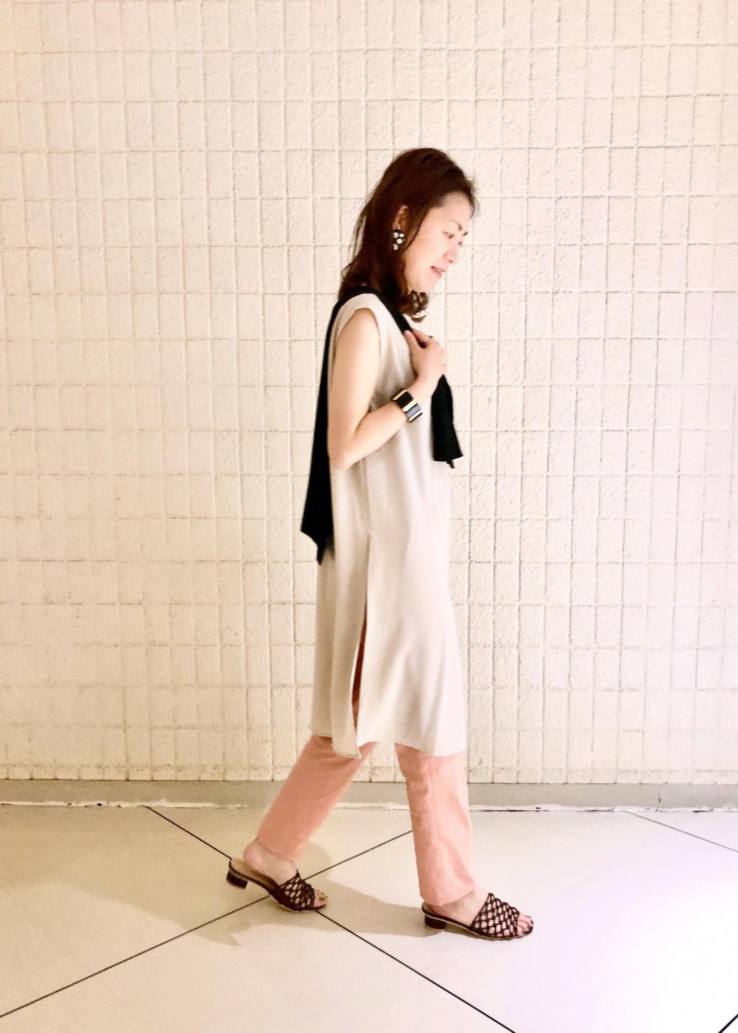 スリット入りチュニックを、カラーパンツで綺麗めカジュアルに合わせてみました。