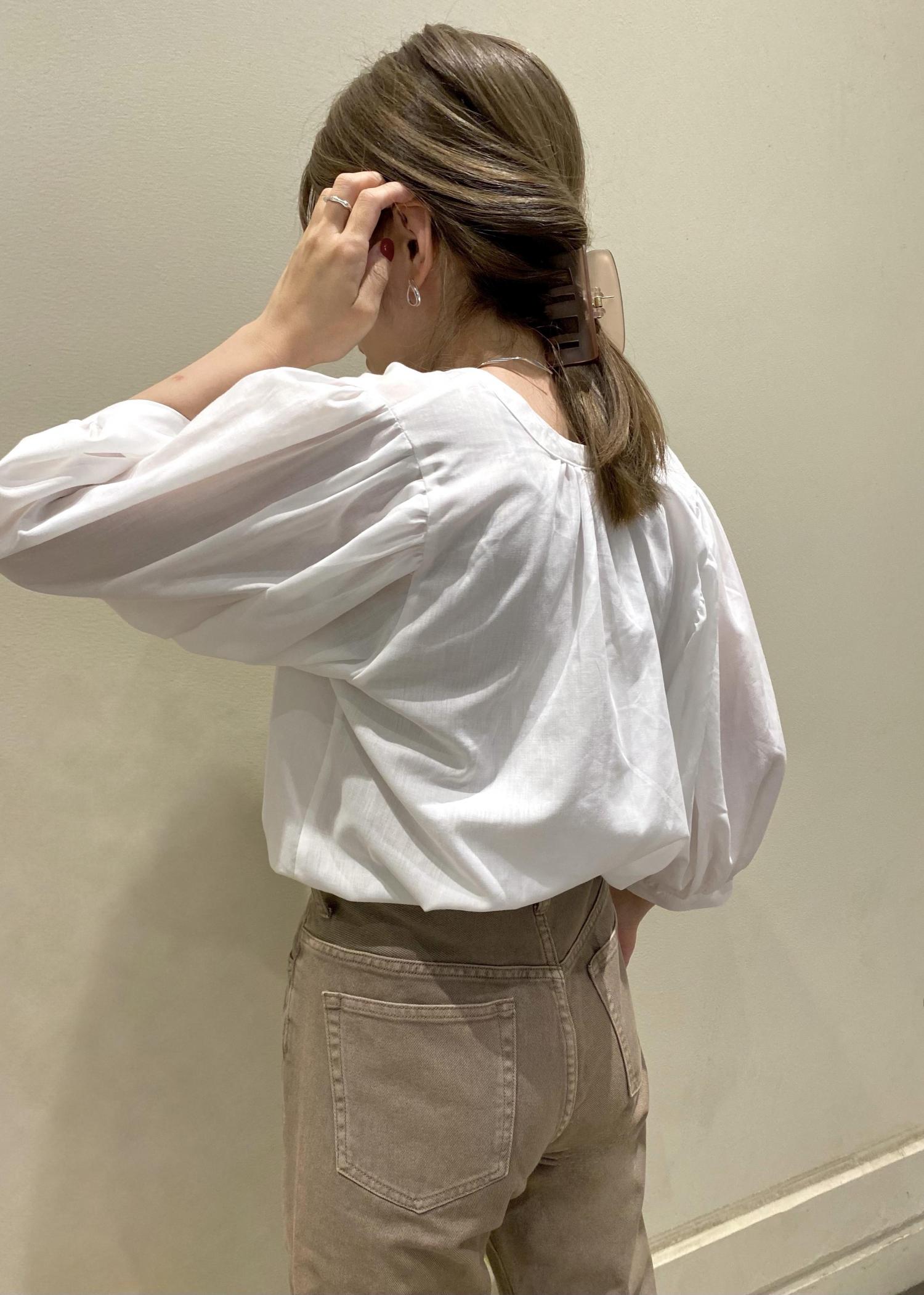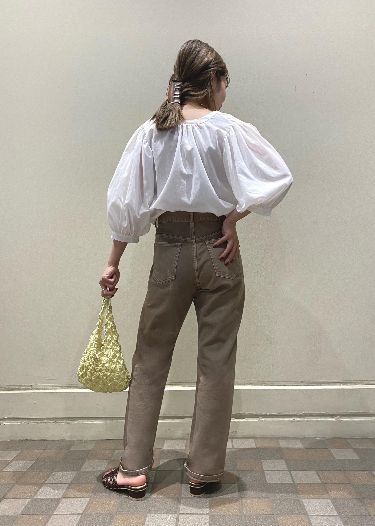 ブラウンのデニムを主役にコットンブラウスとコーディネートしてみました♡ ストレートデニムにパフスリープのブラウスを合わせることでフェミニンカジュアルコーデの完成です。 甘めが苦手な方はレースアップを後ろ側で着用頂けます