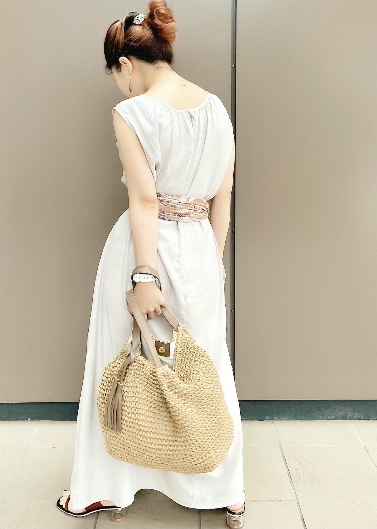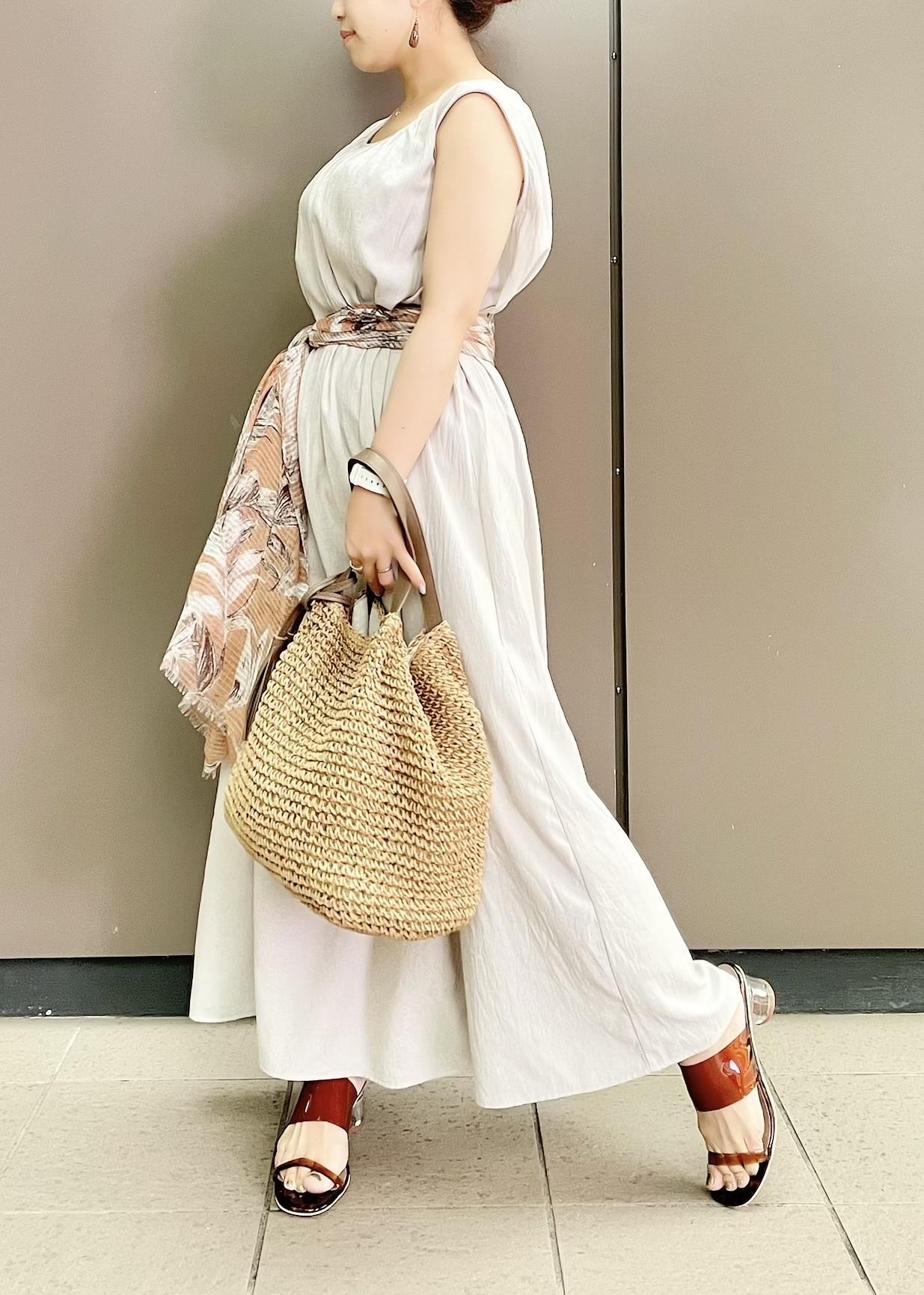 シンプルなワンピースにストールをベルトとして合わせてワンポイントアクセントをつけました☺︎ 軽いガーゼのような肌触りのワンピースなので夏のお出掛けにもお勧めです!! インナーワンピもセットになっているので透け感も気になりませんよ・:*+.