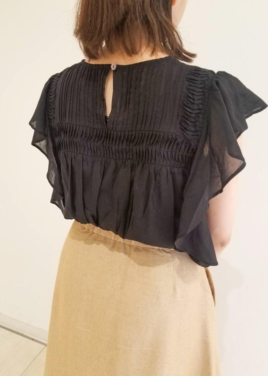 黒のブラウスとフリンジスカートを合わせ、甘すぎない夏らしいスタイリングにしました。