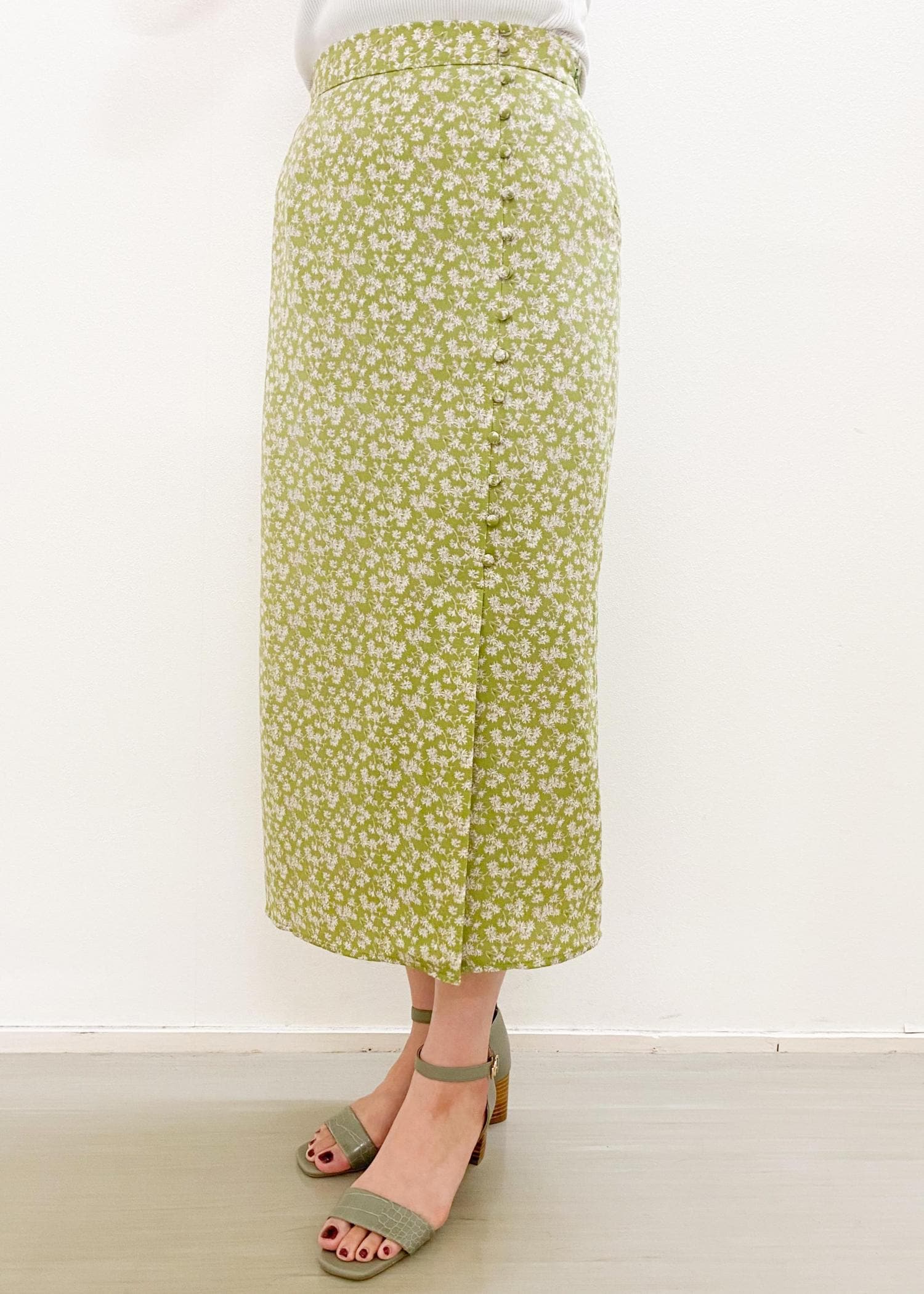 初夏を感じるグリーンカラーの小花柄スカートをポイントにしたコーディネートです。