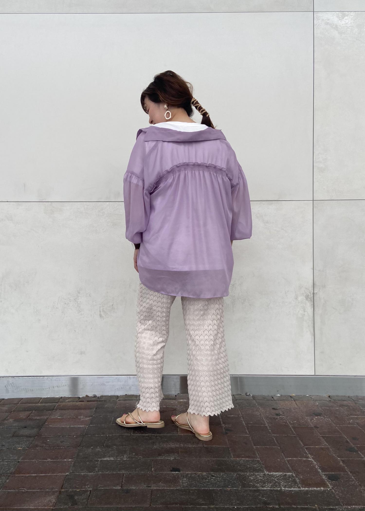 トレンドのシアーシャツに、ロゴTシャツを合わせたカジュアルコーデです。 レースのパンツを加えて、女性らしさとリラックス感を出しました。 足元はサンダル合わせで、スッキリ見せが叶うコーデに!