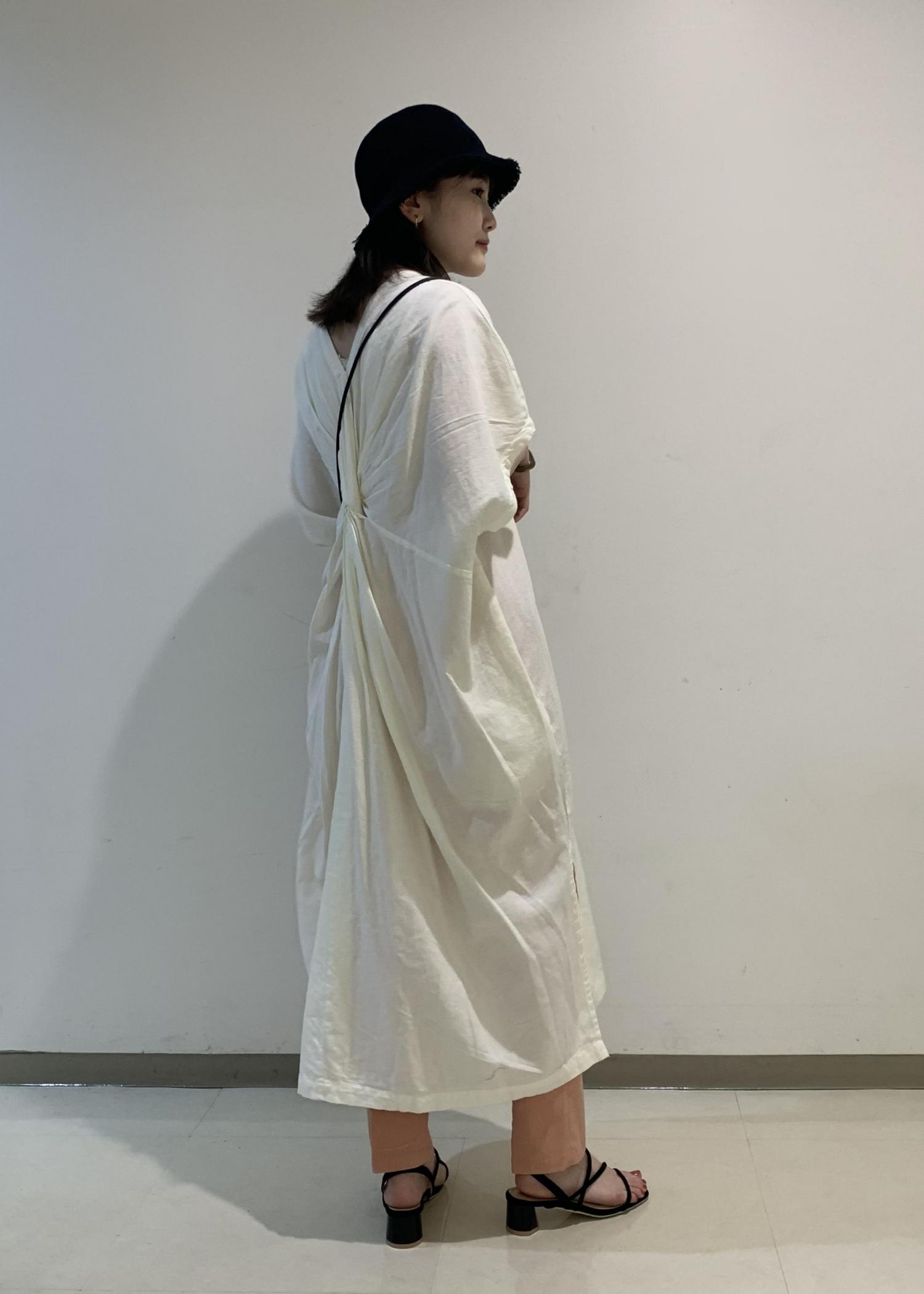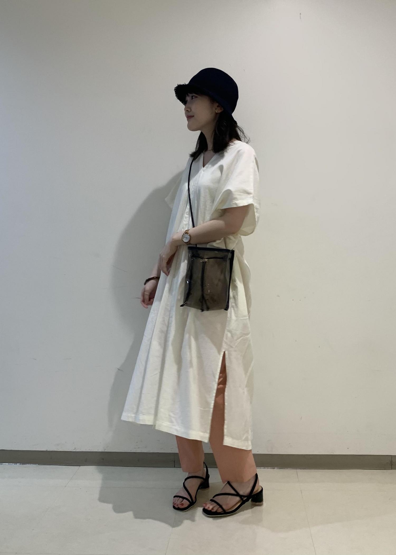 ワンピース、ボトムは柔らかい色で、小物は黒に統一させた甘辛ミックスコーデ。