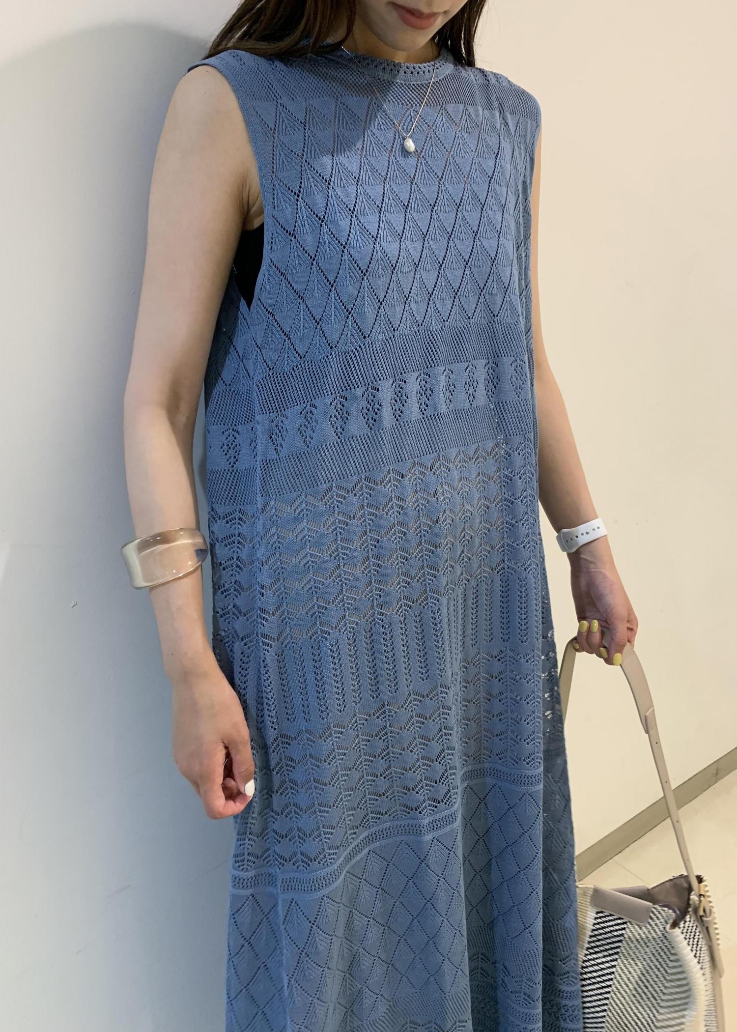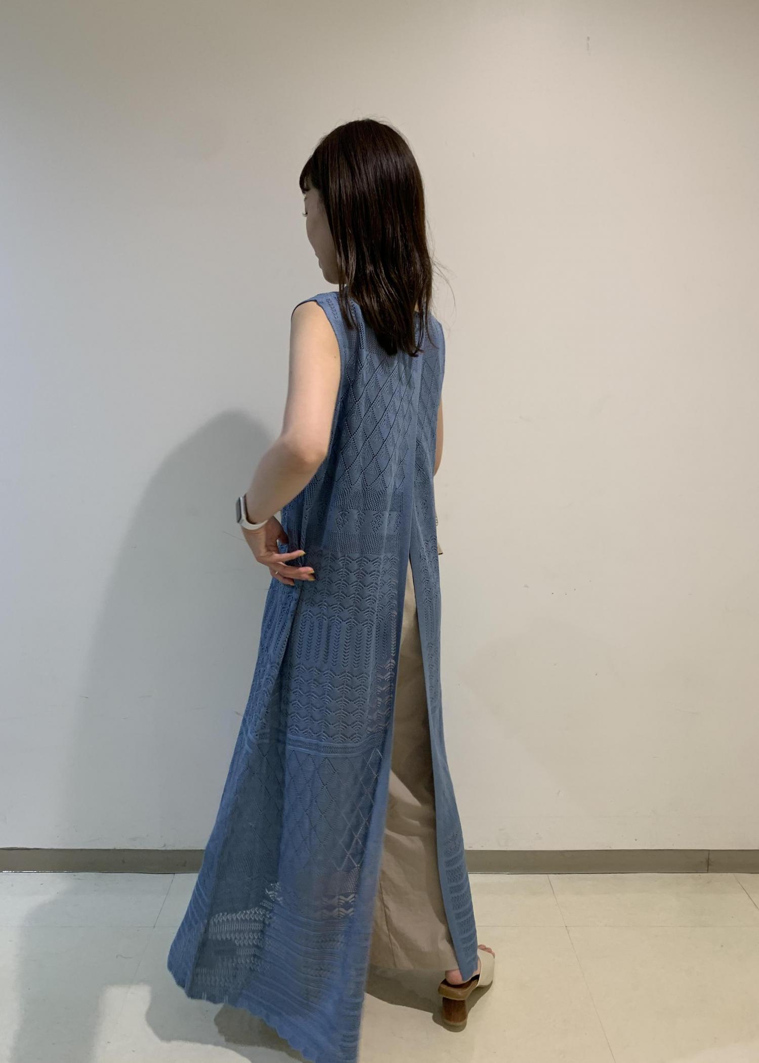透かし柄ニットワンピースのブルーが目を惹くコーディネート!後ろの大きいスリットがお洒落なデザインでバックスタイルがとても可愛く、レイヤードで色々な雰囲気のコーディネートに仕上がります!